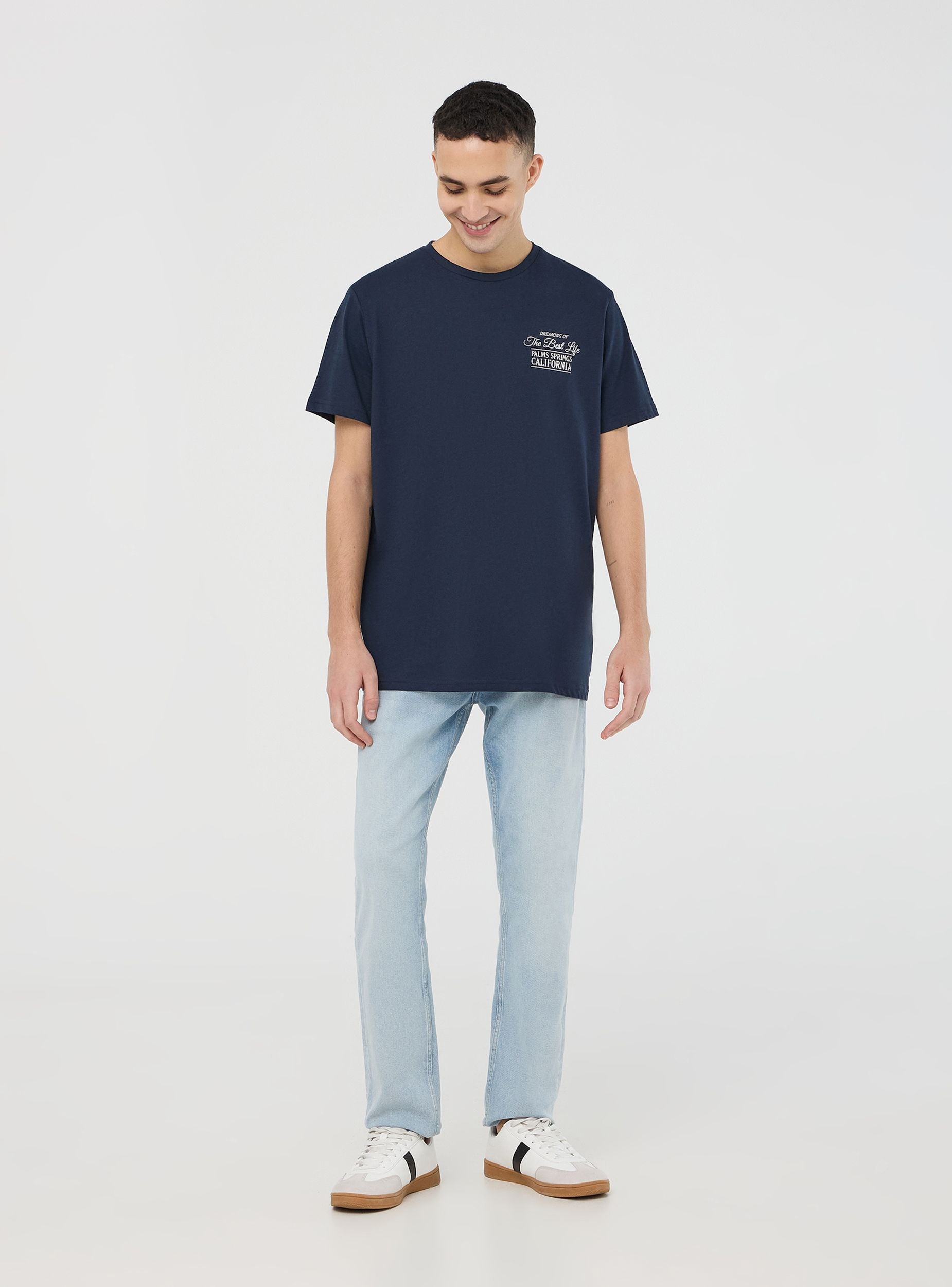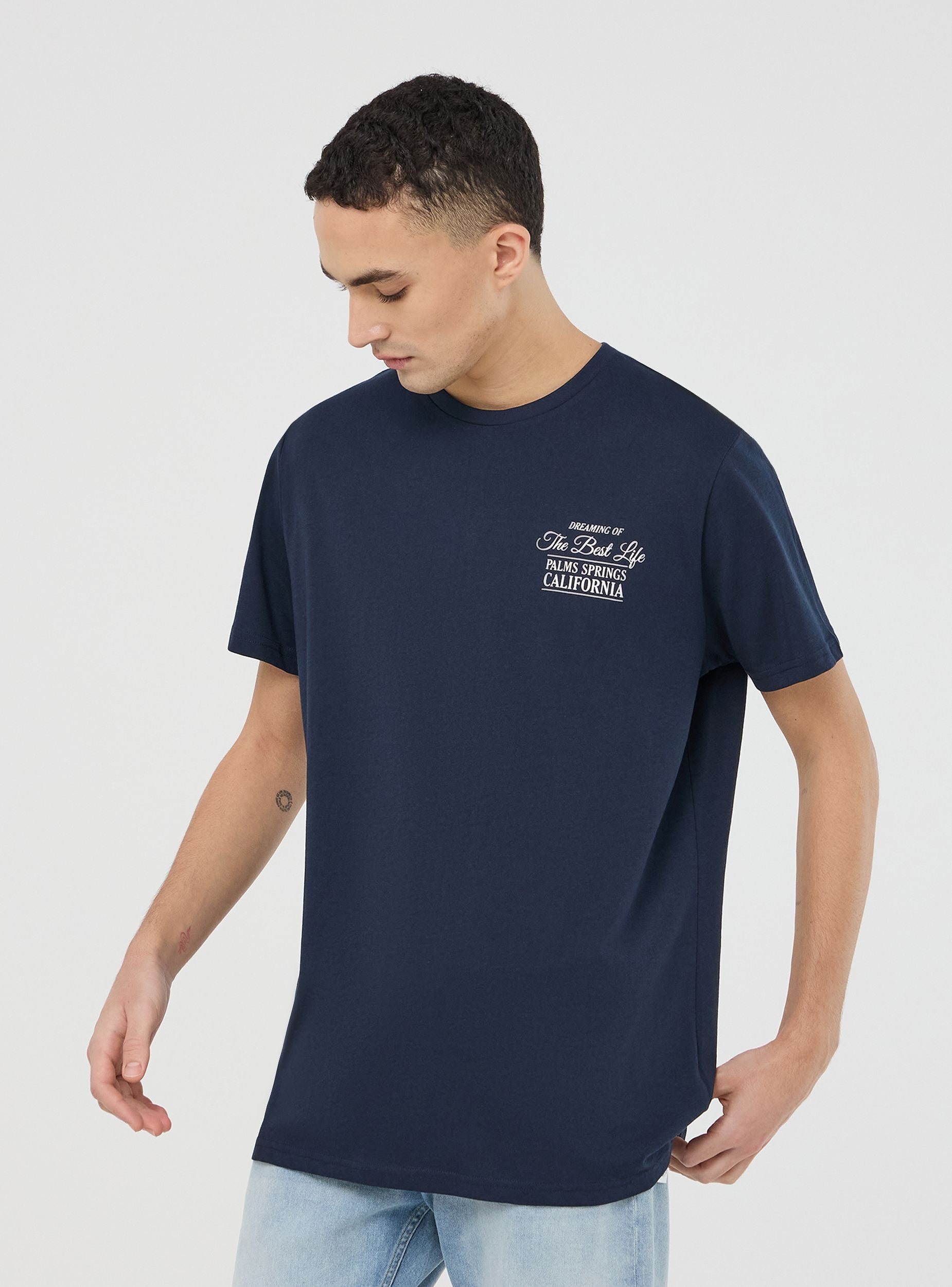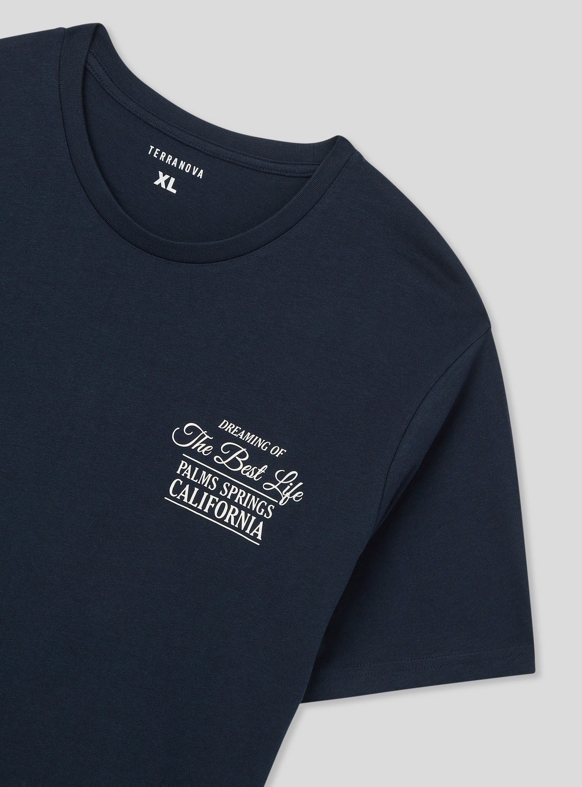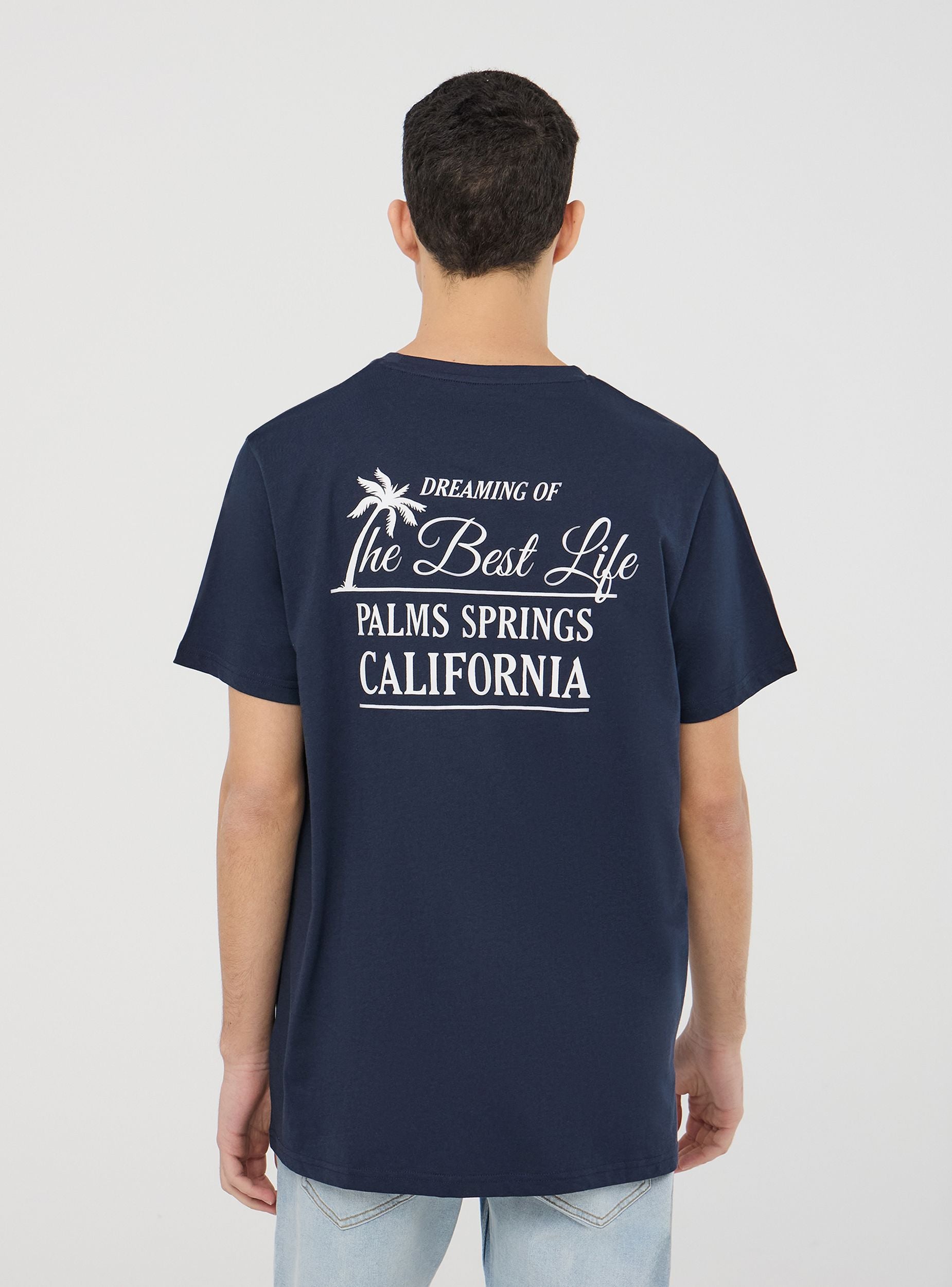 Maglietta da uomo perfetta per outfit casual. Caratterizzata da una scritta decorativa fronte e retro accompagnata da un motivo di palme, dona un tocco fresco e rilassato. Le maniche corte e il girocollo completano un design pratico e versatile, ideale per un look casual e confortevole.