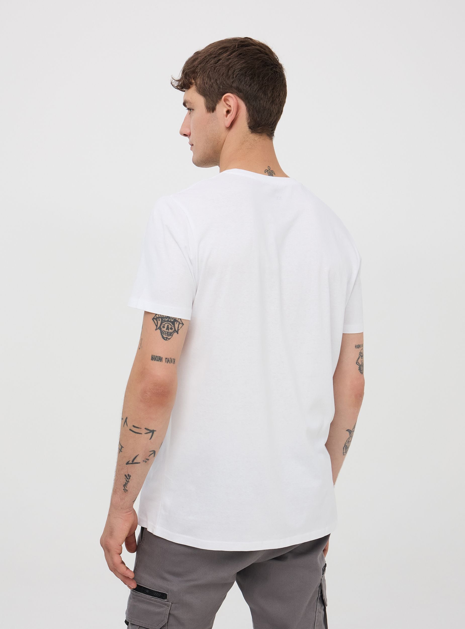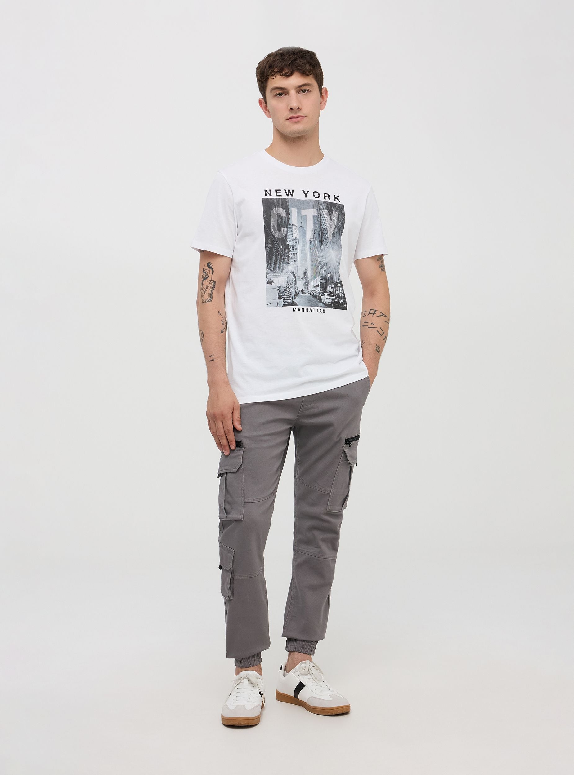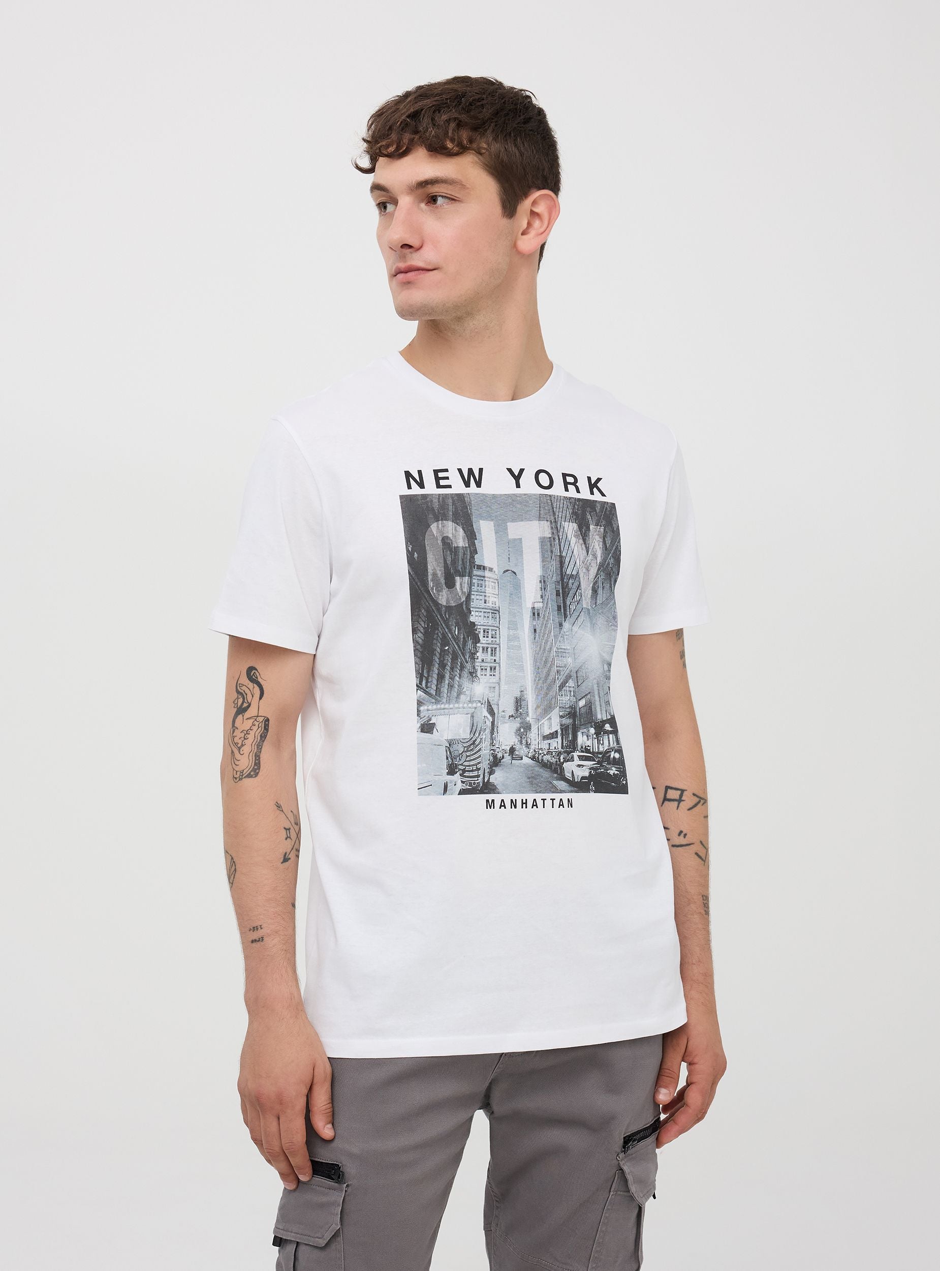 Maglietta da uomo in jersey di cotone con stampa fotografia di New York frontale. Modello girocollo con maniche corte. Vestibilità regular.