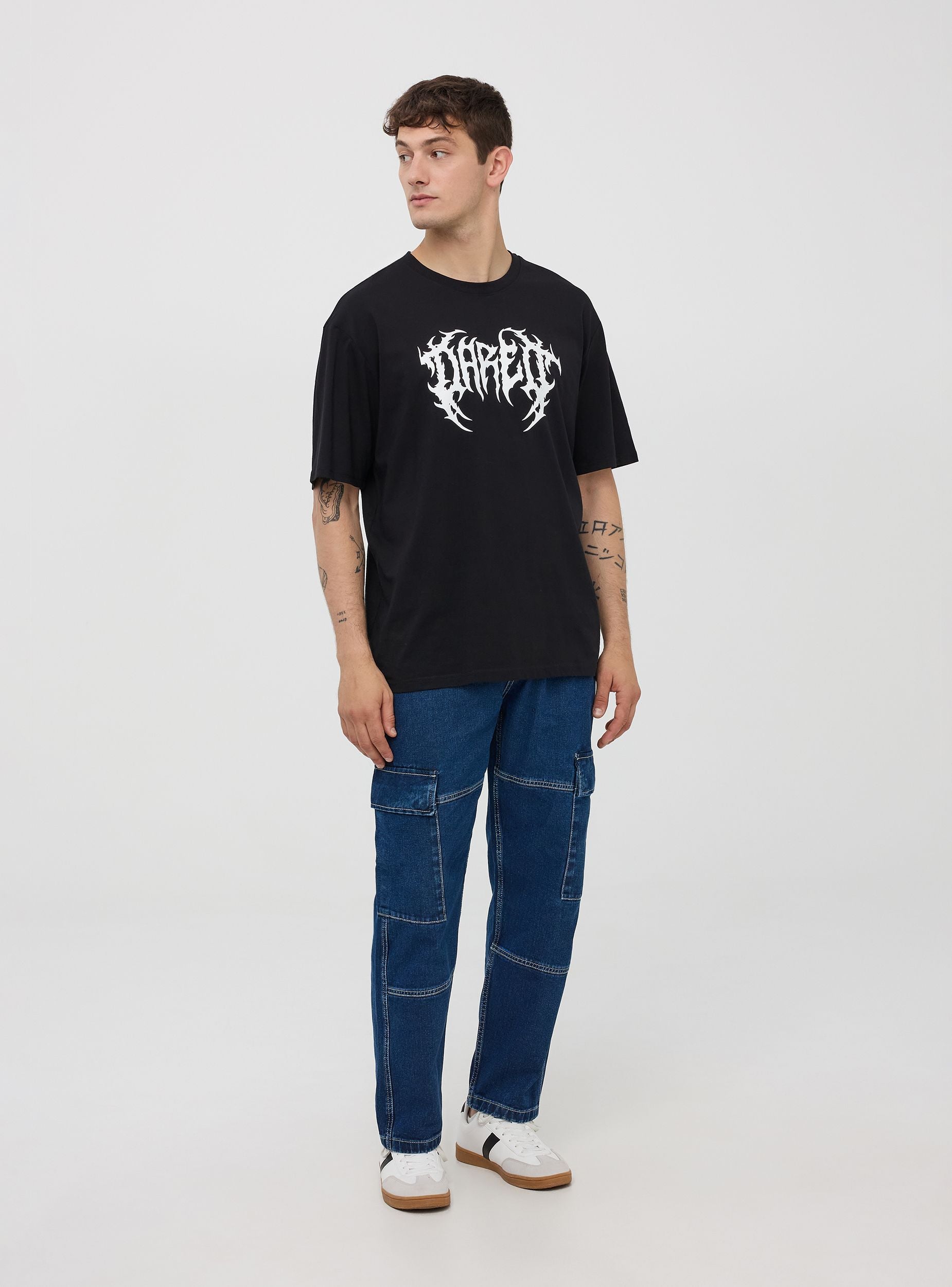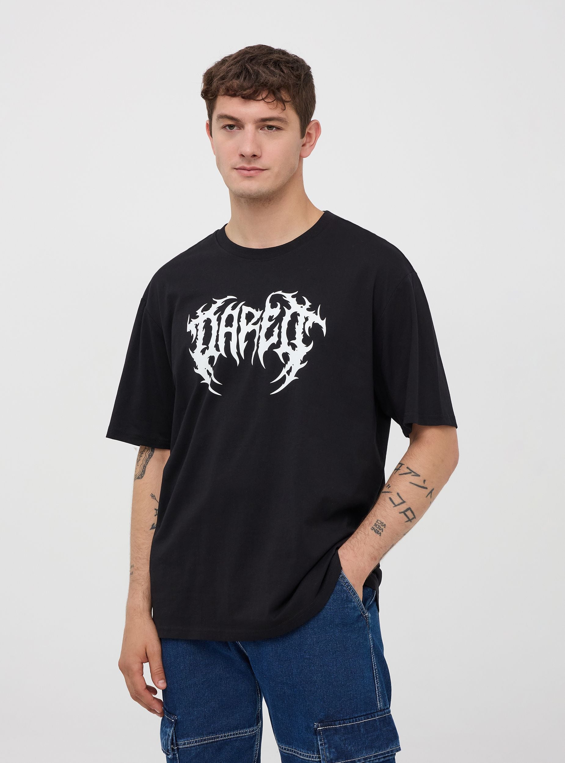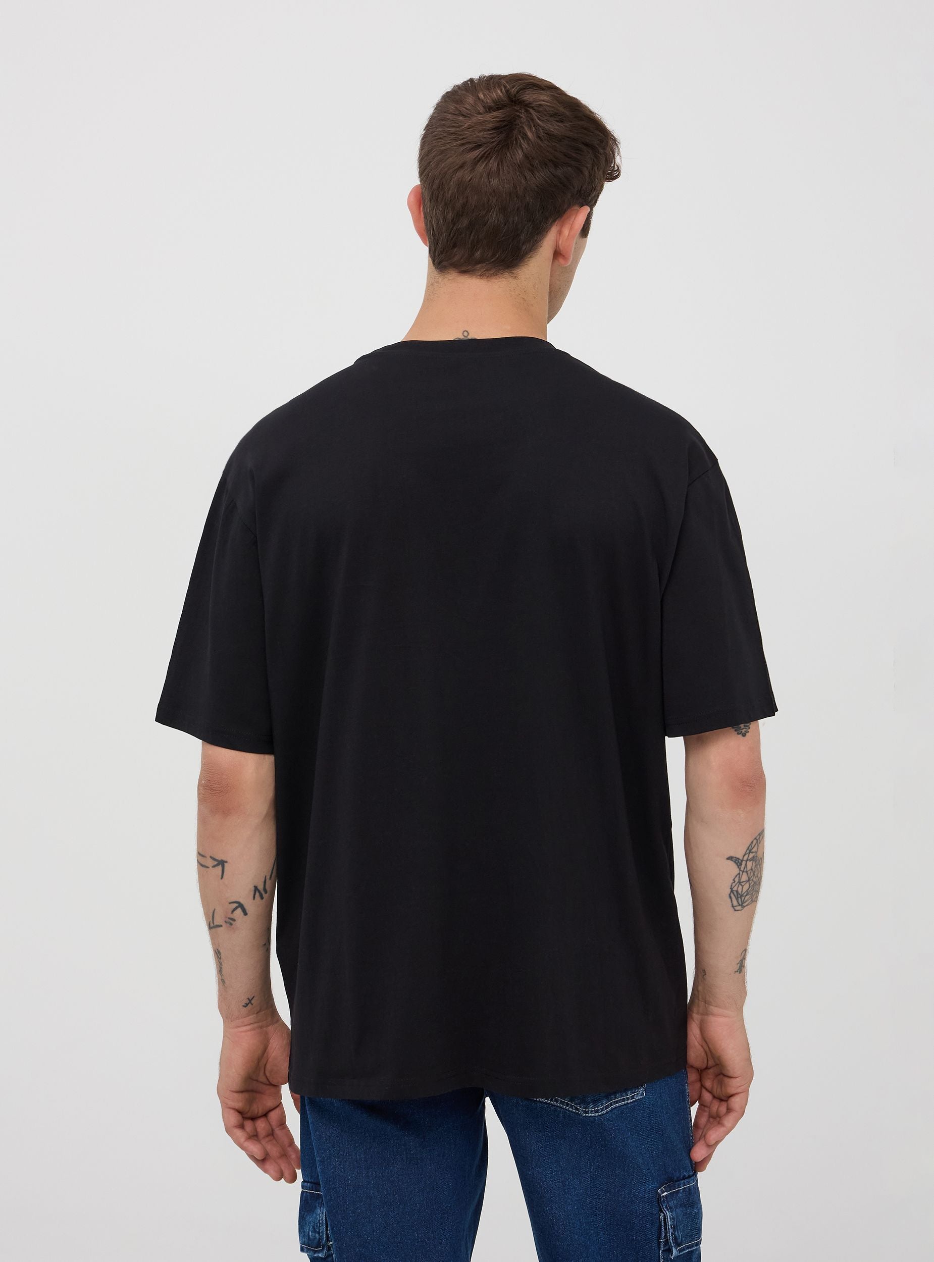 Maglietta da uomo in jersey di cotone con stampa tribale frontale. Modello girocollo con maniche corte. Vestibilità oversize.Dettagli