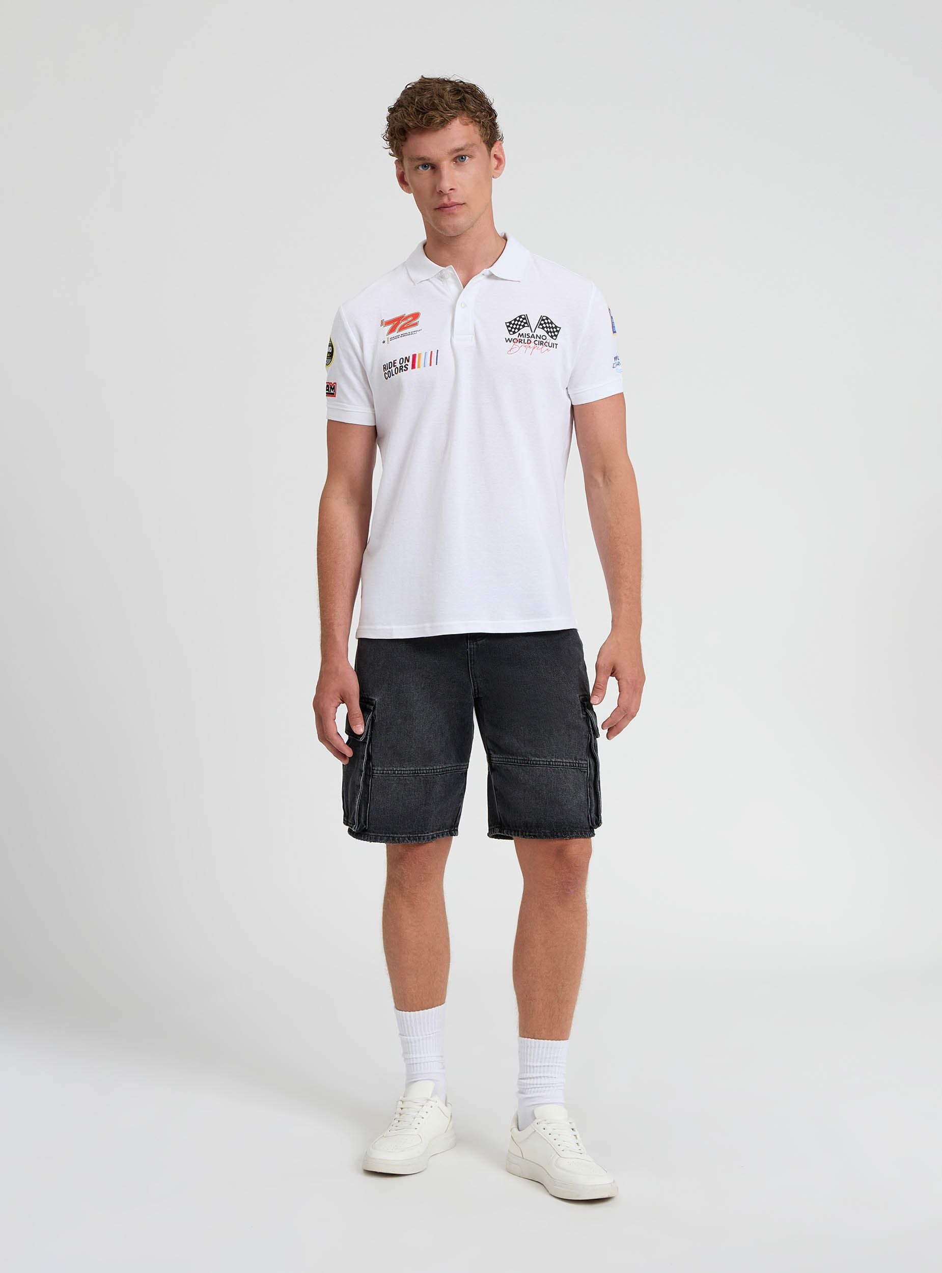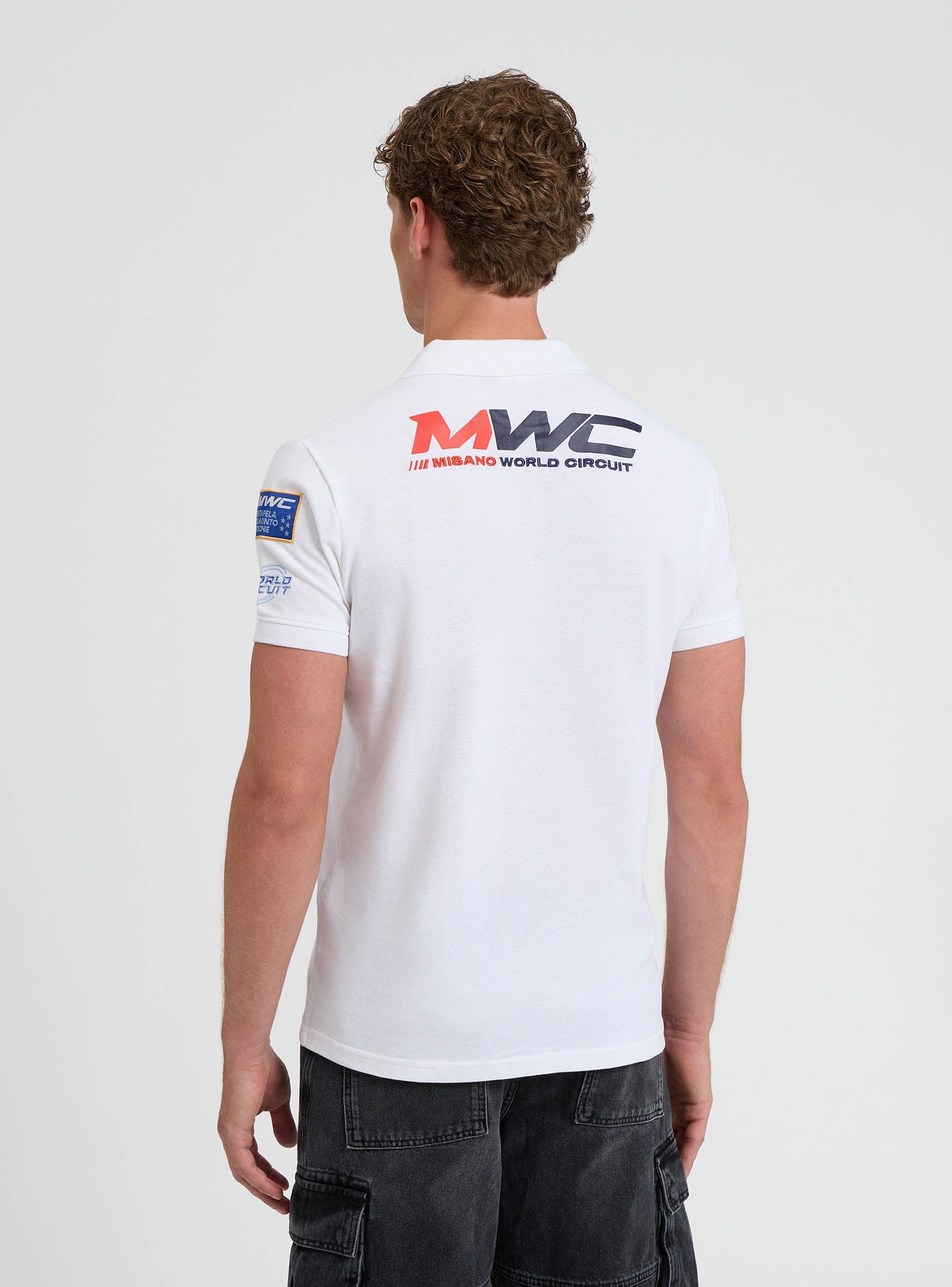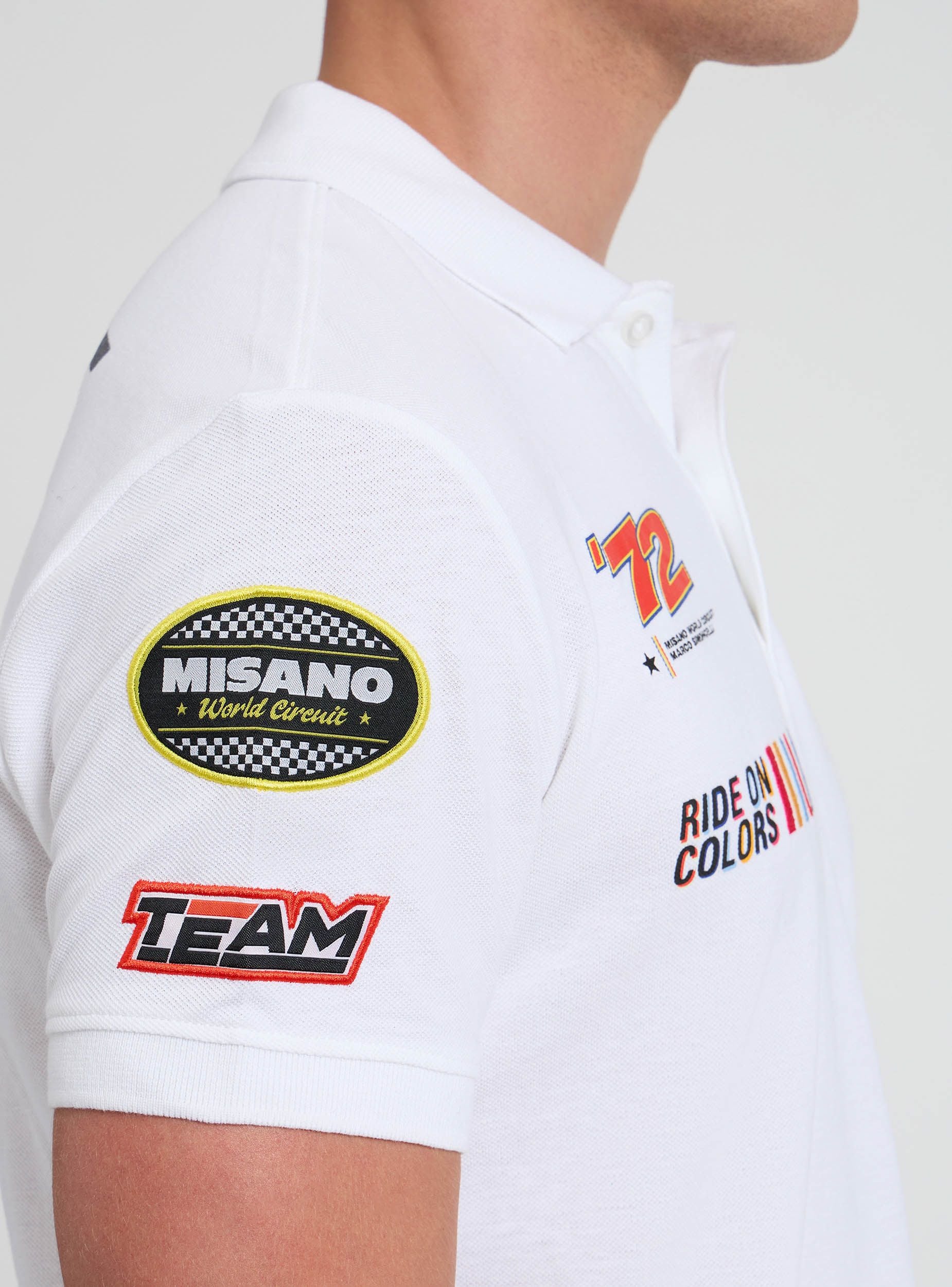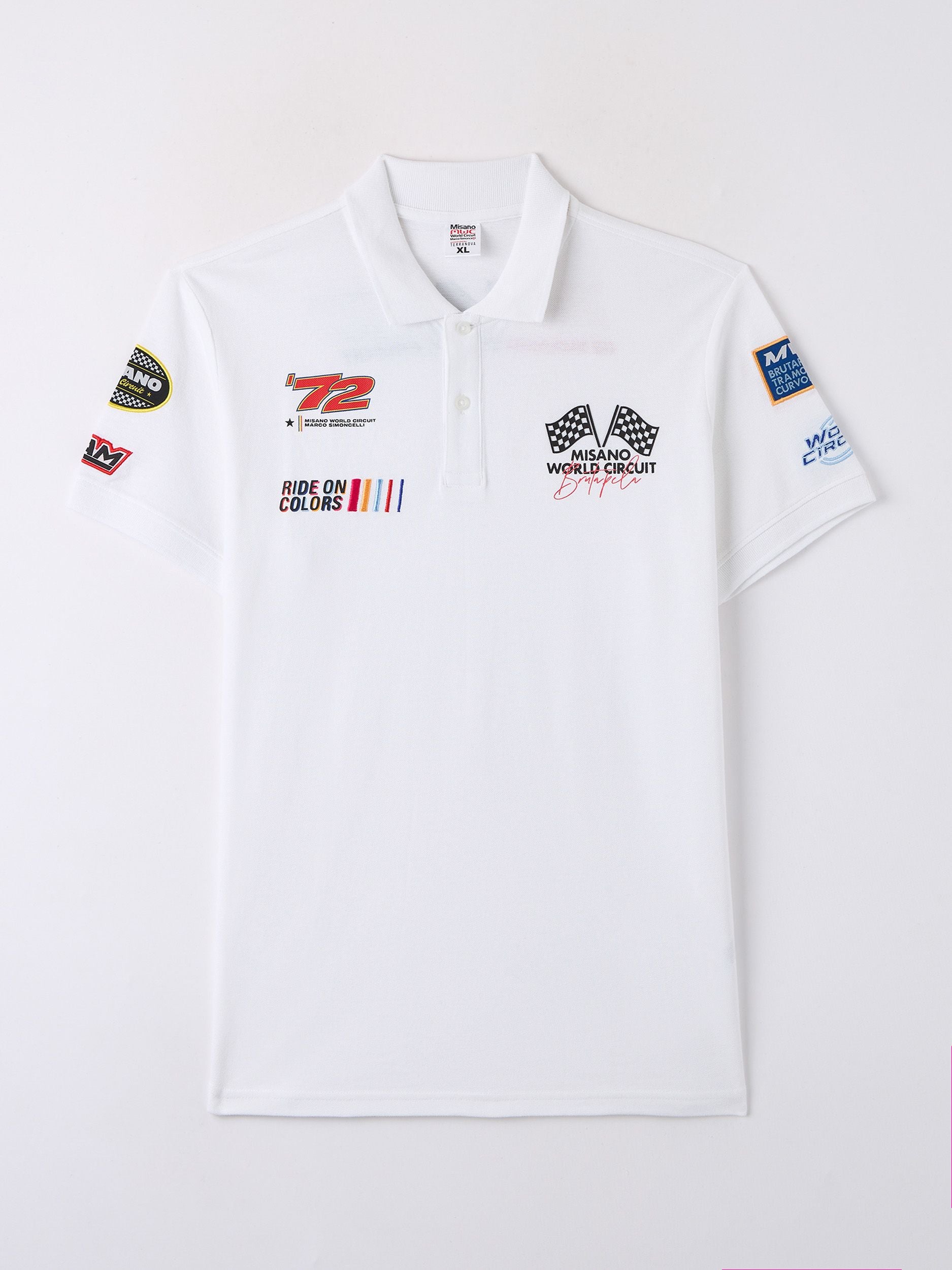 Maglietta da uomo modello polo, caratterizzata da un design con scritte e patch che richiamano il Misano World Circuit. La vestibilità è regular, assicurando comfort e uno stile sportivo e distintivo. Ideale per chi ama il mondo delle corse e desidera un capo casual ma ricco di dettagli che esprimono la passione per il motorsport. Adatta per essere indossata sia durante eventi sportivi che nel tempo libero, per un look dinamico e alla moda.