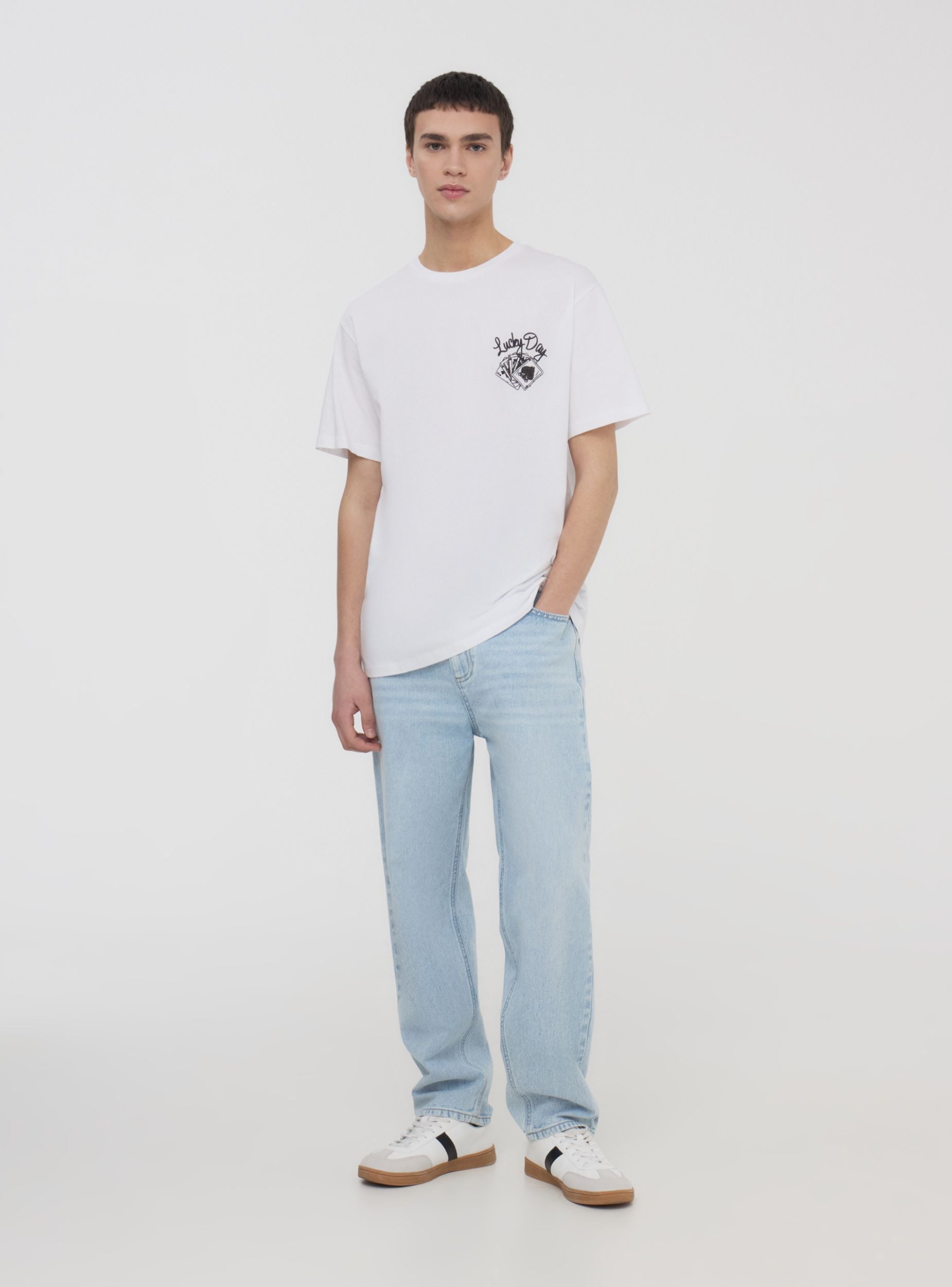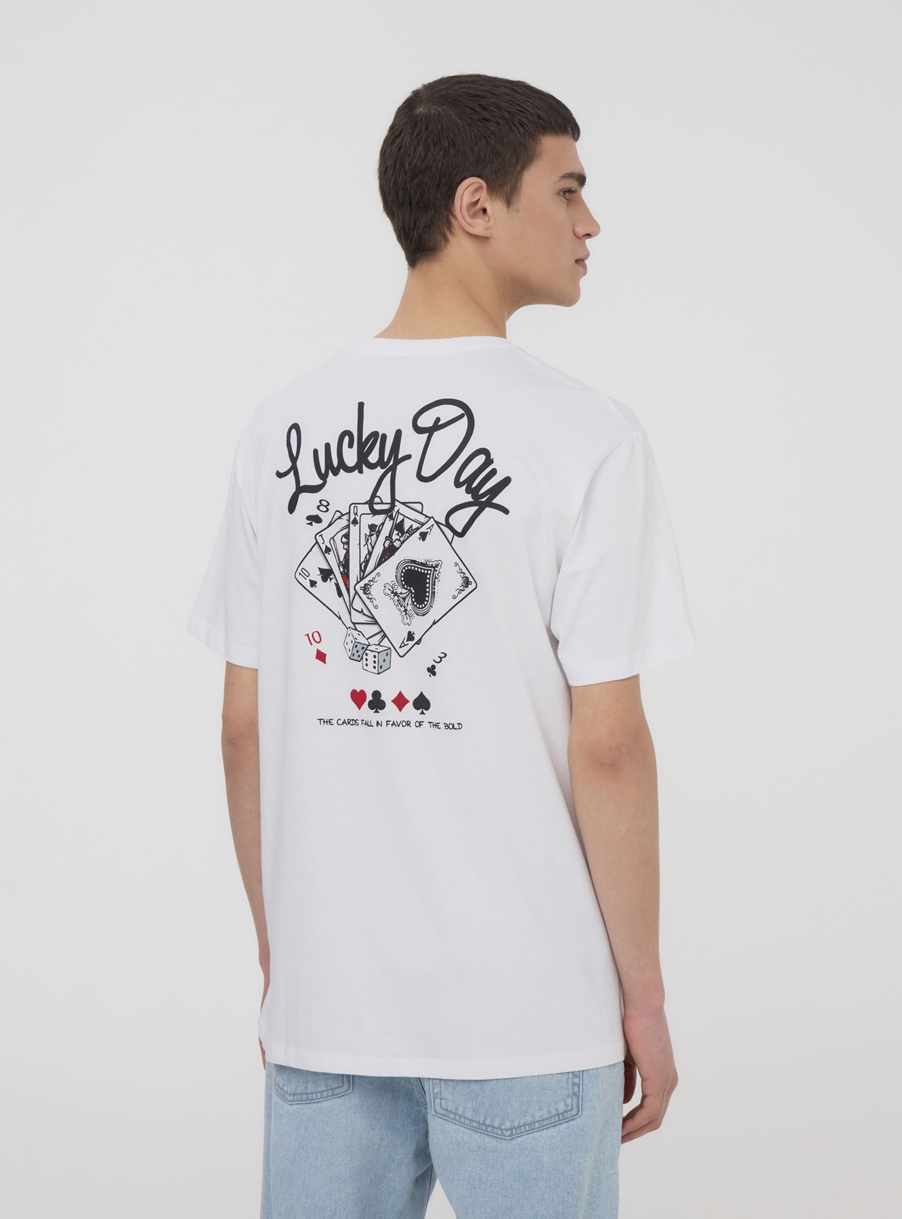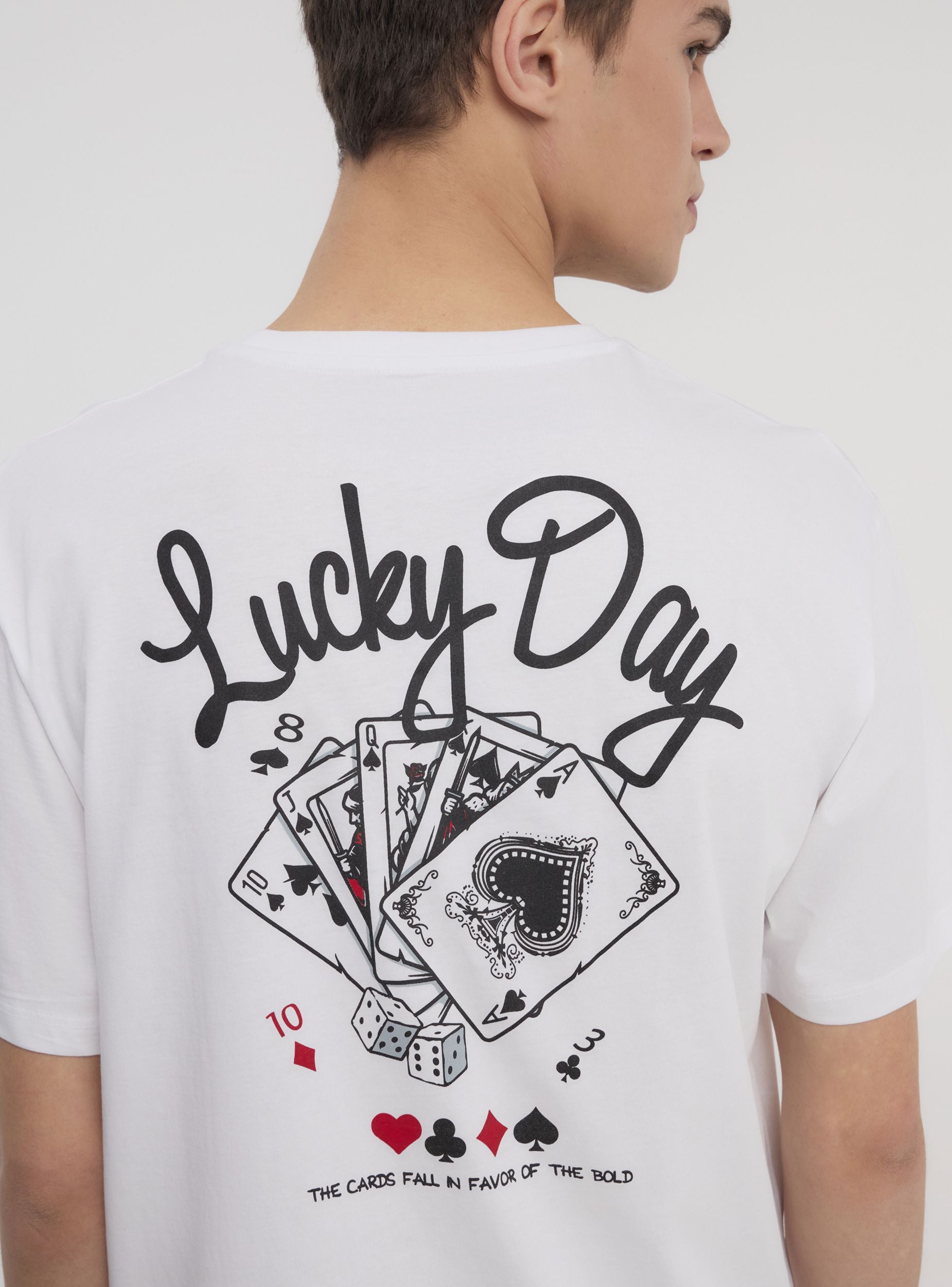Maglietta da uomo con maniche corte e girocollo, perfetta per chi ama uno stile rilassato e dal carattere deciso. Il design relaxed assicura comfort e libertà di movimento, mentre la stampa a tema carte da gioco, discreta sul davanti e più grande sul retro, dona un tocco originale e grintoso. Ideale per outfit casual con jeans o joggers, si adatta a momenti di svago, serate con amici o look streetwear di tendenza.