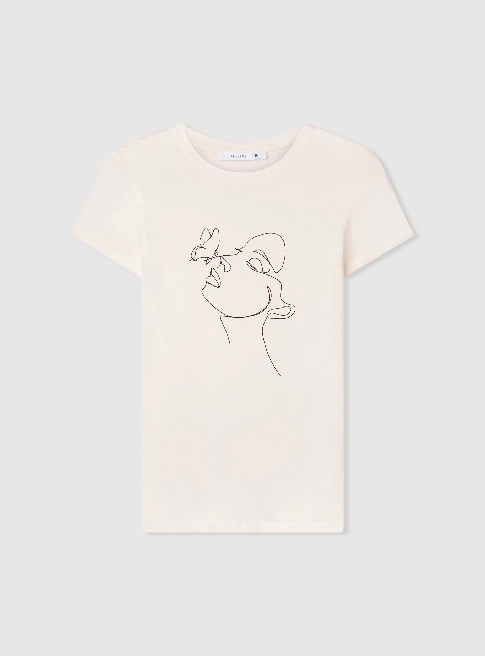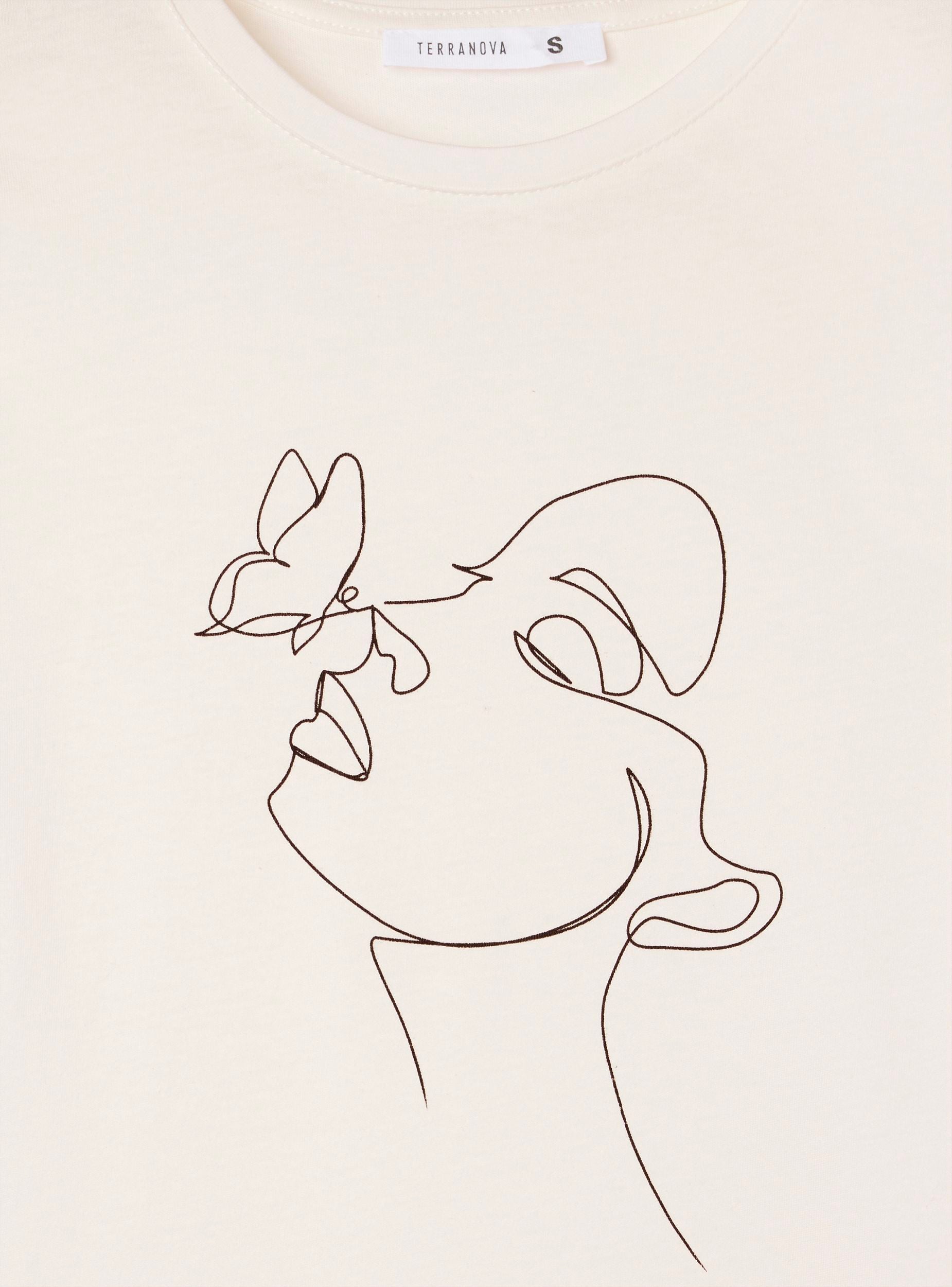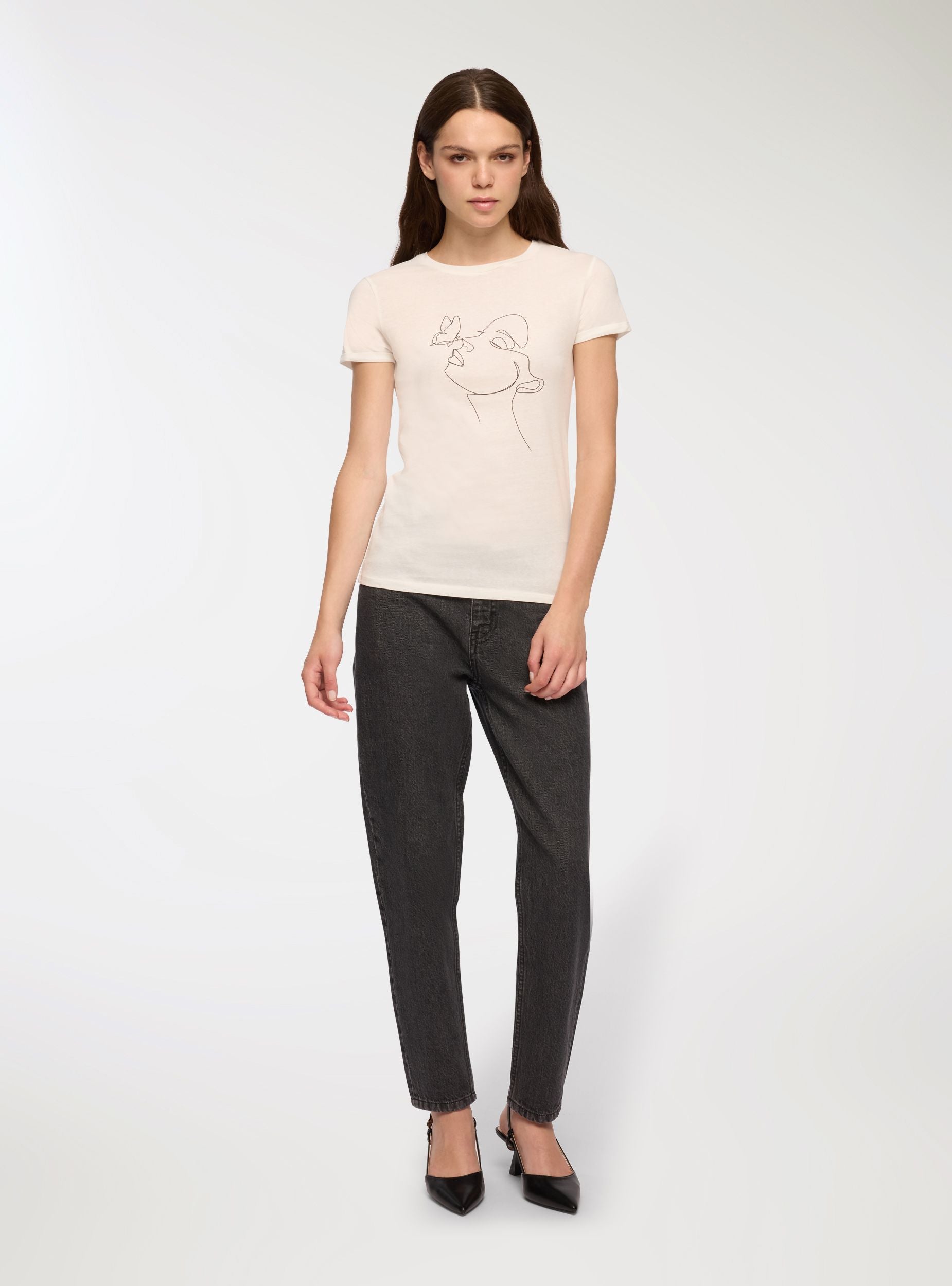Maglietta da donna a maniche corte, ideale per un look casual e moderno. Perfetta per essere abbinata a jeans o pantaloni sportivi, questa maglietta si distingue per il suo design con stampa di un viso stilizzato che aggiunge un tocco di originalità. La vestibilità slim valorizza la silhouette, rendendola adatta per diverse occasioni, dal tempo libero alle uscite informali. Un capo versatile e di tendenza.