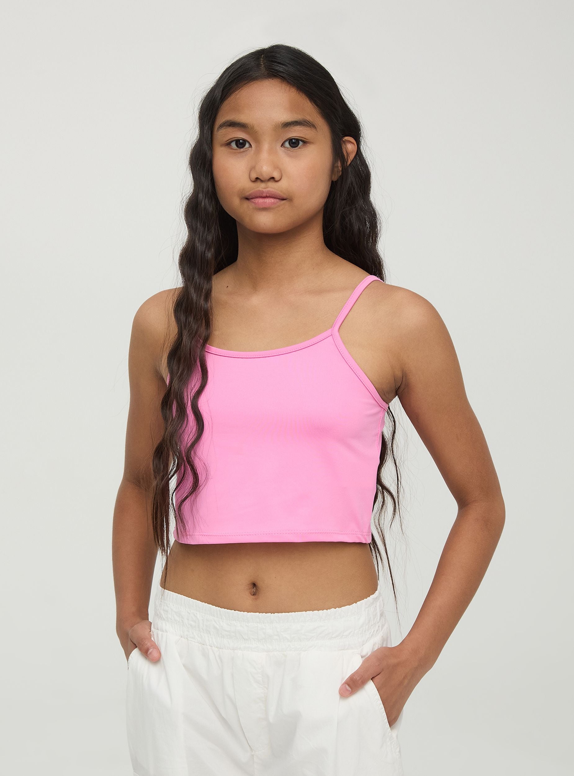Canotta da bambina con spalline sottili, tessuto elasticizzato a tinta unita. Vestibilità crop.
