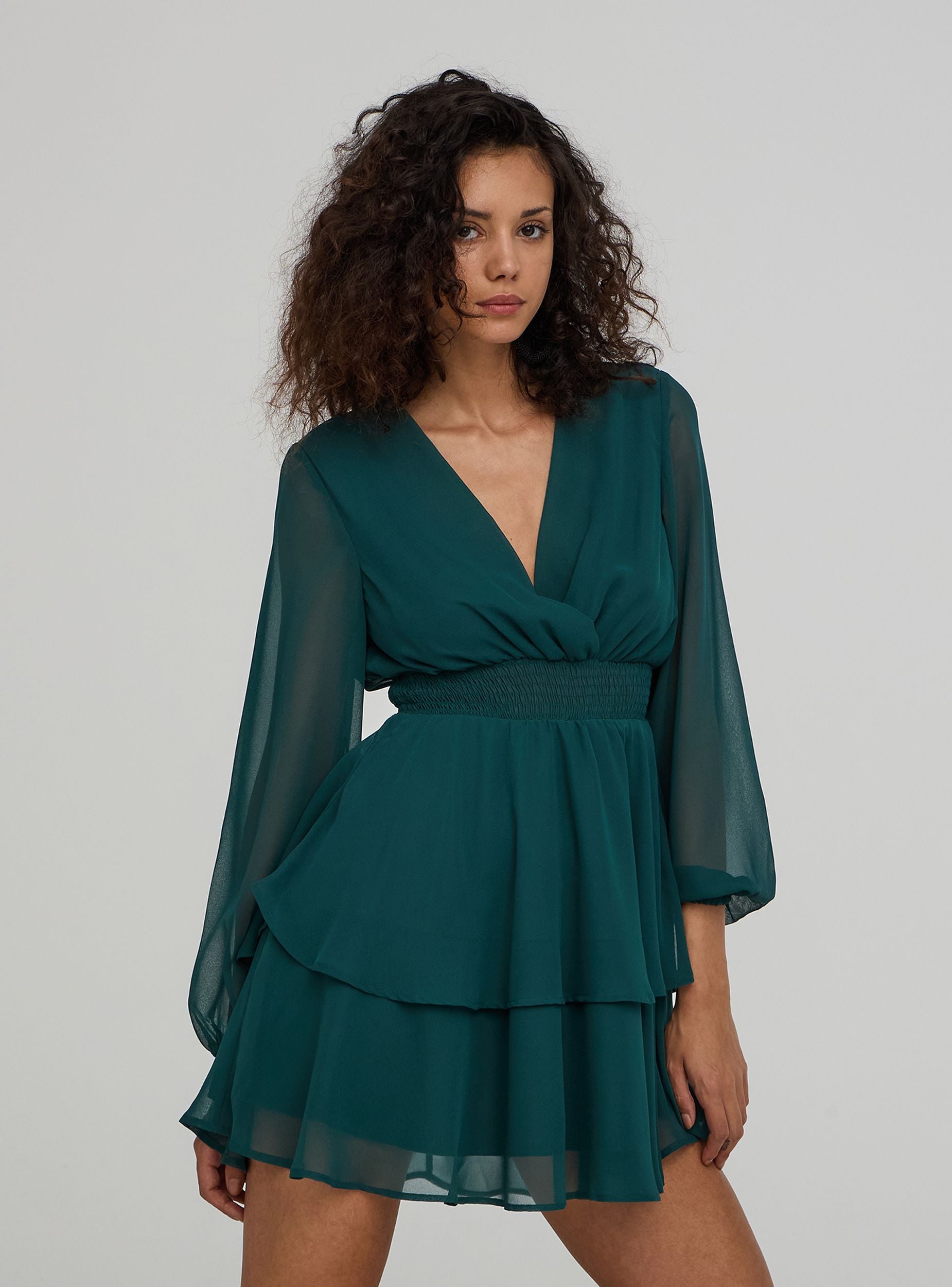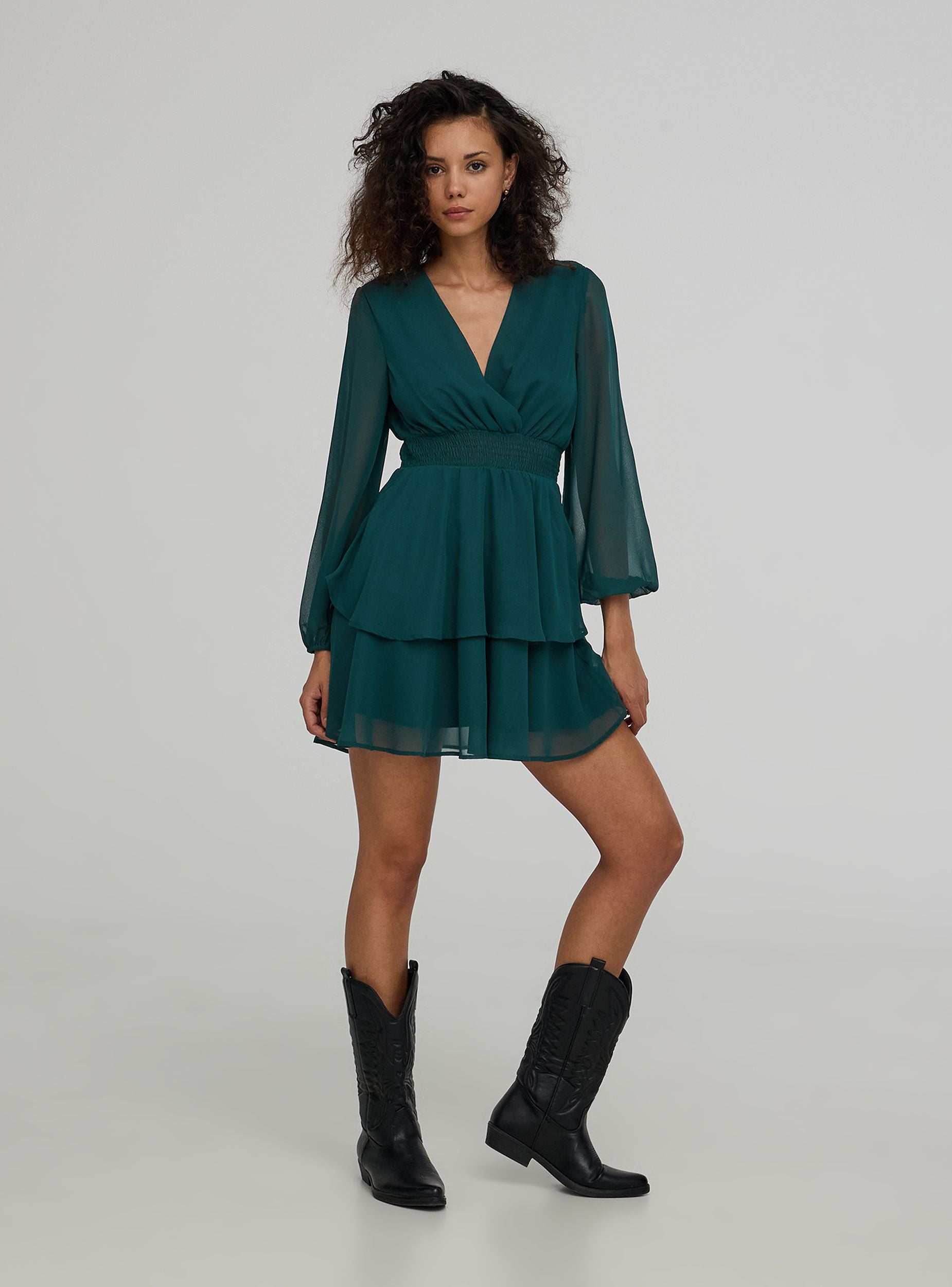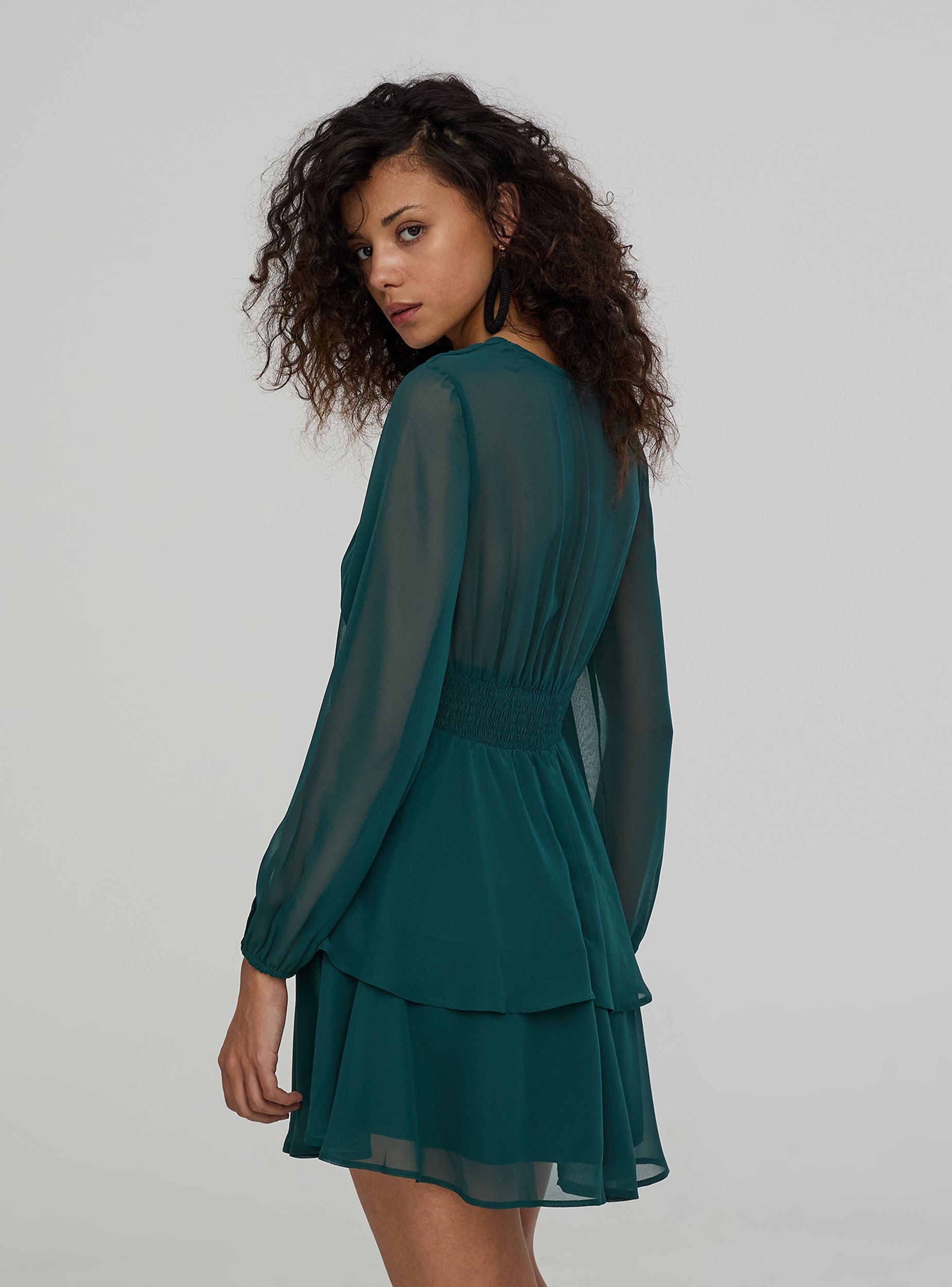Abito da donna con scollo a V incrociato, maniche lunghe trasparenti e vita elasticizzata con dettaglio in punto smock. La gonna è leggermente svasata con un orlo a balza che dona movimento e leggerezza al capo. Perfetto per una serata elegante o un'uscita informale, questo vestito combina comfort e stile per un look femminile e sofisticato.