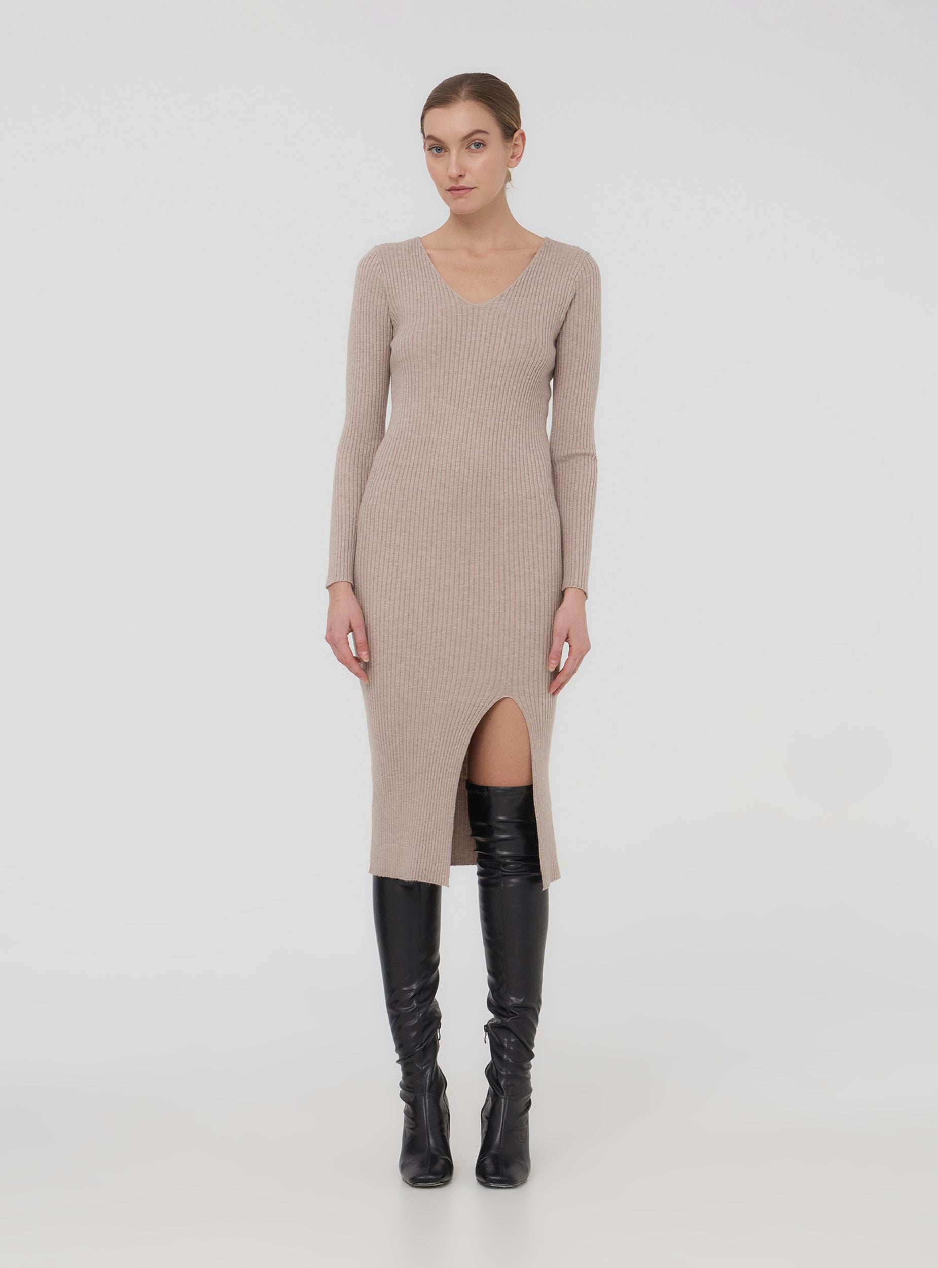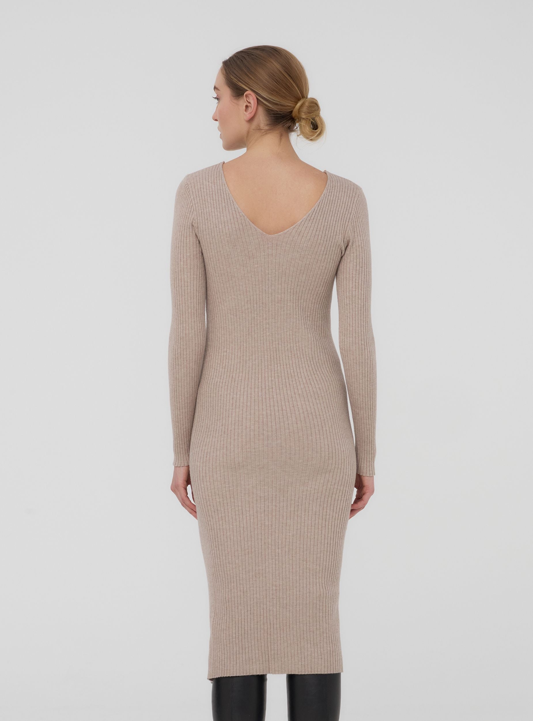 Abito da donna dalla linea lunga e avvolgente, realizzato in un design a tinta unita con lavorazione a costine che enfatizza la silhouette. Le maniche lunghe lo rendono ideale per le giornate più fresche, mentre lo spacco dona un tocco di femminilità e movimento. Il profondo scollo aggiunge eleganza, rendendolo perfetto per occasioni speciali o per look raffinati dal giorno alla sera.Dettagli