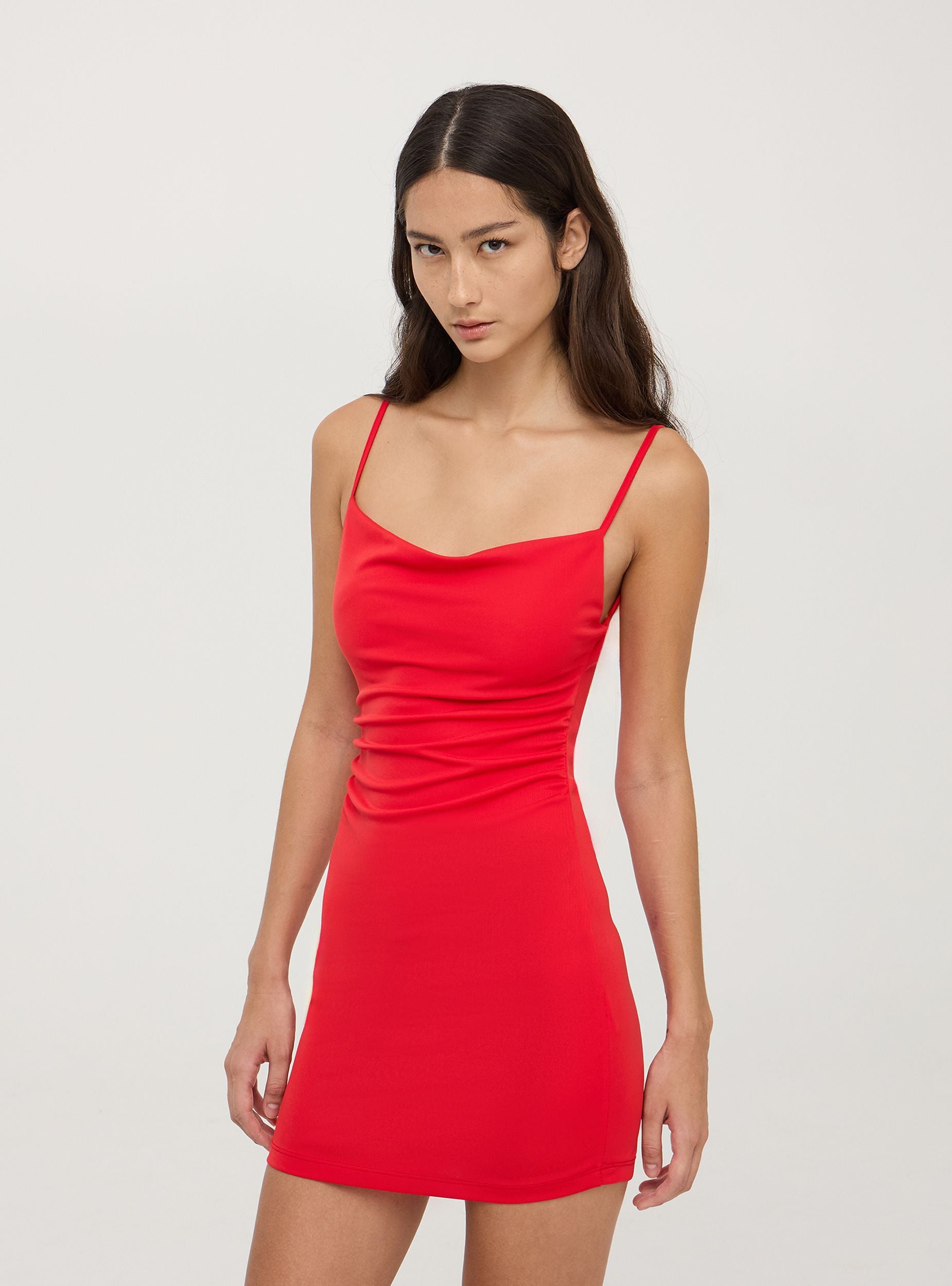 Abito da donna a tinta unita con spalline sottili e scollo a cascata. Il design segue le linee del corpo, mettendo in risalto la silhouette. La lunghezza sopra il ginocchio lo rende perfetto per occasioni sia casual che eleganti.