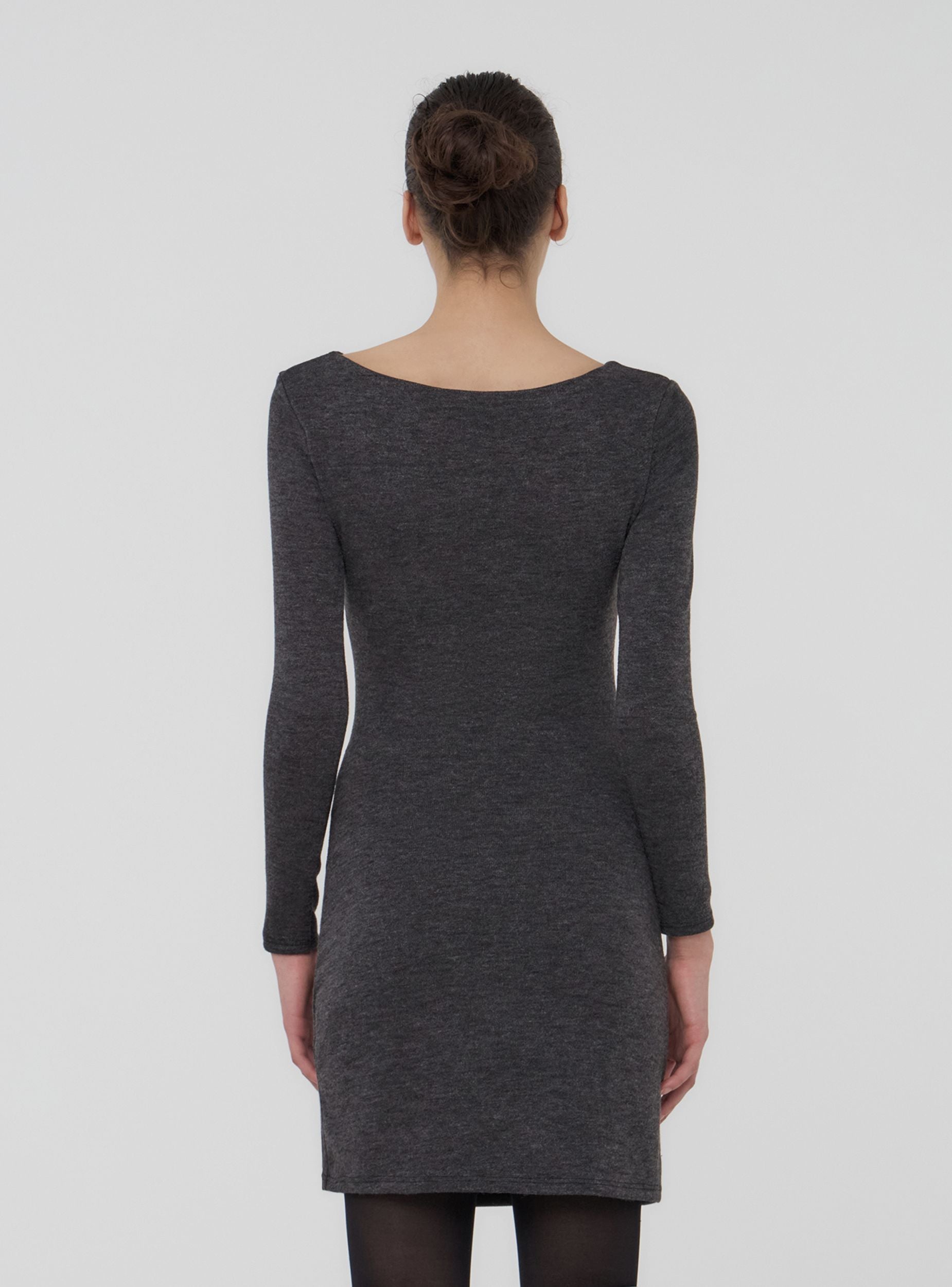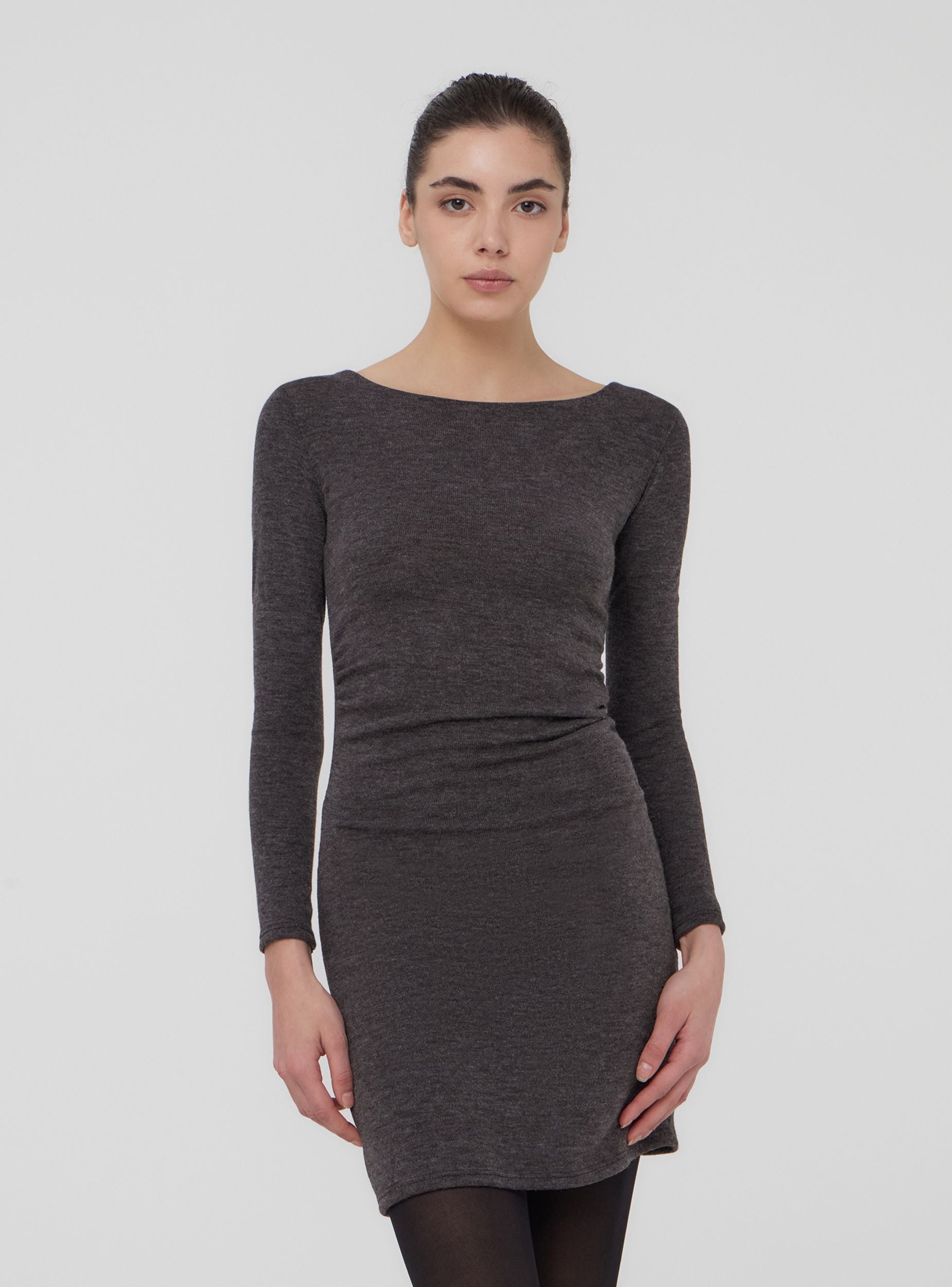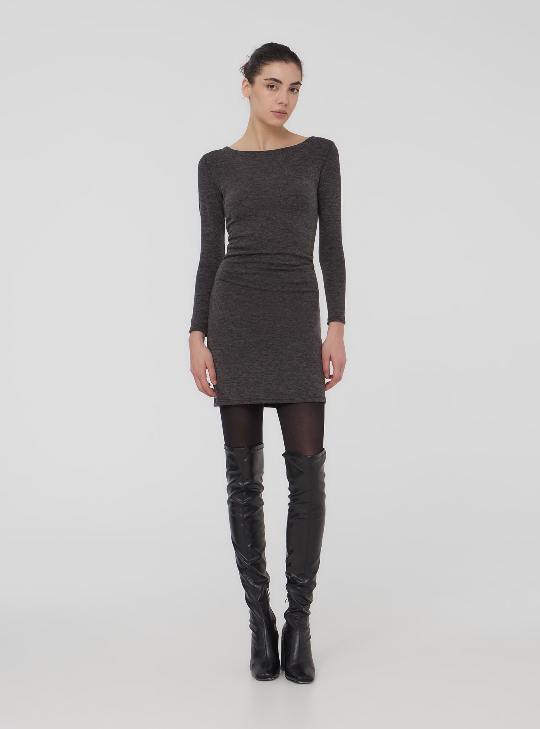 Abito da donna dallo stile versatile, caratterizzato da una trama in maglia a tinta unita che garantisce comfort e morbidezza. La lunghezza corta e le maniche lunghe lo rendono adatto a diverse occasioni, mentre le arricciature lungo i lati aggiungono un tocco di movimento e femminilità al design. Perfetto per essere abbinato a stivali o scarpe basse, è un capo ideale per look casual ma curati nei dettagli.