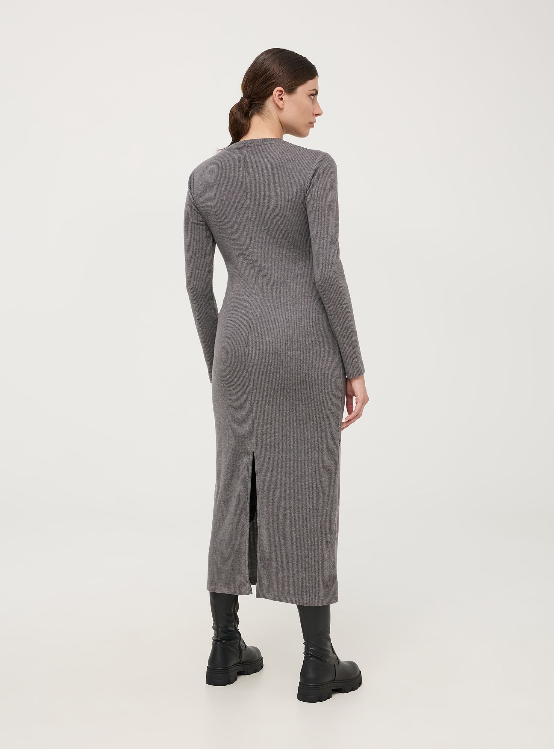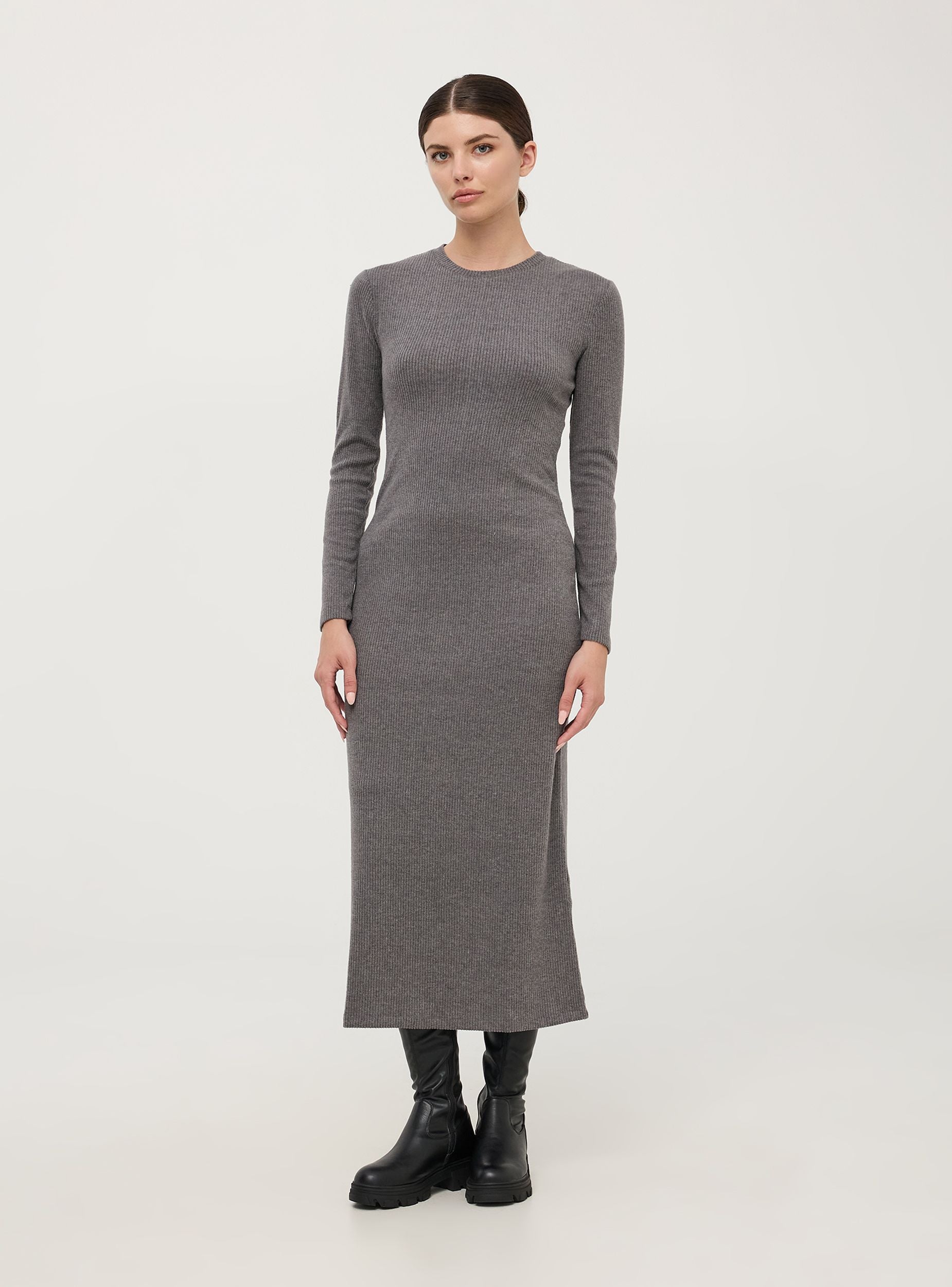 Abito lungo da donna a costine con maniche lunghe e girocollo. Il taglio aderente esalta la silhouette, mentre lo spacco posteriore aggiunge un tocco di femminilità e movimento. Perfetto per un look sofisticato e alla moda.
