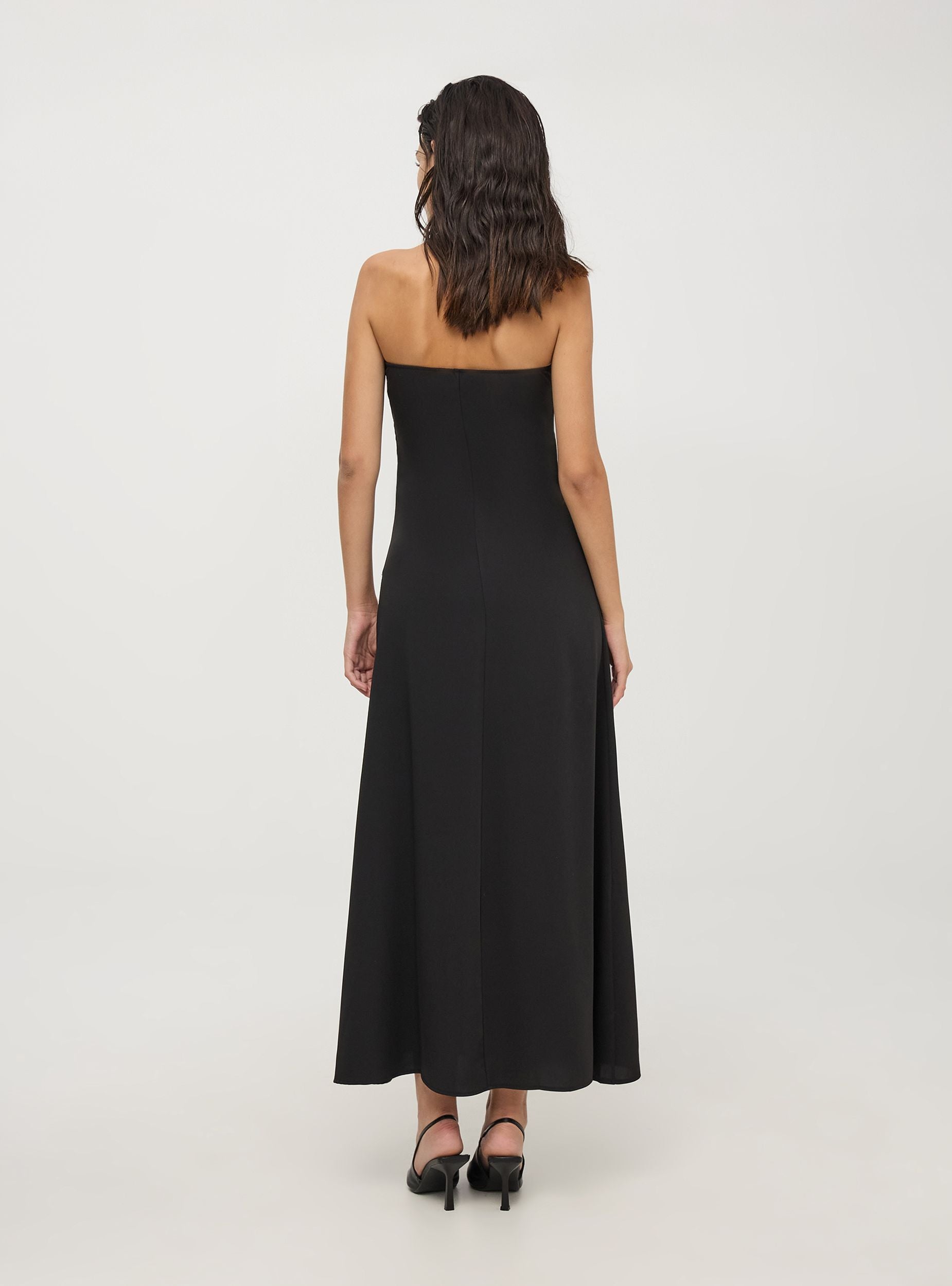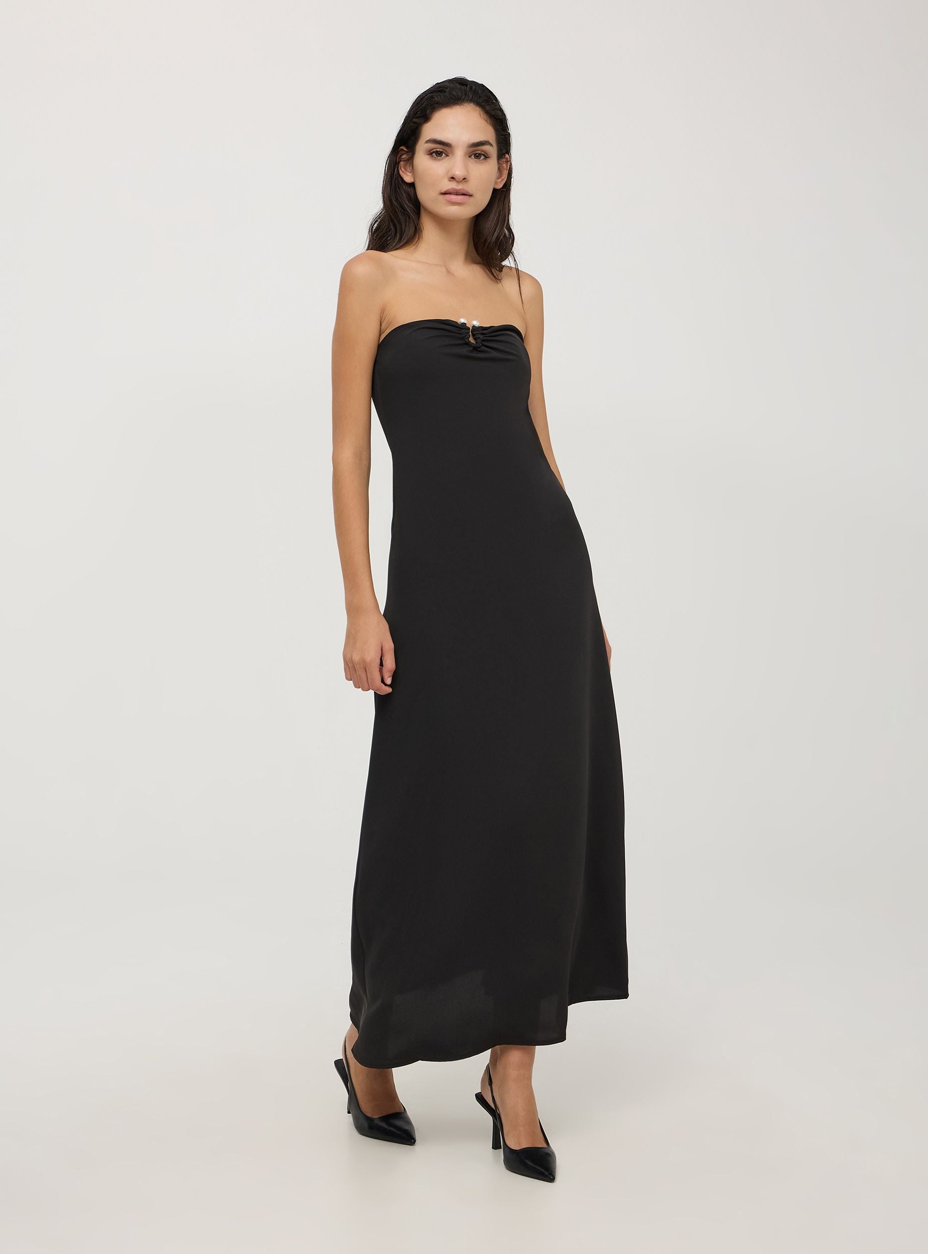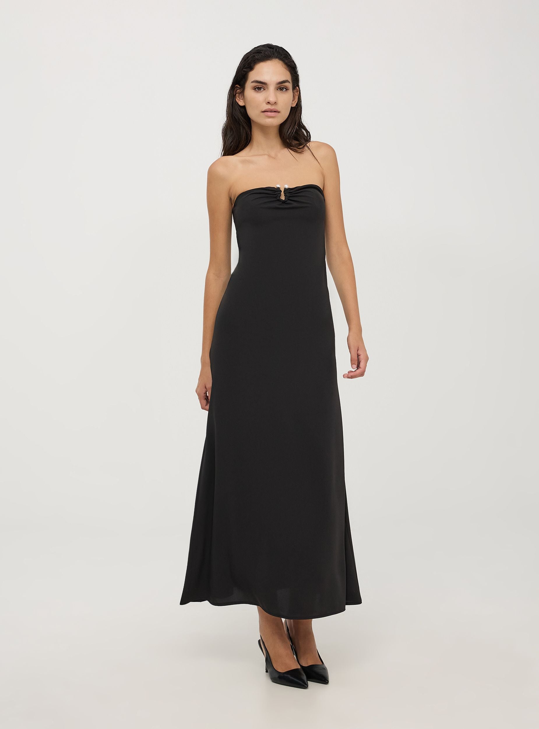 Abito lungo da donna con scollo a fascia e ferretto integrato. Il design elegante e aderente valorizza la silhouette, rendendolo ideale per occasioni formali e serate speciali. La lunghezza conferisce un tocco di raffinatezza e femminilità, mentre il dettaglio del ferretto offre un look sofisticato.