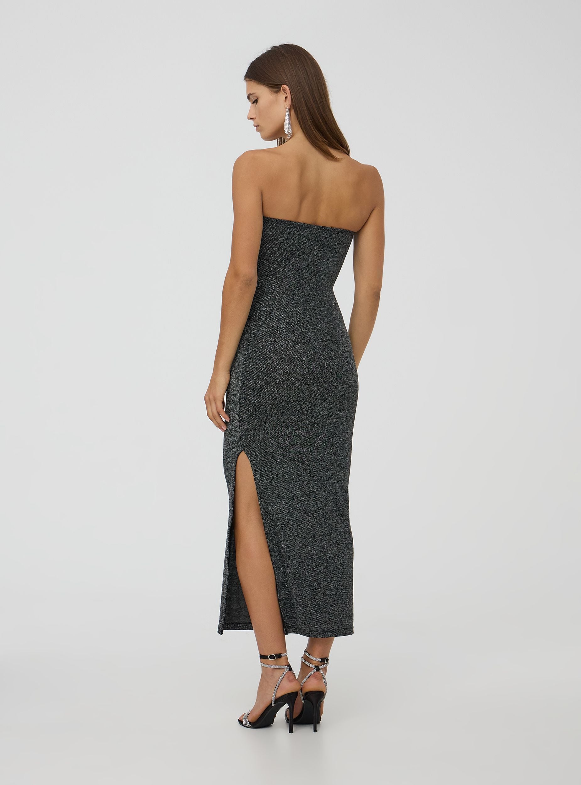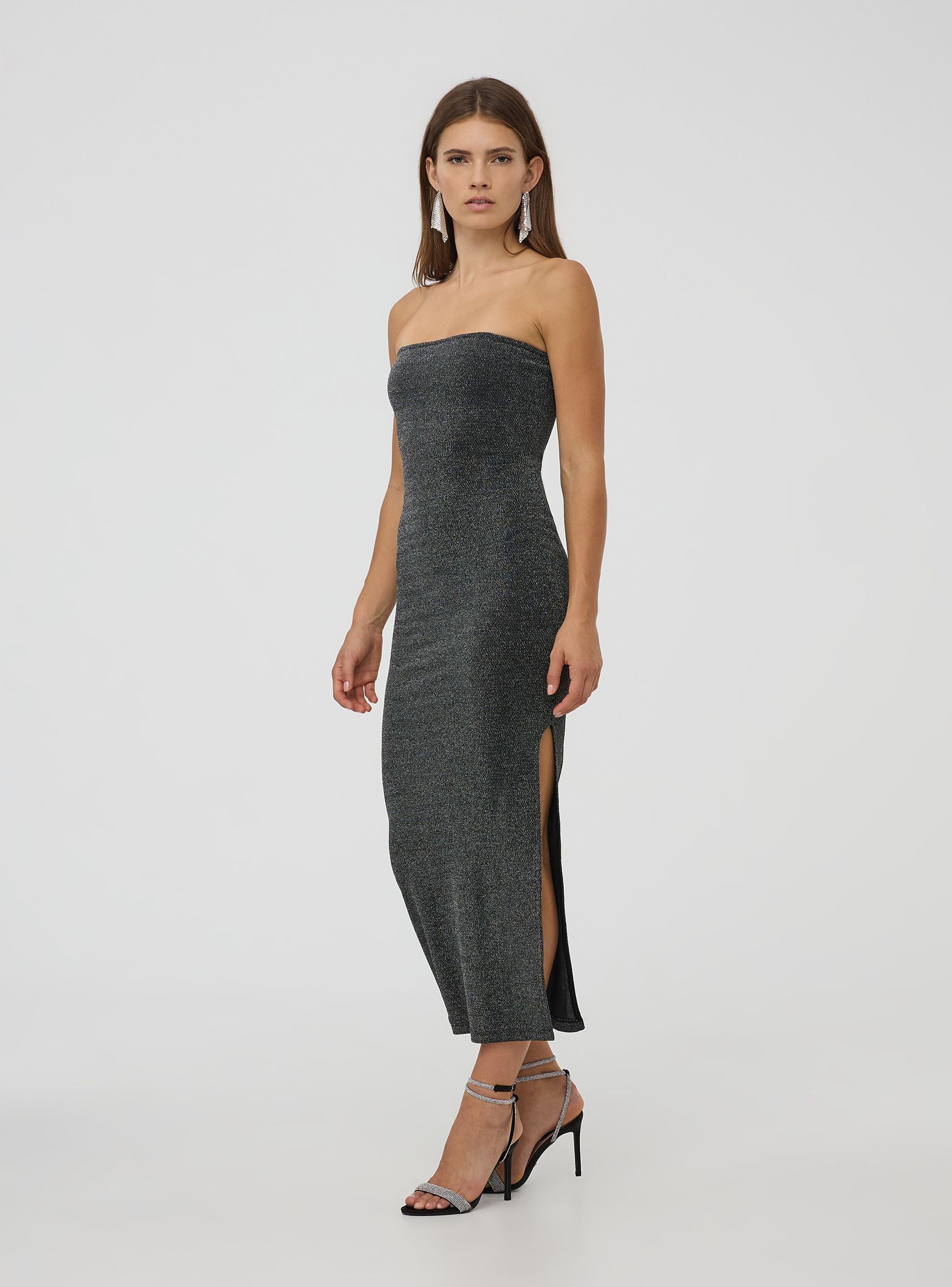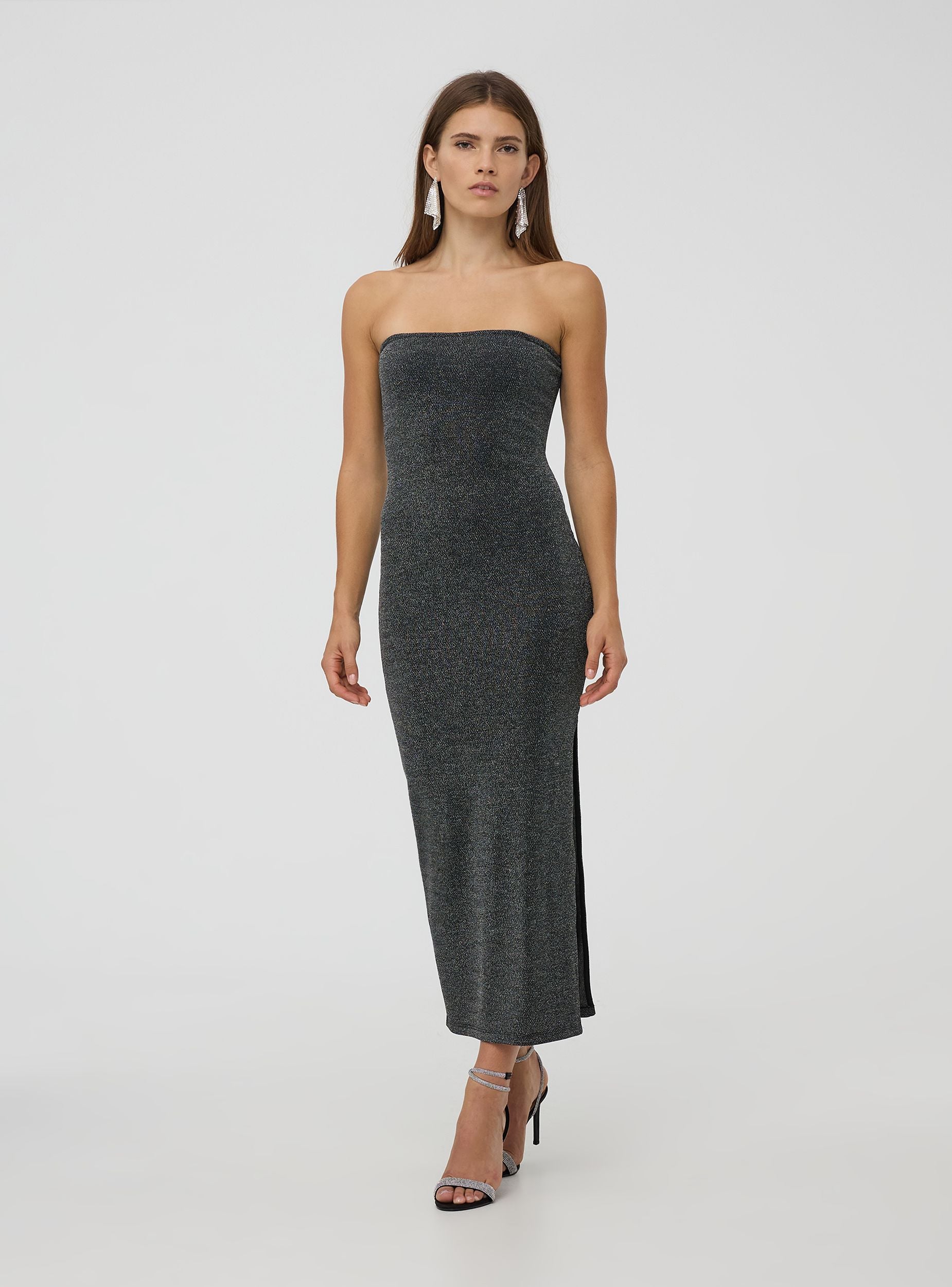 Abito da donna lungo senza spallinluccicante. La parte superiore del vestito presenta una fascia in silicone antiscivolo che corre lungo tutto il bordo interno, garantendo una vestibilità sicura. L'abitoèfoderato per assicurare comfort e una caduta impeccabile. Perfetto per serate speciali.Dettagli