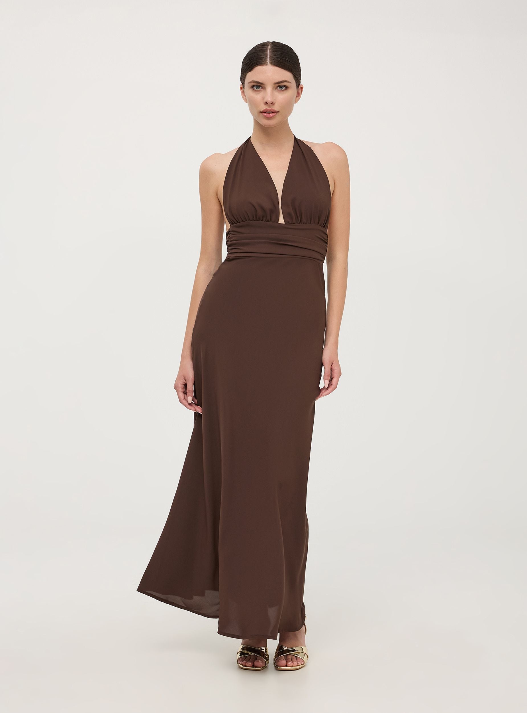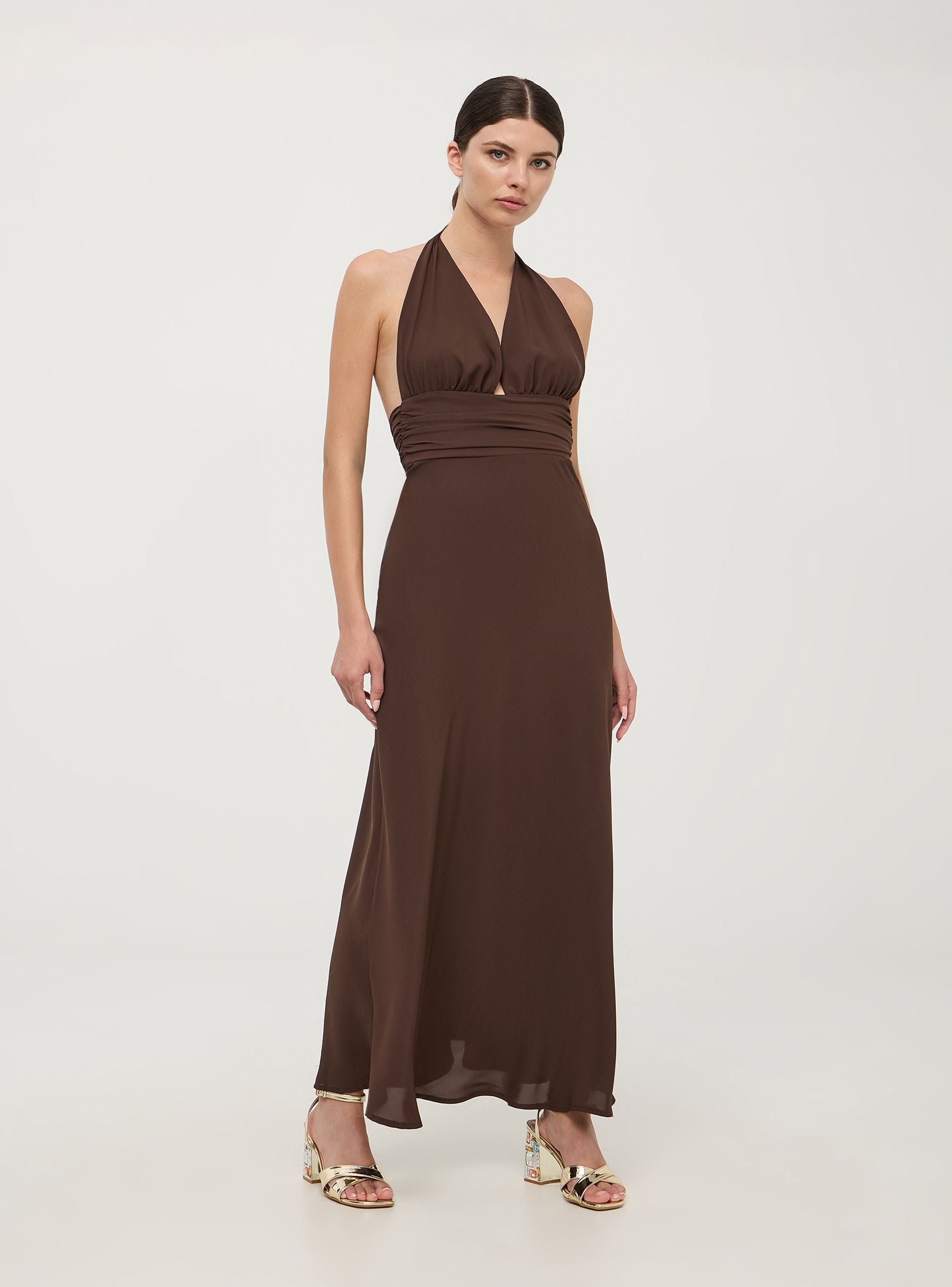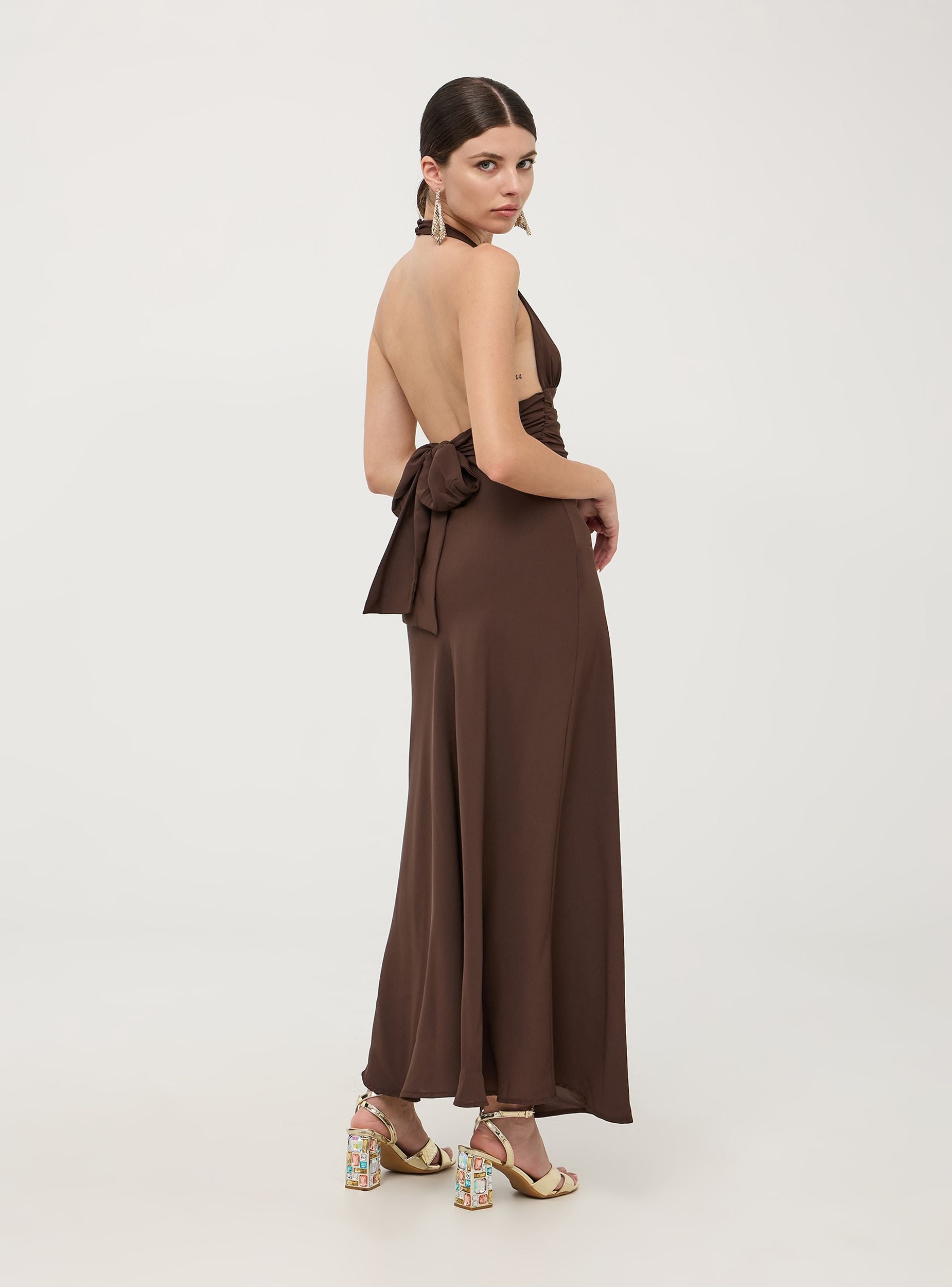 Abito lungo da donna con allacciatura dietro al collo e dettaglio a fiocco sulla schiena. La silhouette aderente in vita si allarga verso il fondo, conferendo eleganza e fluidità al capo. Perfetto per serate eleganti e occasioni speciali.