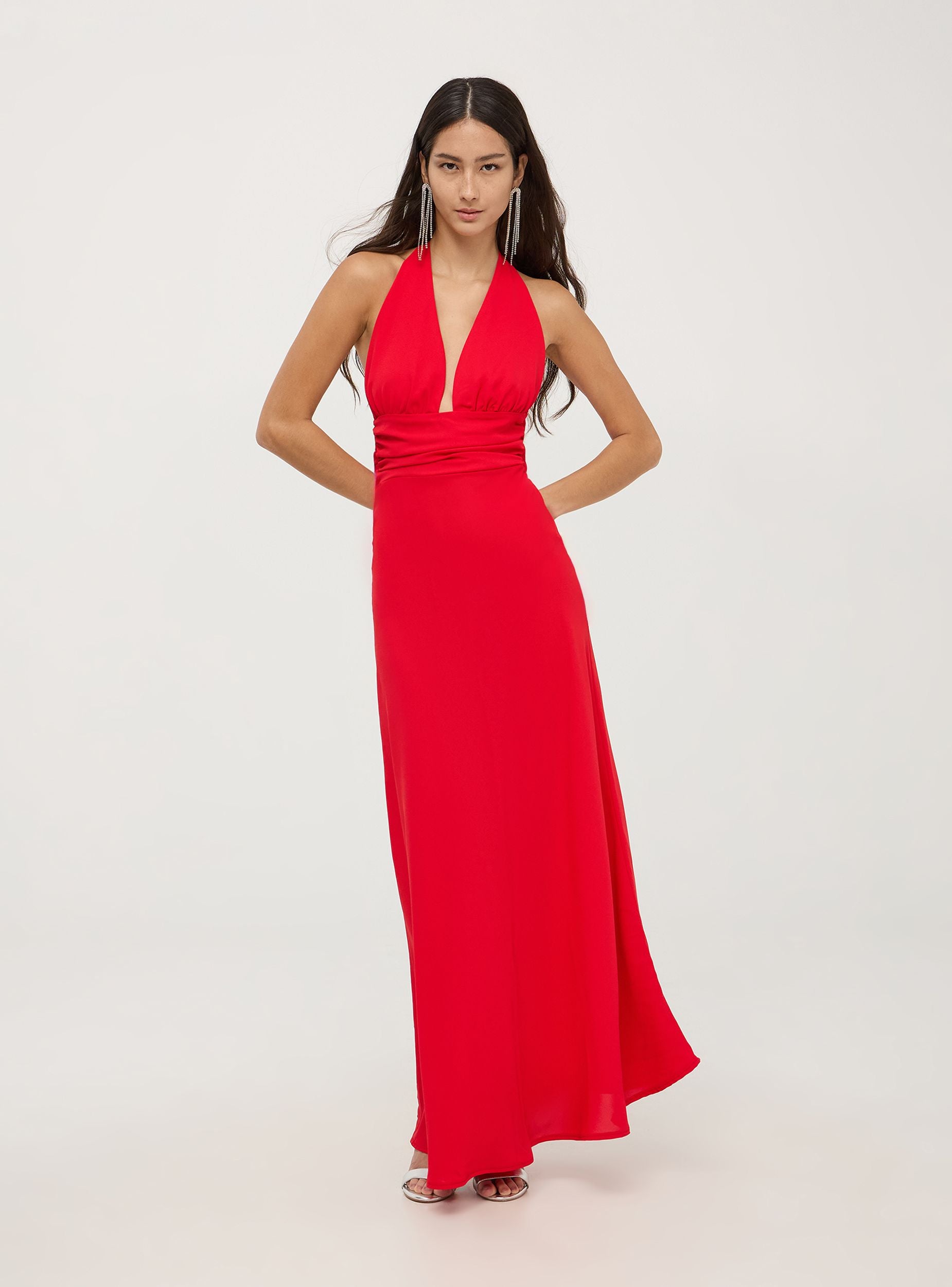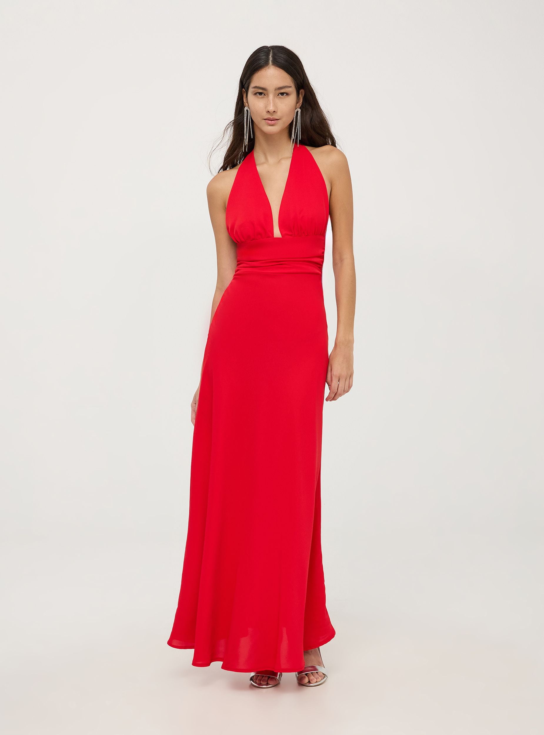 Abito lungo da donna con allacciatura dietro al collo e dettaglio a fiocco sulla schiena. La silhouette aderente in vita si allarga verso il fondo, conferendo eleganza e fluidità al capo. Perfetto per serate eleganti e occasioni speciali.Dettagli