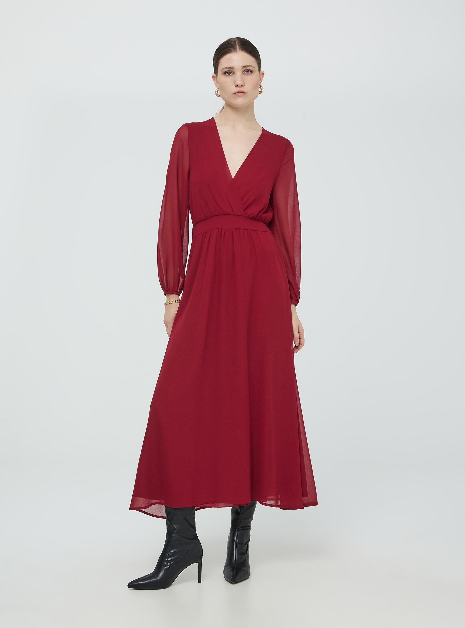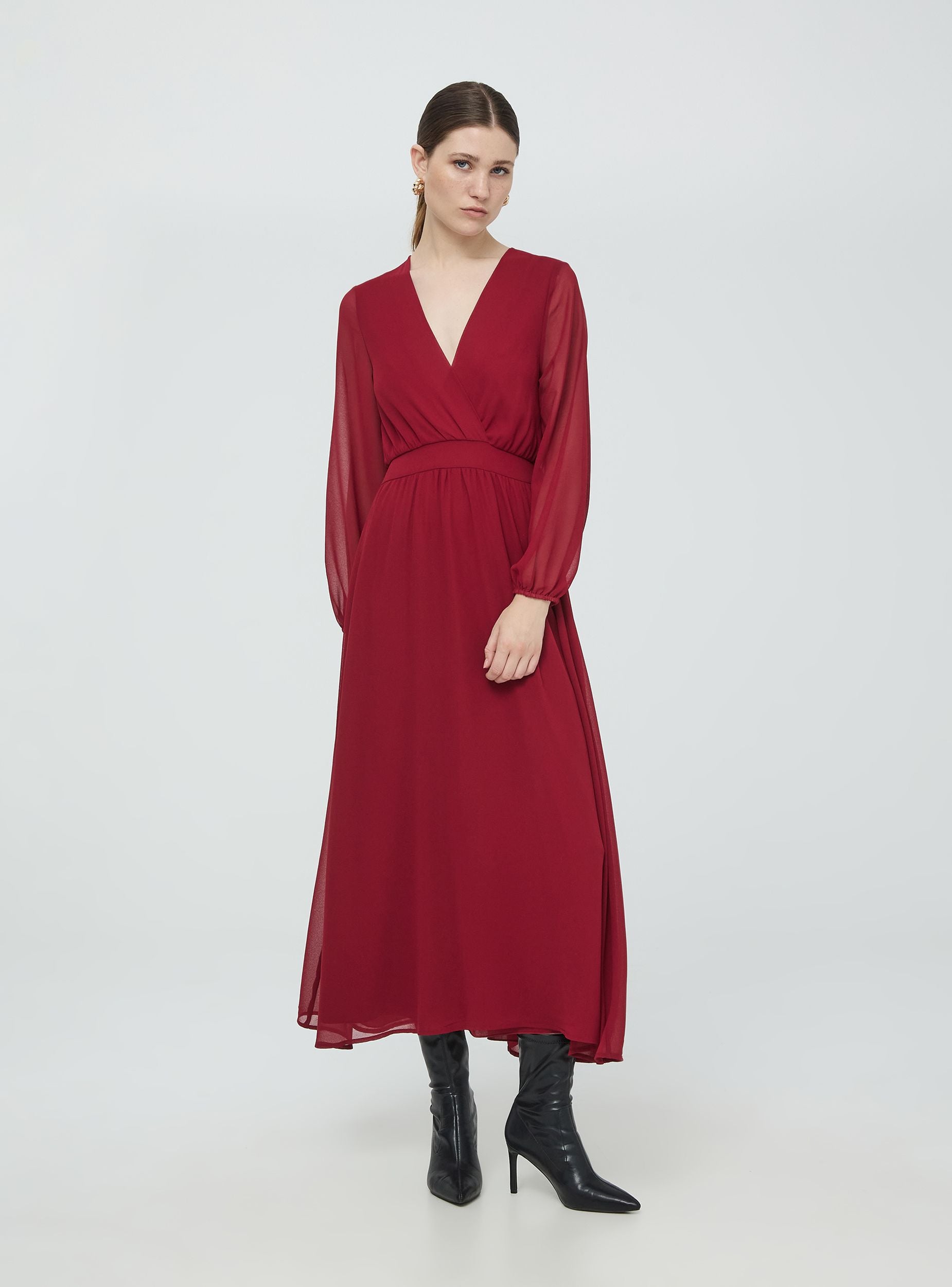 Abito da donna lungo con scollo a V incrociato e vita elasticizzata. Le maniche sono lunghe con polsini elasticizzati e in tessuto semitrasparente come anche la schiena, mentre la gonna è ampia e fluida. Perfetto per un look elegante e confortevole, ideale per occasioni formali come cene eleganti, eventi serali e cerimonie.Dettagli