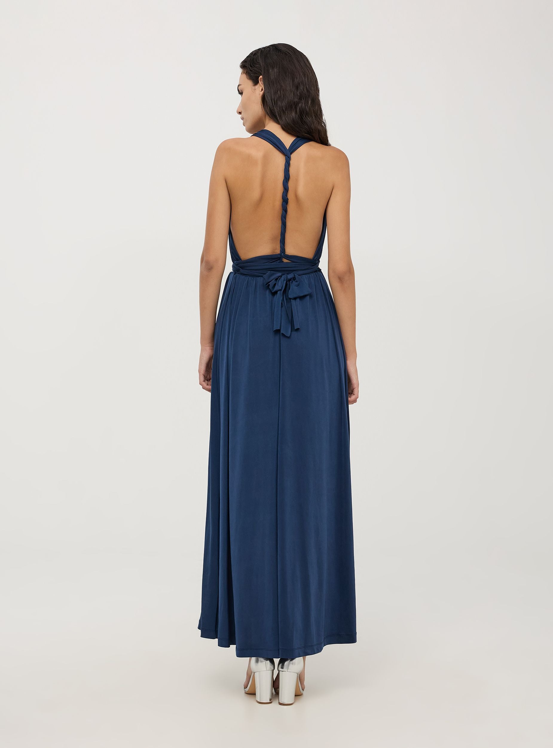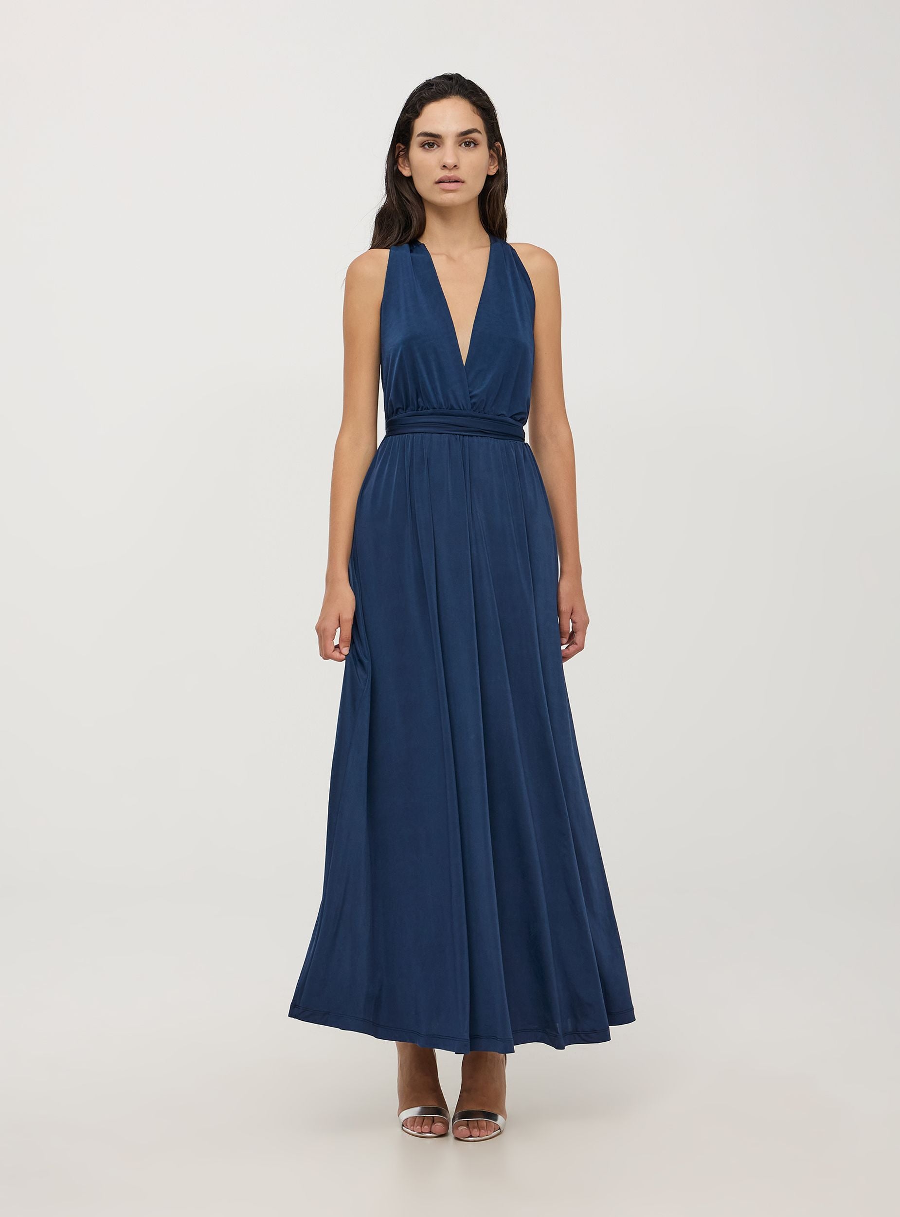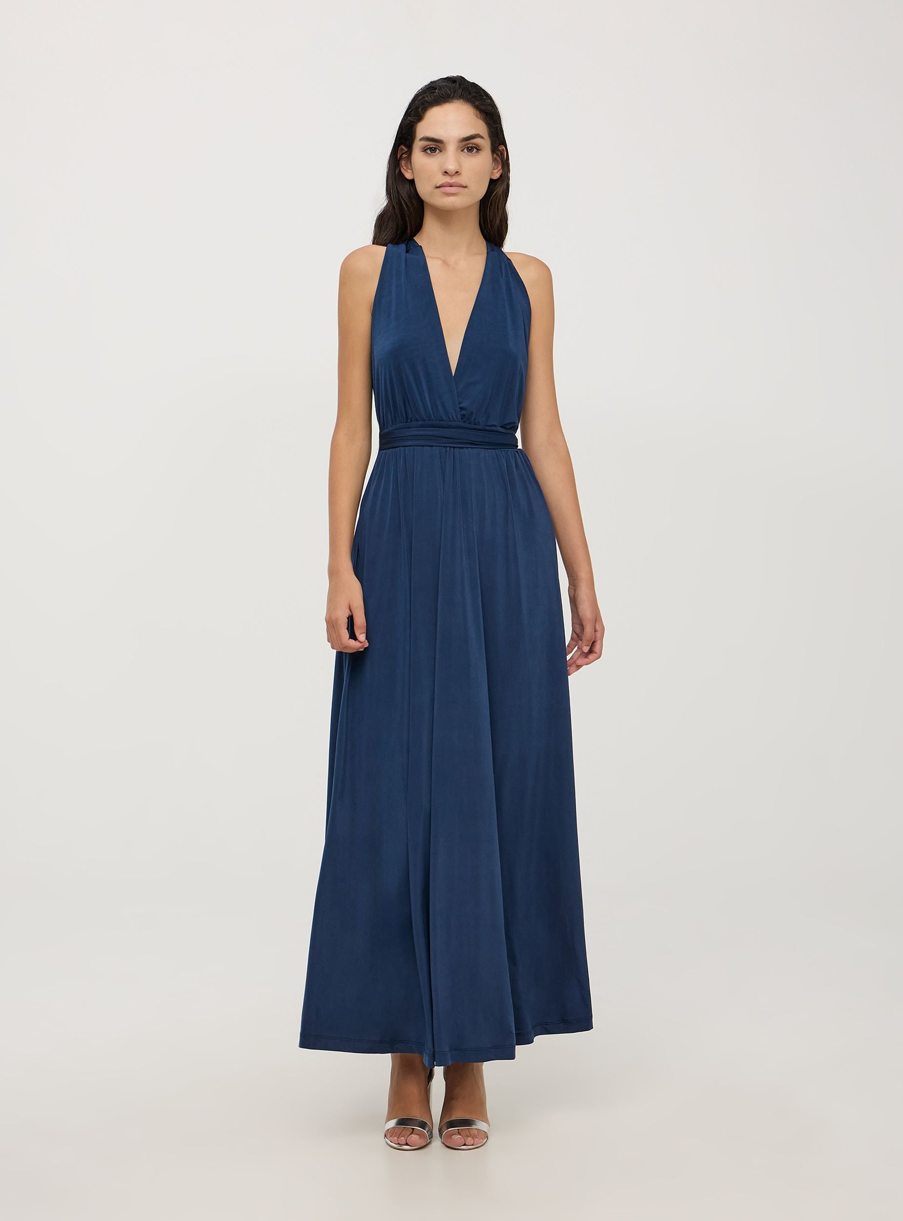 Abito lungo da donna con scollo profondo a V e cintura in vita per definire la silhouette. Il design presenta una treccia decorativa sul retro, aggiungendo un dettaglio unico e sofisticato. Ideale per occasioni speciali e serate eleganti, offre un look femminile e raffinato. La gonna fluente conferisce movimento e leggerezza.Dettagli