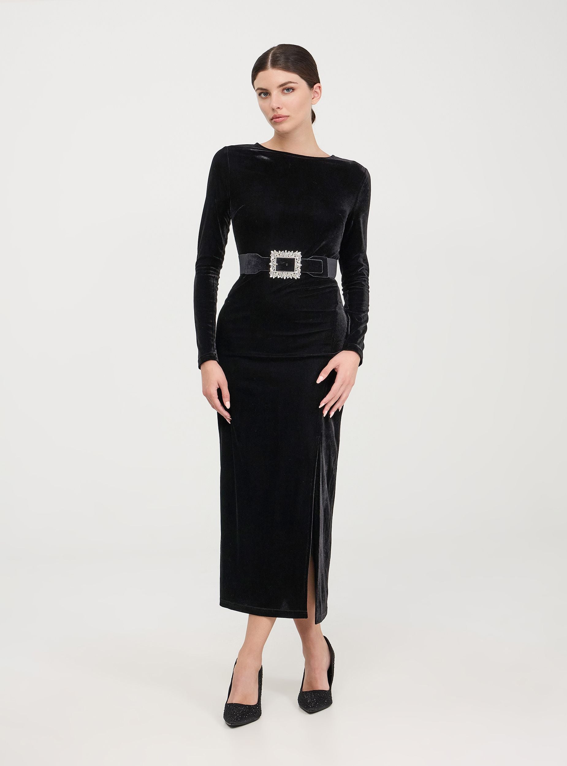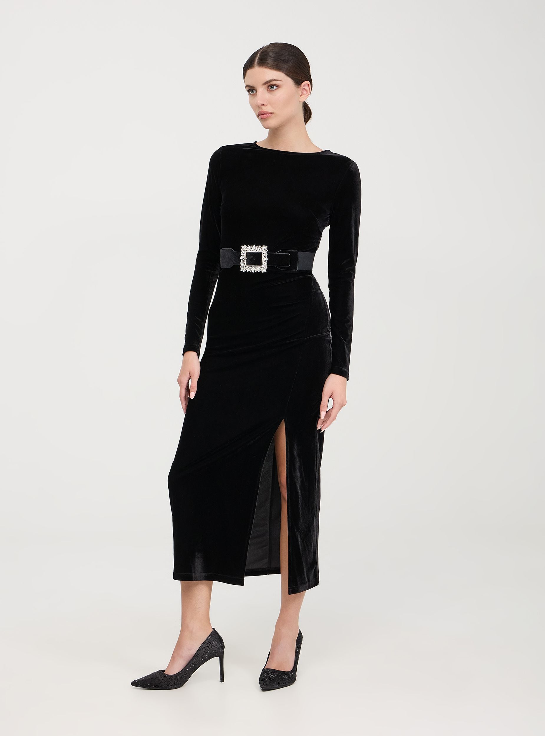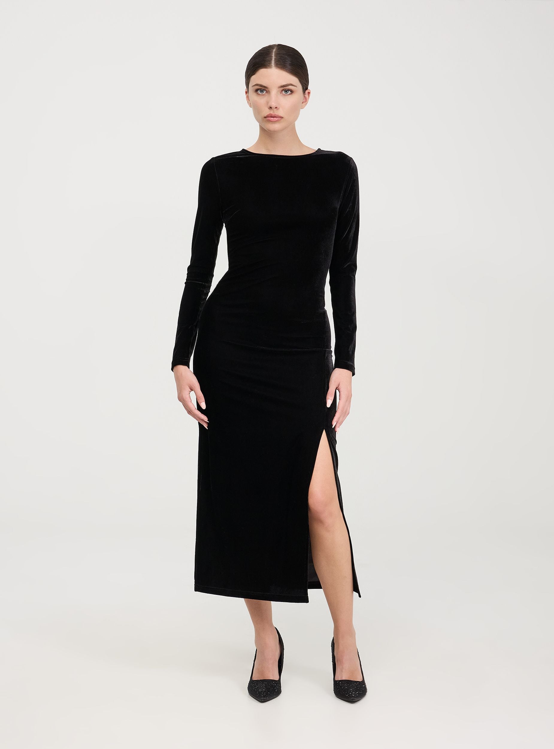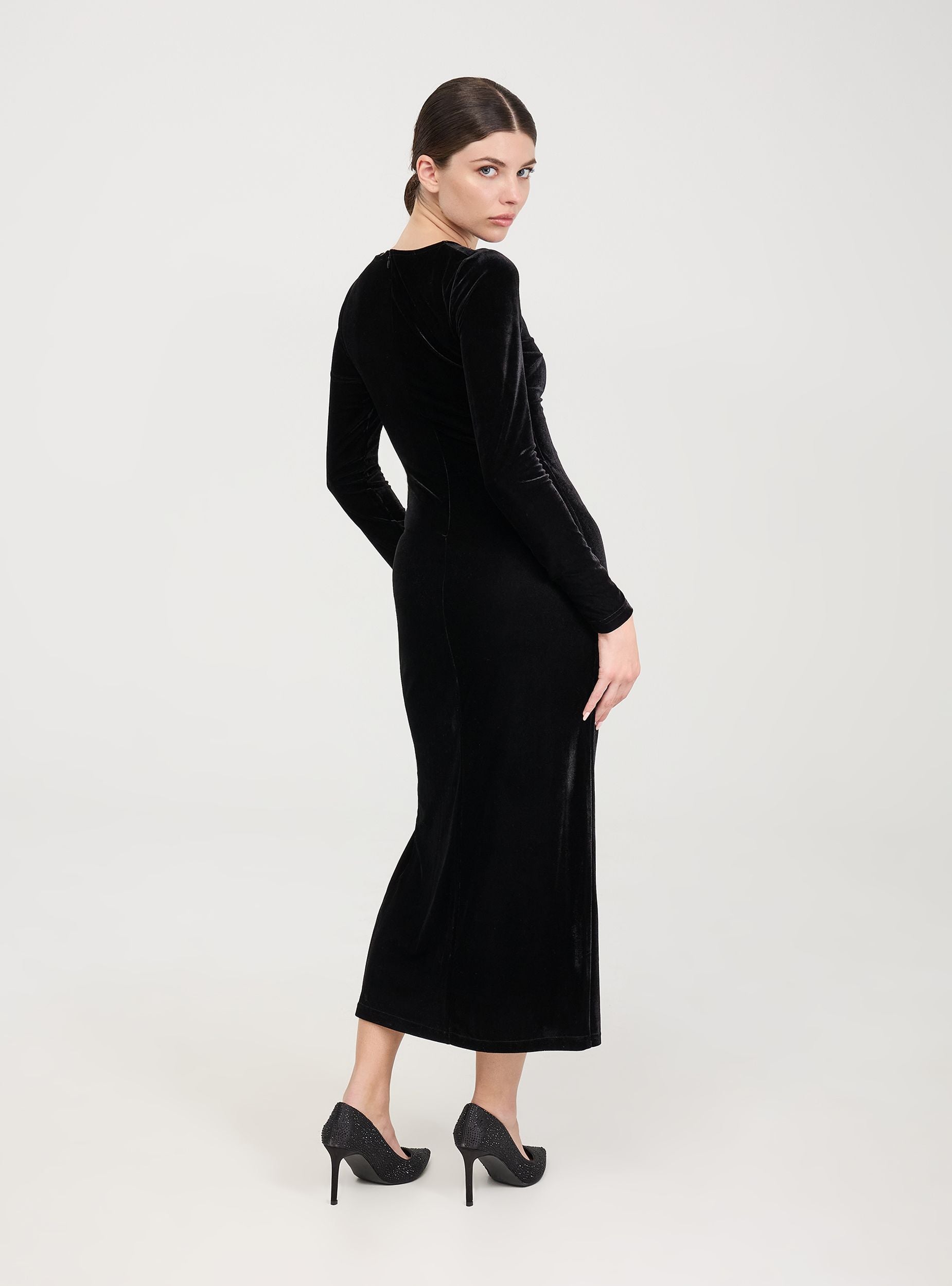 Abito lungo da donna in ciniglia con maniche lunghe e girocollo. Presenta un taglio aderente che esalta la figura, con uno spacco laterale per maggiore movimento e stile. Chiusura posteriore con zip. Ideale per una serata elegante o un'occasione speciale.