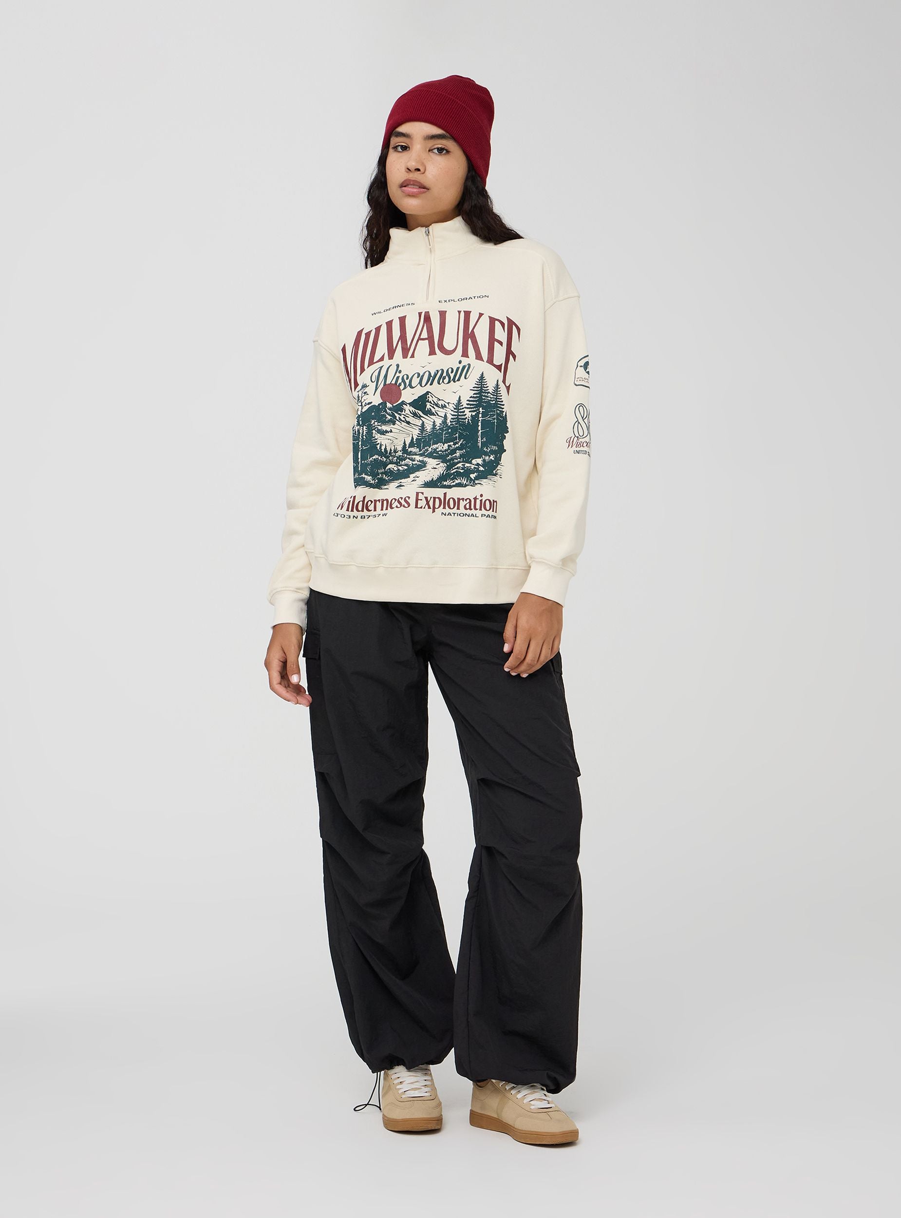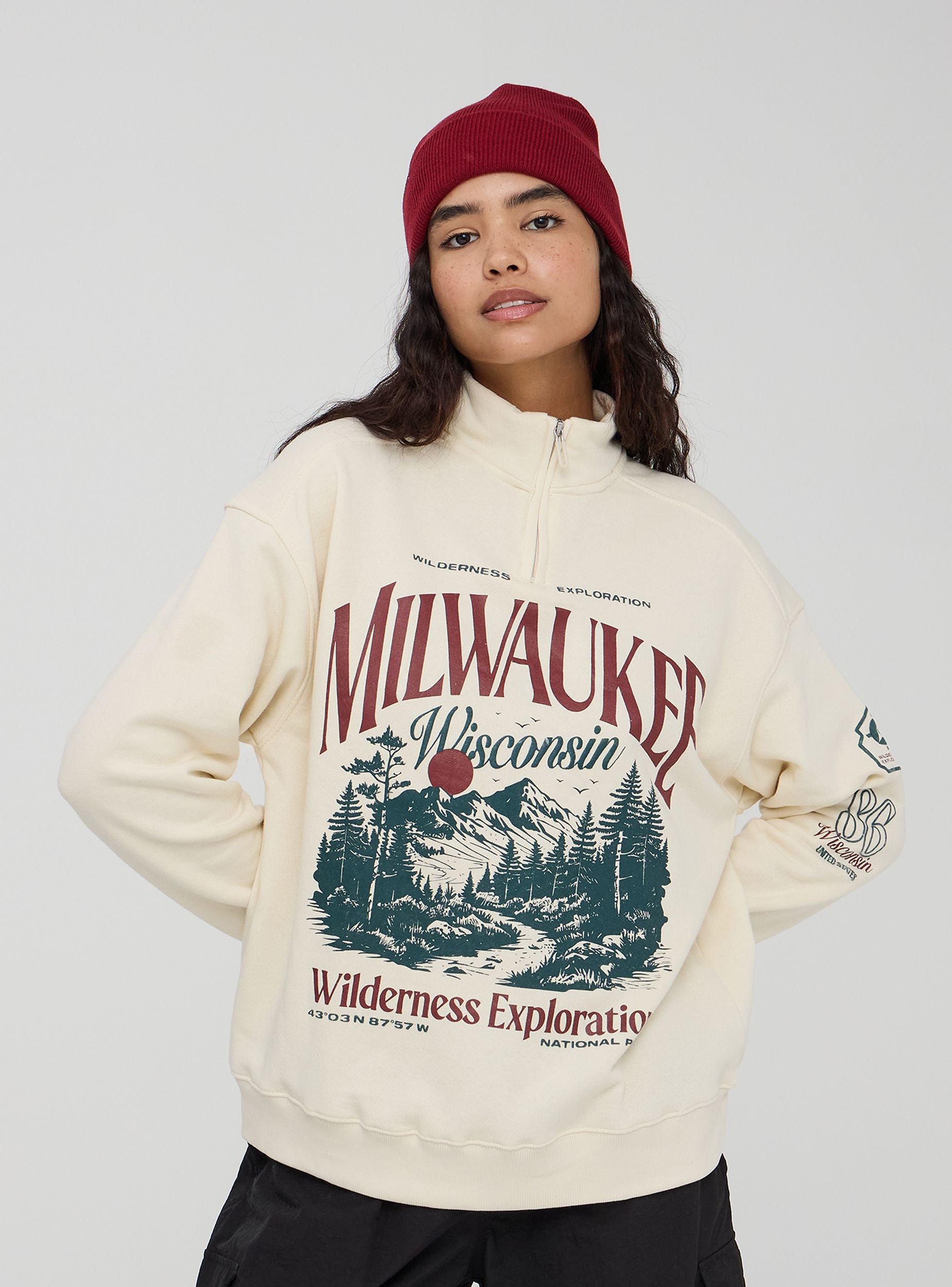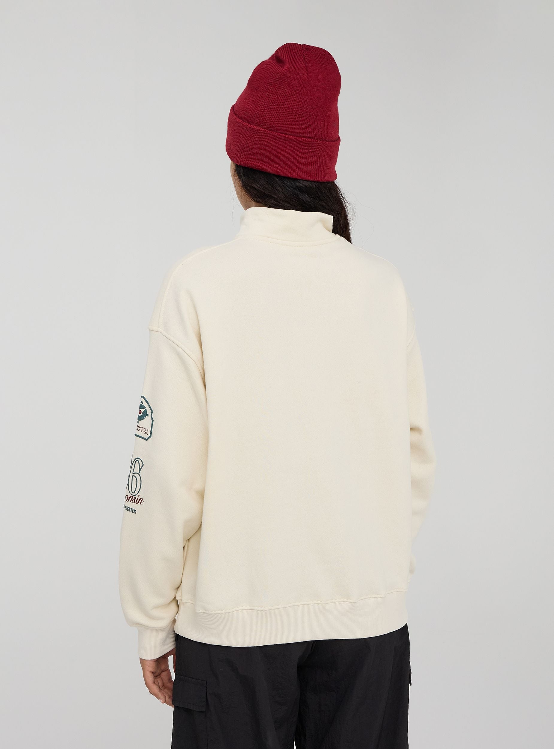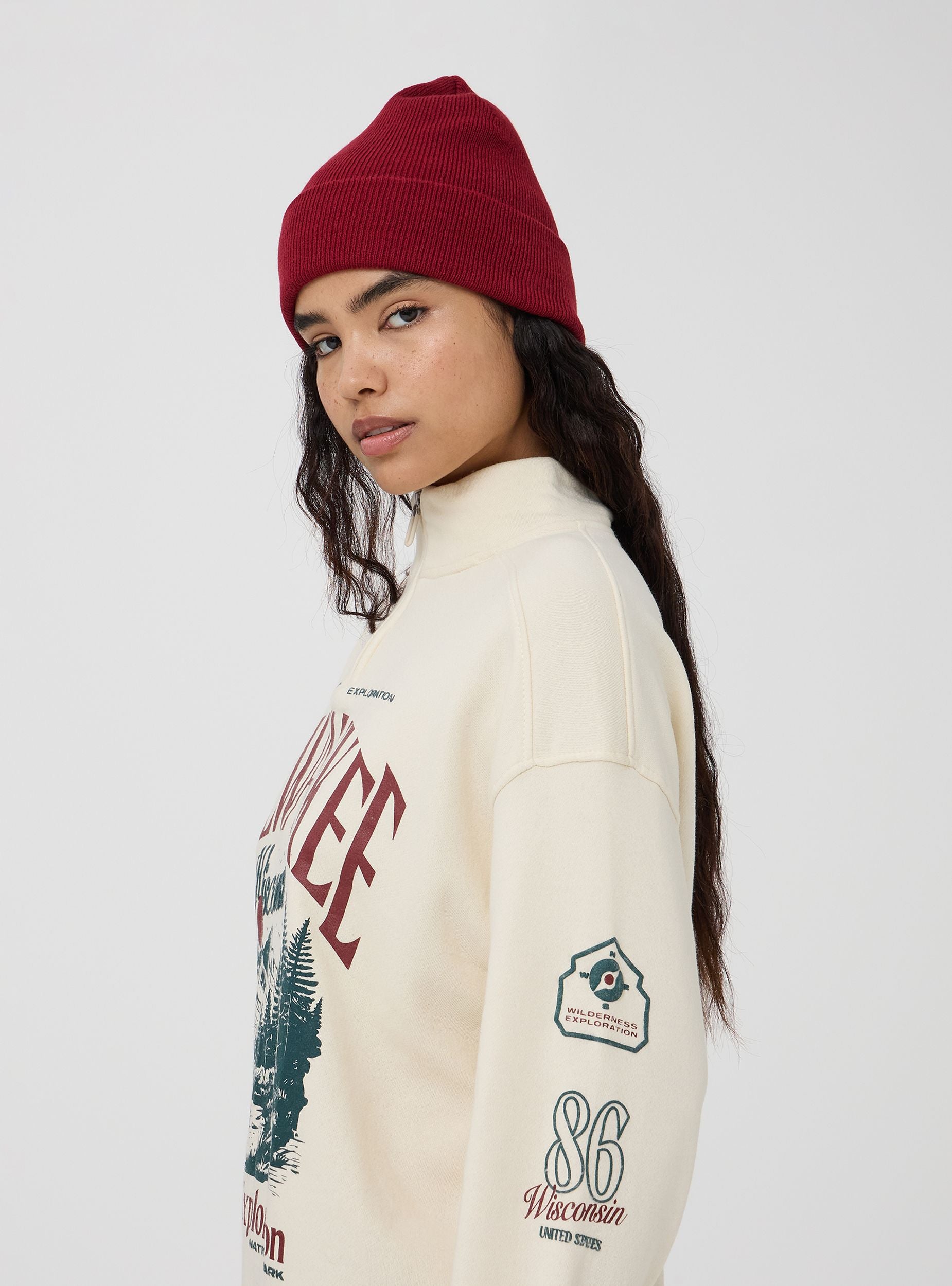 Bluza oversize z wysokim kołnierzem, półzamkiem i nadrukiem górskim