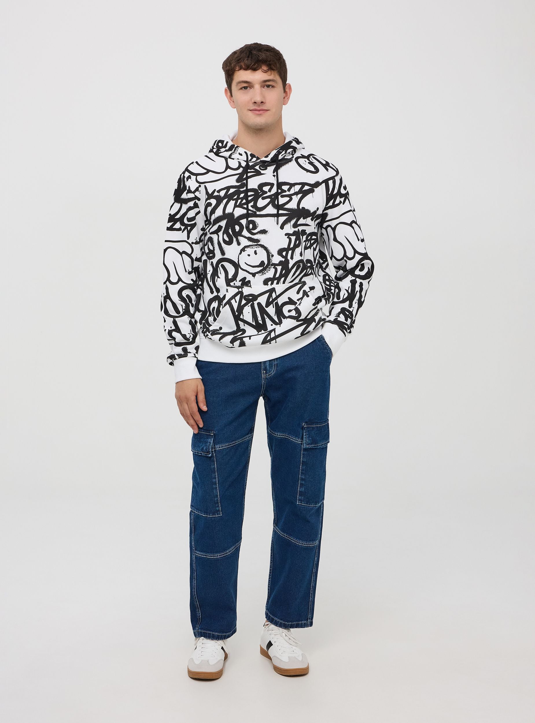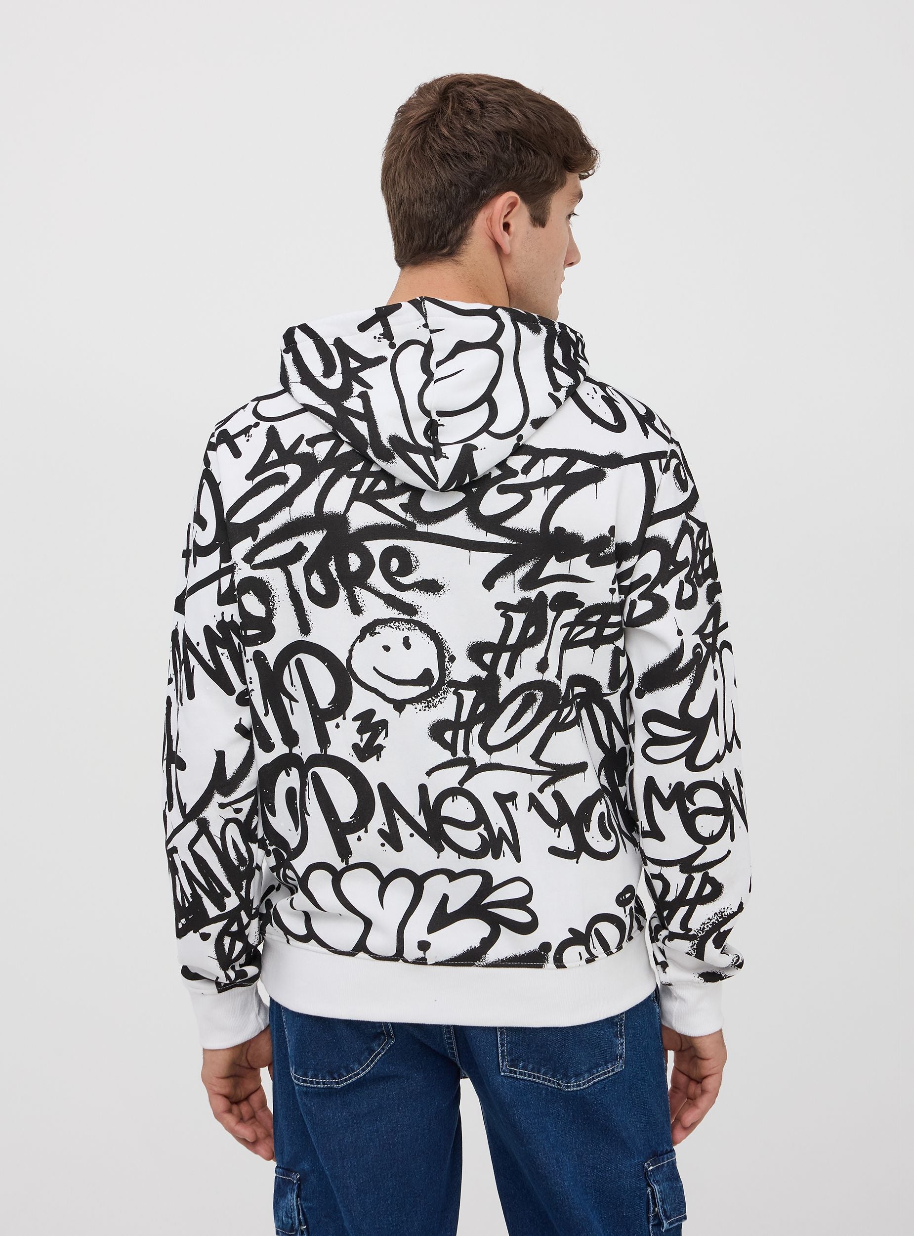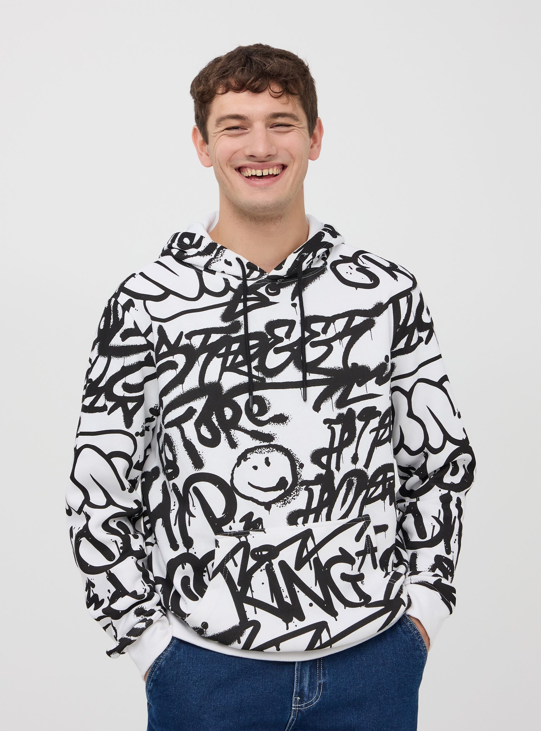 Męska bluza z kapturem z długim rękawem z regulowanym sznurkiem. Ciężki materiał z nadrukiem w stylu urban all-over. Model z kieszenią kangurką i wykończeniami ściągaczowymi. Regularny krój.