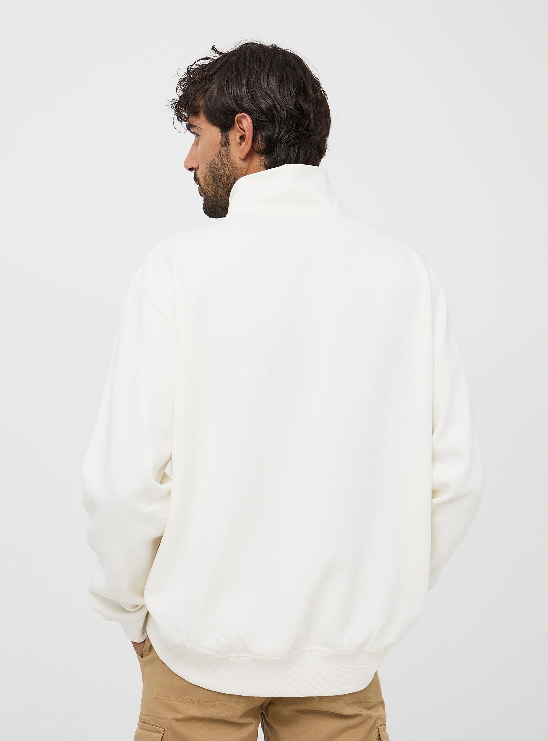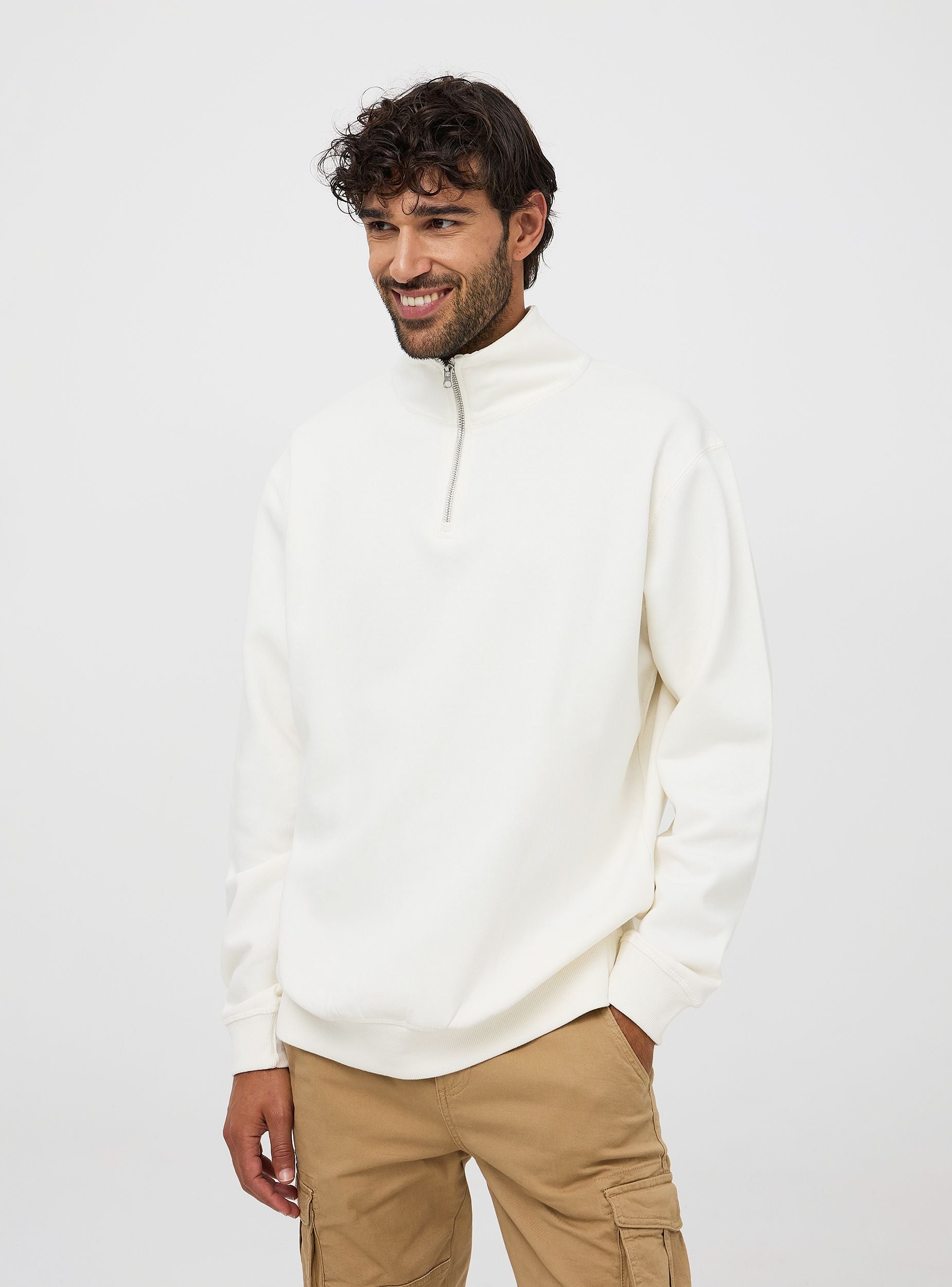 Męska bluza, model bez kaptura, z wysokim kołnierzem i helf zip. Wykonana z ciężkiego jednolitego materiału, z ściągaczami i dołem wykończonym ściągaczem. Idealna na casualowy i wszechstronny look, ta bluza jest doskonała na luźne dni, relaksujące weekendy i spacery na świeżym powietrzu. Łatwo dopasowuje się do spodni chino lub dżinsów, co czyni ją niezbędnym elementem garderoby każdego mężczyzny, odpowiednią zarówno do pracy, jak i na czas wolny.Szczegóły
