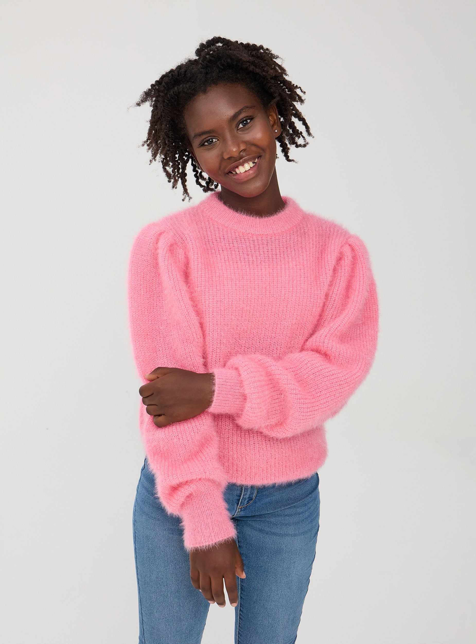 Dziewczęca bluzka z okrągłym dekoltem i długimi rękawami. Miękki i przyjemny w dotyku materiał w jednolitym kolorze zapewnia wyjątkowy komfort, co sprawia, że jest idealna na zimne dni. Lekko bufiaste rękawy dodają unikalnego stylu. Ta bluzka jest idealna na casualowy look do szkoły lub w czasie wolnym. Łatwo łączy się z dżinsami lub legginsami, tworząc ciepły i modny strój na każdą okazję.