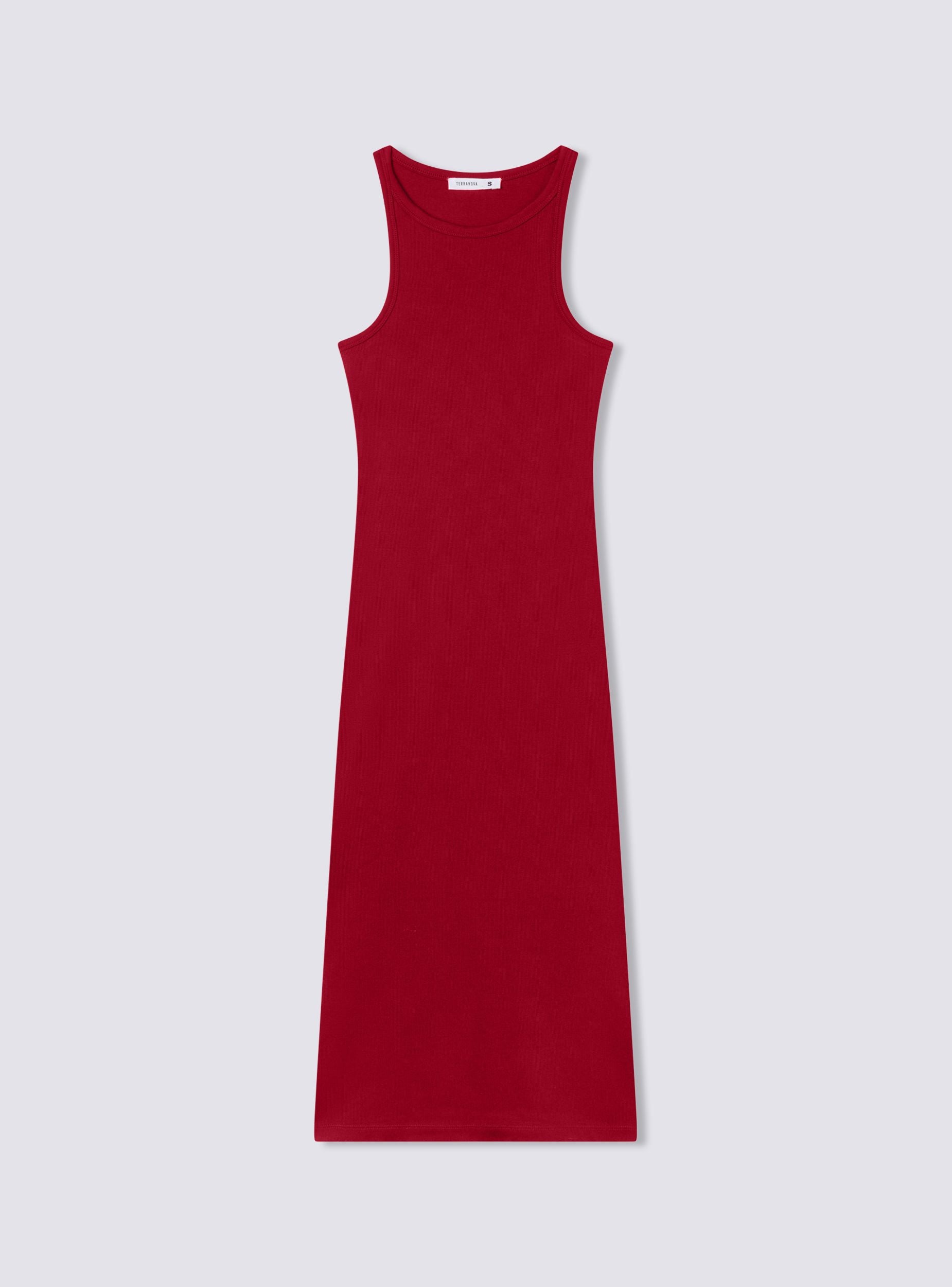 Długa sukienka damska o dopasowanej i eleganckiej sylwetce, charakteryzująca się jednolitą barwą, która podkreśla prostotę designu. Posiada elegancki dekolt amerykański, który odsłania ramiona, dodając odrobinę kobiecości i nowoczesności. Prosty krój sięga do połowy łydki, eksponując sylwetkę i nadając lekkości. Idealna na specjalne okazje lub letnie wieczory, ta sukienka łączy komfort i styl dzięki prostemu i wszechstronnemu designowi, doskonałemu do zestawienia z sandałami lub eleganckimi dodatkami, aby dopełnić look w wyrafinowany sposób.