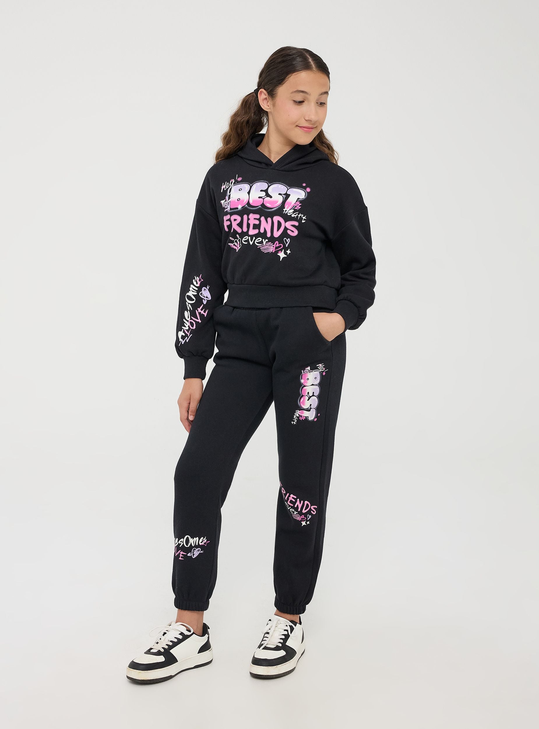 Dziecięca bluza crop z kapturem z ciężkiego materiału, idealna do dodania odrobiny casualowego stylu do garderoby. Posiada żywe, wielokolorowe nadruki graffiti z napisem "Best Friends" z przodu i "Awesome Love" na rękawie. Ściągacz u dołu i przy mankietach zapewnia dopasowany i komfortowy krój.