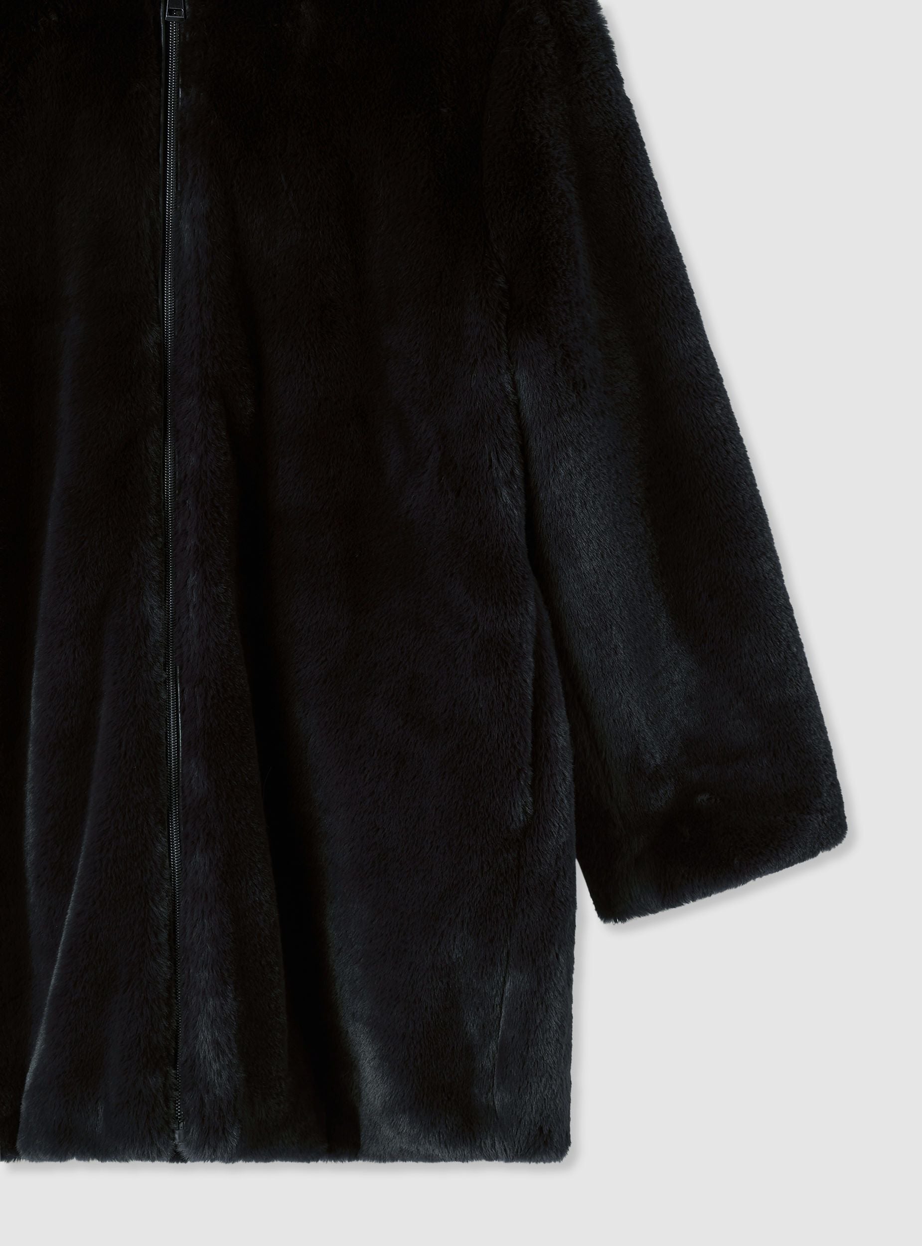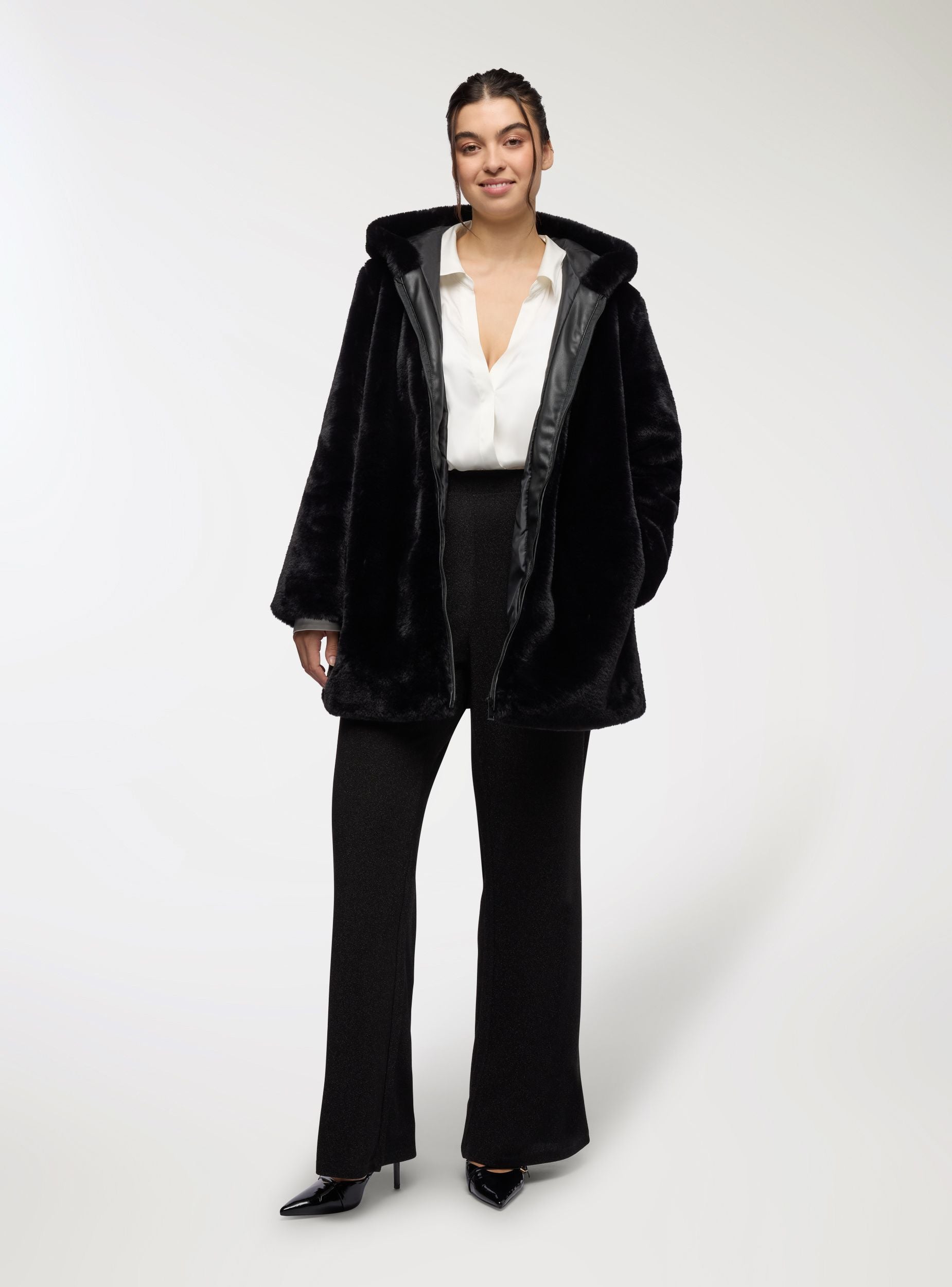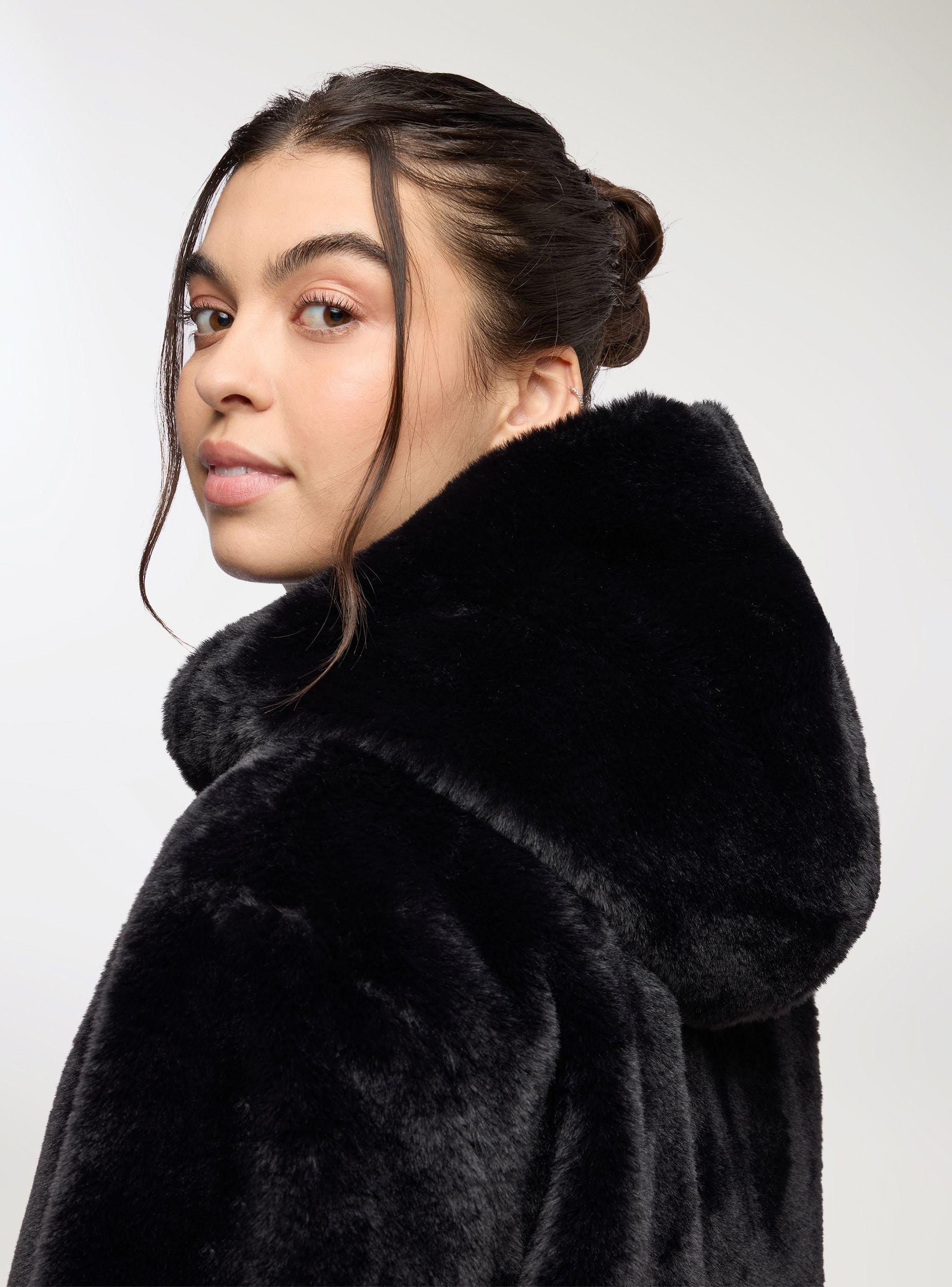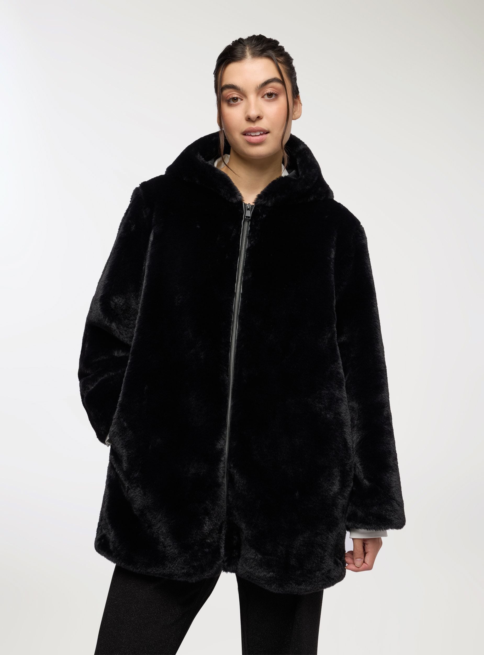 Kurtka damska z futra syntetycznego z kapturem, idealna na zimne dni w stylu. Zamek błyskawiczny zapewnia praktyczność, podczas gdy design z kapturem chroni przed wiatrem. Doskonała do codziennych i miejskich stylizacji, wyróżnia się wszechstronnością i komfortem. Niezbędny element zimowej garderoby.