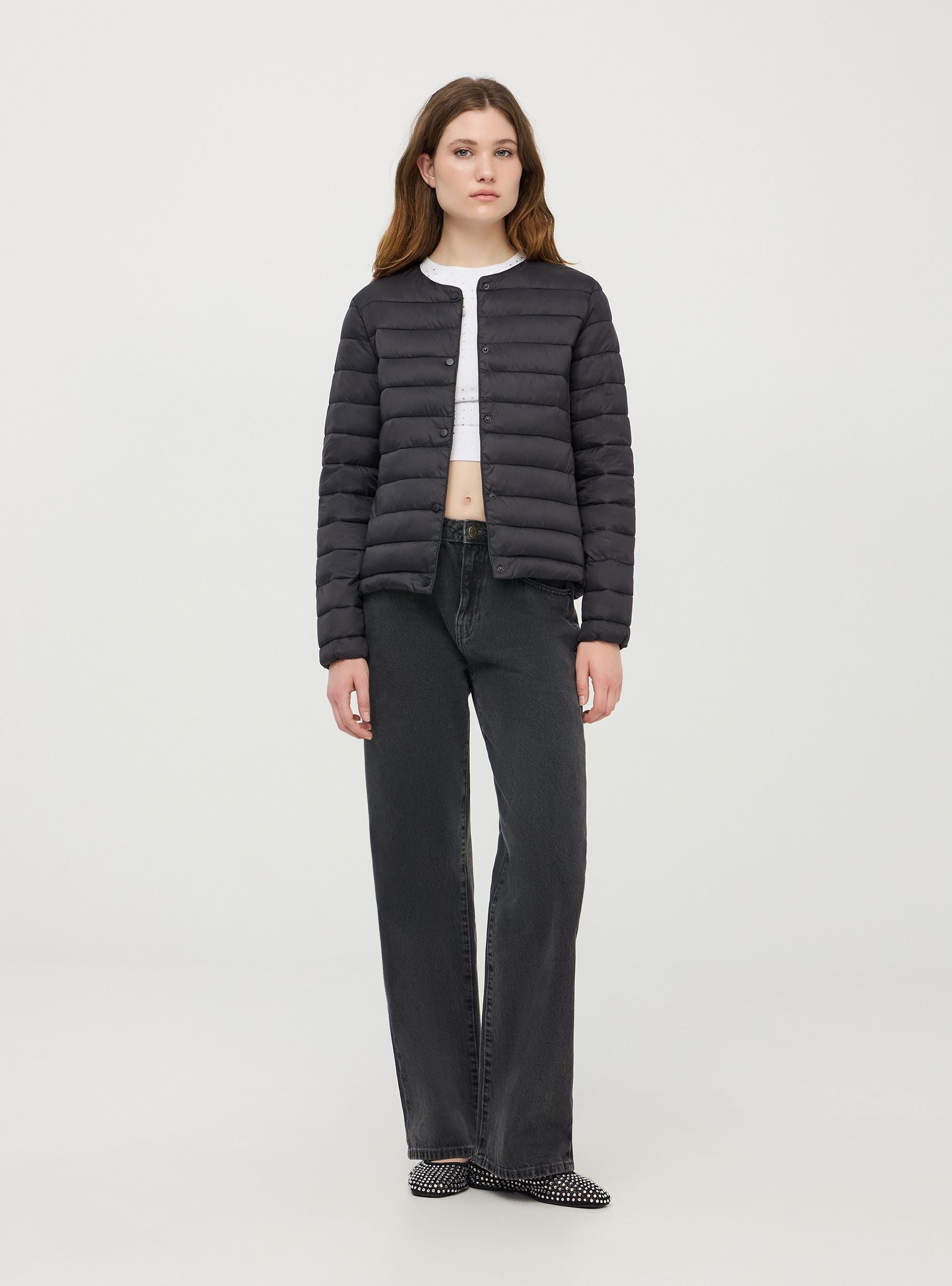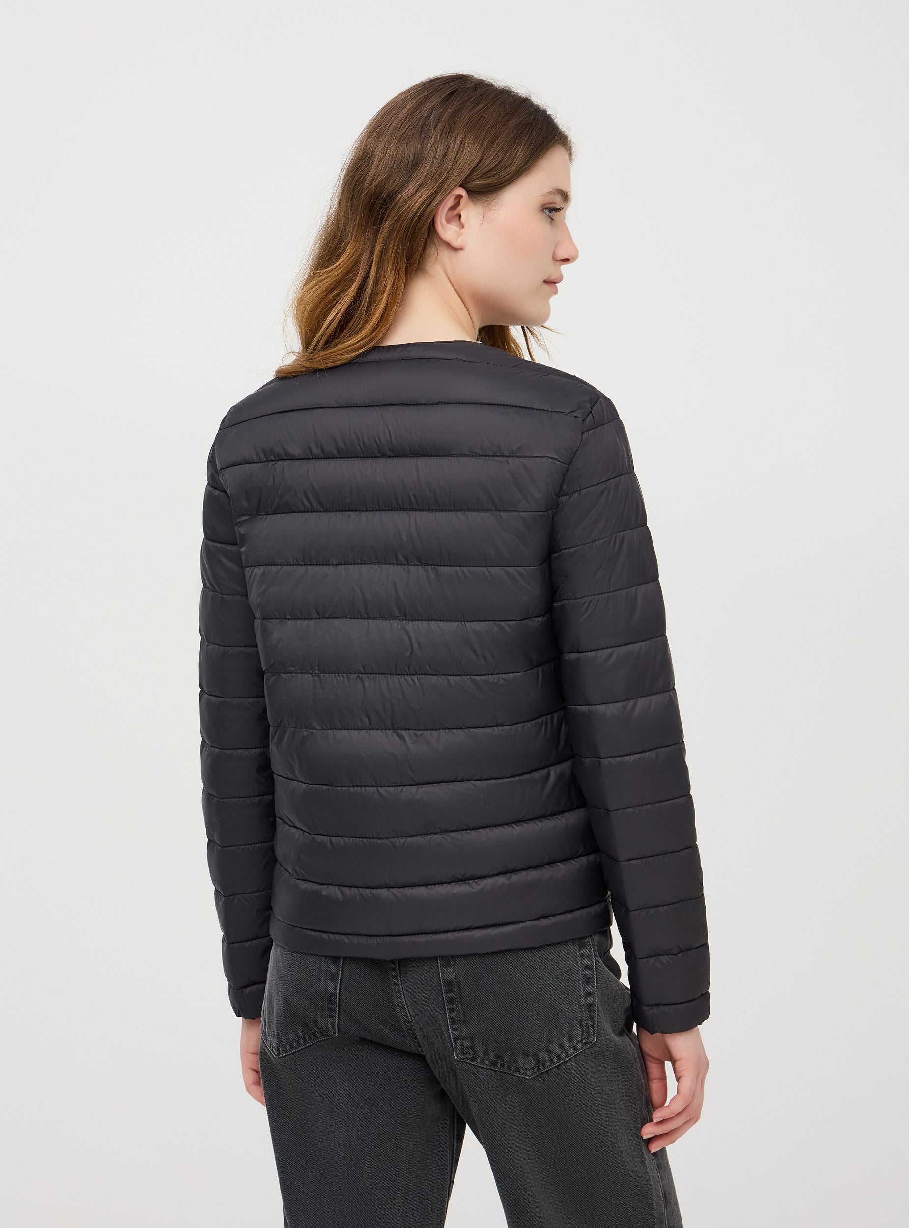 Kurtka damska z jednolitego nylonu z lekkim wypełnieniem. Idealna na półsezon lub pod płaszcze w chłodniejszym sezonie. Model z okrągłym dekoltem nadaje czysty i nowoczesny wygląd, łatwy do zestawienia z koszulami, swetrami lub topami, tworząc wszechstronny i elegancki outfit. Zapięcia na guziki z przodu w tym samym kolorze zapewniają szybkie i praktyczne zamknięcie, nadając minimalistyczny i wyrafinowany wygląd. Boczne kieszenie wpuszczane są idealne do przechowywania małych, niezbędnych przedmiotów, utrzymując linie kurtki czyste i nowoczesne. Regularne dopasowanie.