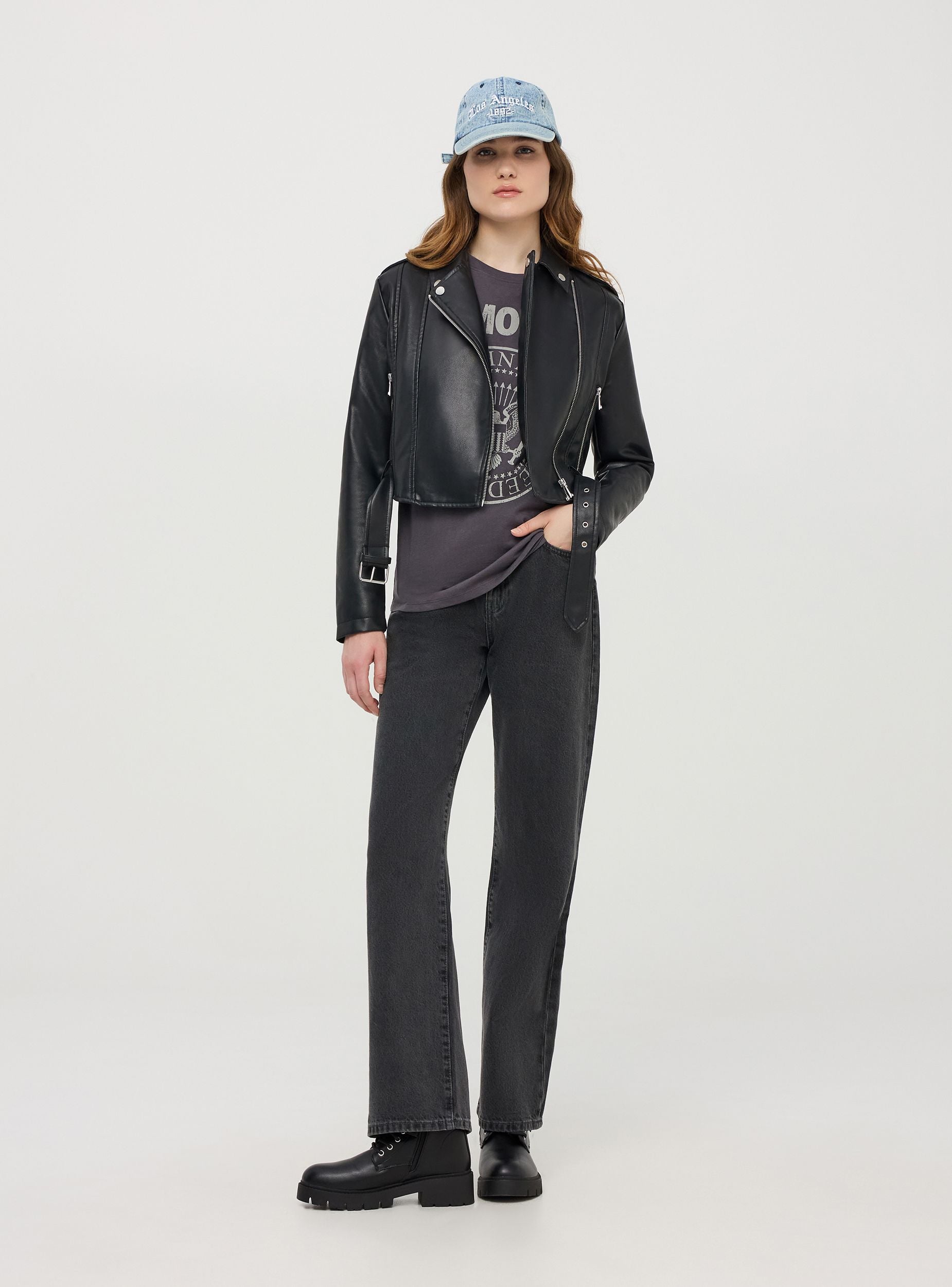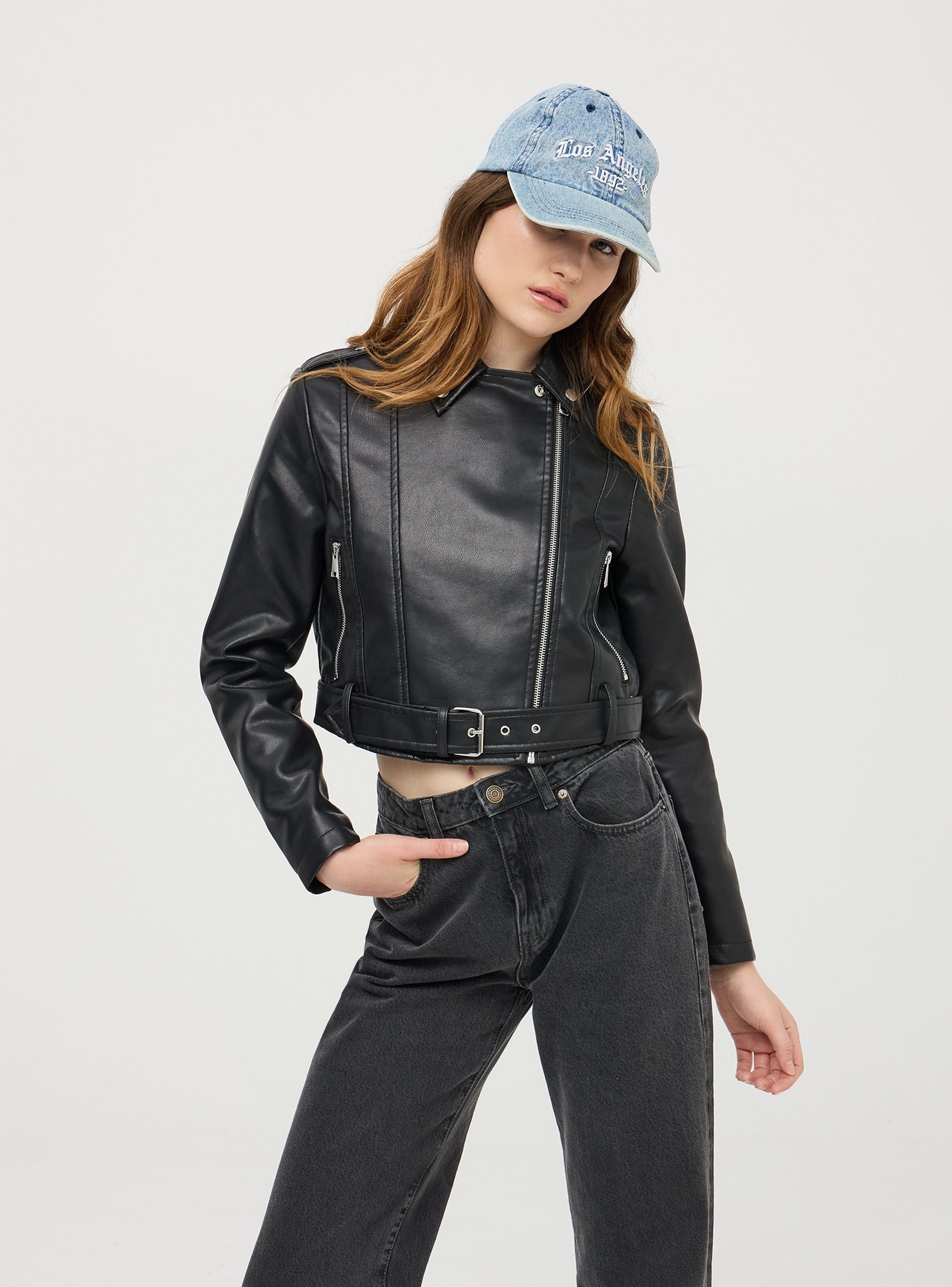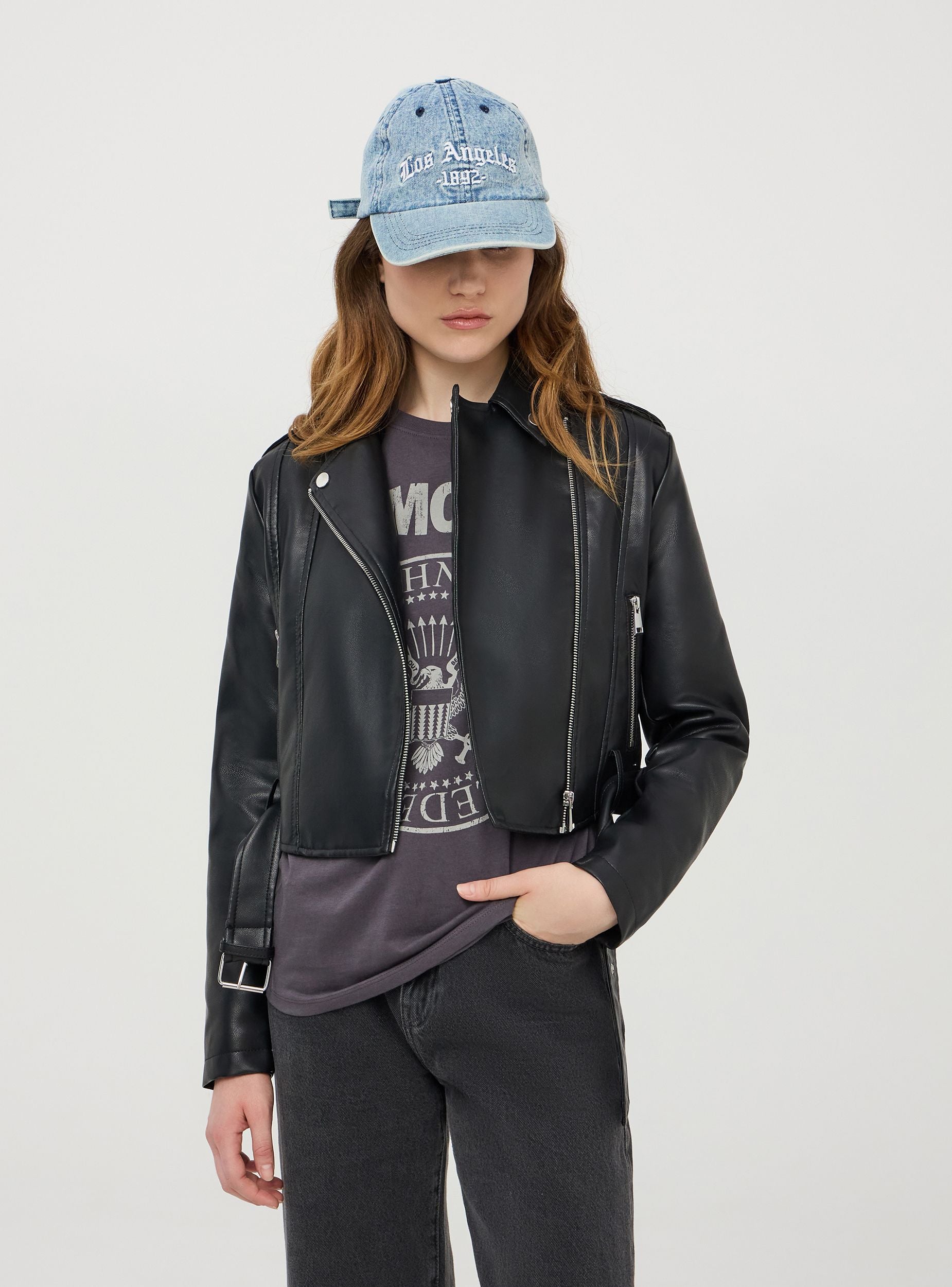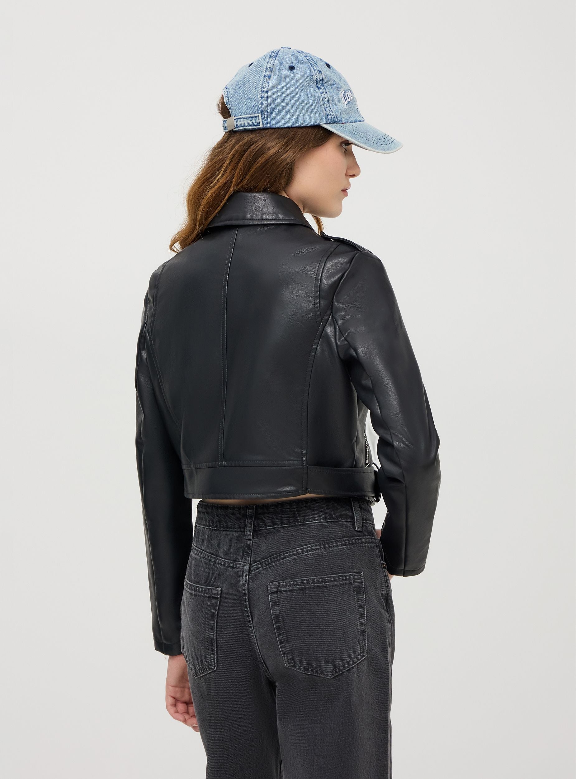 Kurtka damska, model ramoneska, z ekoskóry w jednolitym kolorze. Kurtka o krótkim i modnym kroju, inspirowana klasyczną kurtką motocyklową. Wykonana z materiału syntetycznego imitującego skórę, oferuje odważny i nowoczesny wygląd. Projekt zawiera ikoniczne detale, takie jak asymetryczne zamki błyskawiczne i pasek w talii. Krótkie dopasowanie kończy się nad talią, co czyni ją idealną do zestawienia z spodniami o wysokim stanie lub spódnicami. Doskonała do dodania rockowego i modnego akcentu do każdego stroju, to wszechstronny element odpowiedni na wieczorne wyjścia lub okazje casualowe.Szczegóły