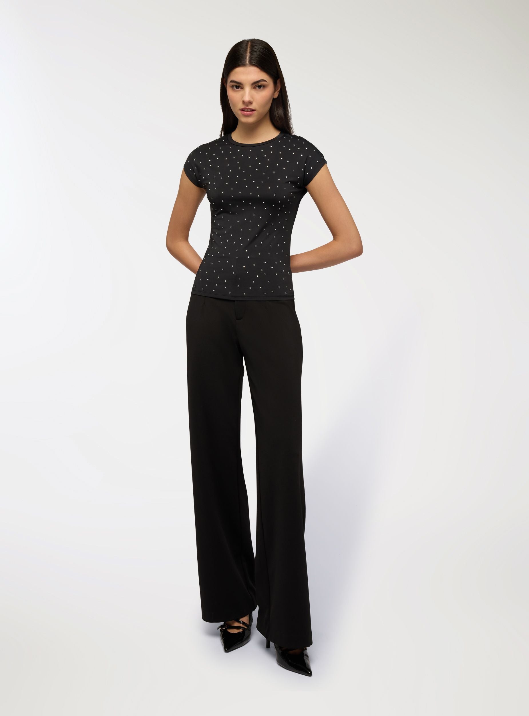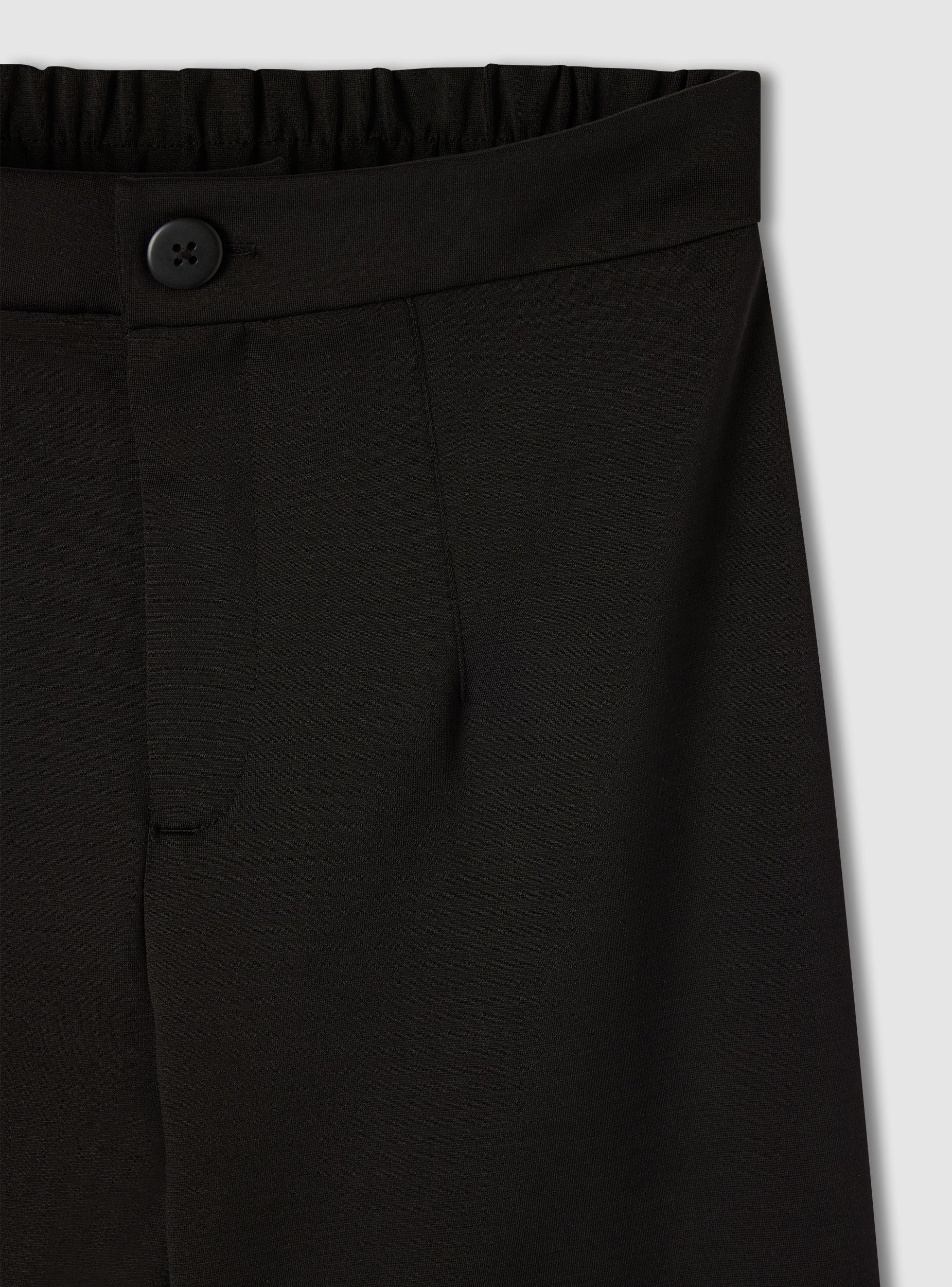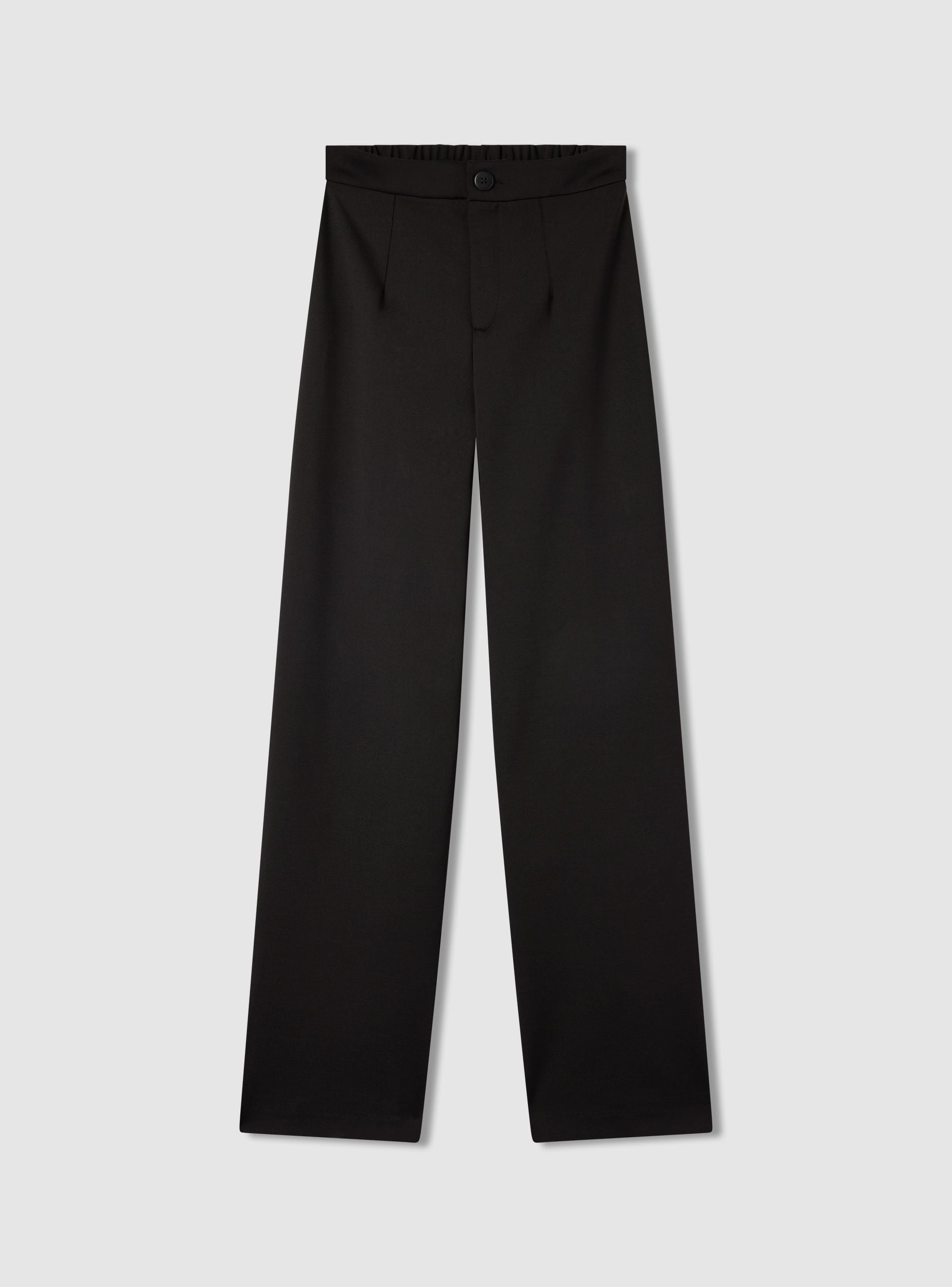 Spodnie damskie o szerokim kroju i fasonie typu wide leg. Idealne na formalne okazje lub elegancki wygląd. Posiadają zapięcie na guzik i suwak oraz elastyczną talię z tyłu dla optymalnego komfortu. Doskonałe do zestawienia z koszulami lub bluzkami, tworząc wyrafinowaną stylizację.