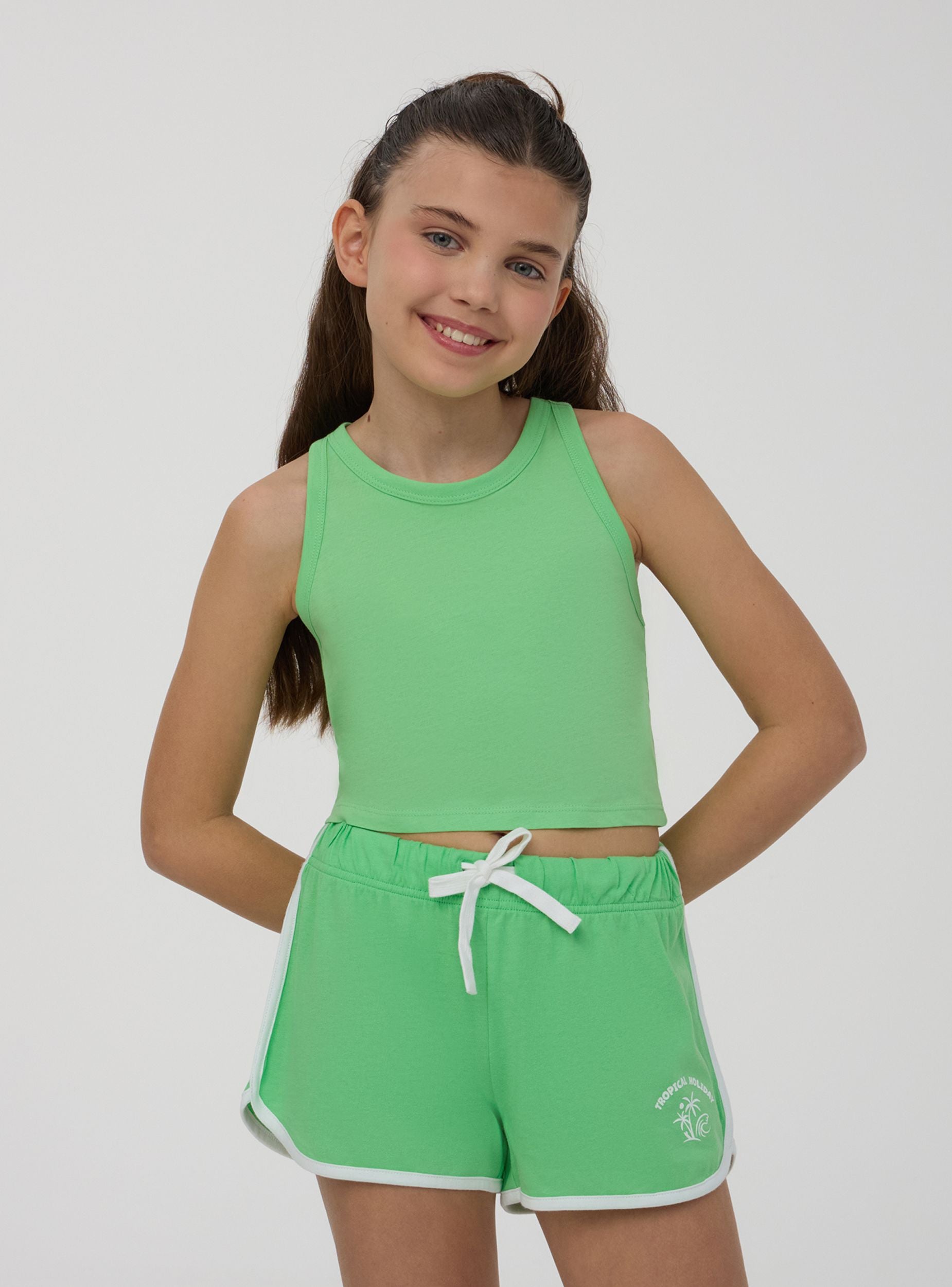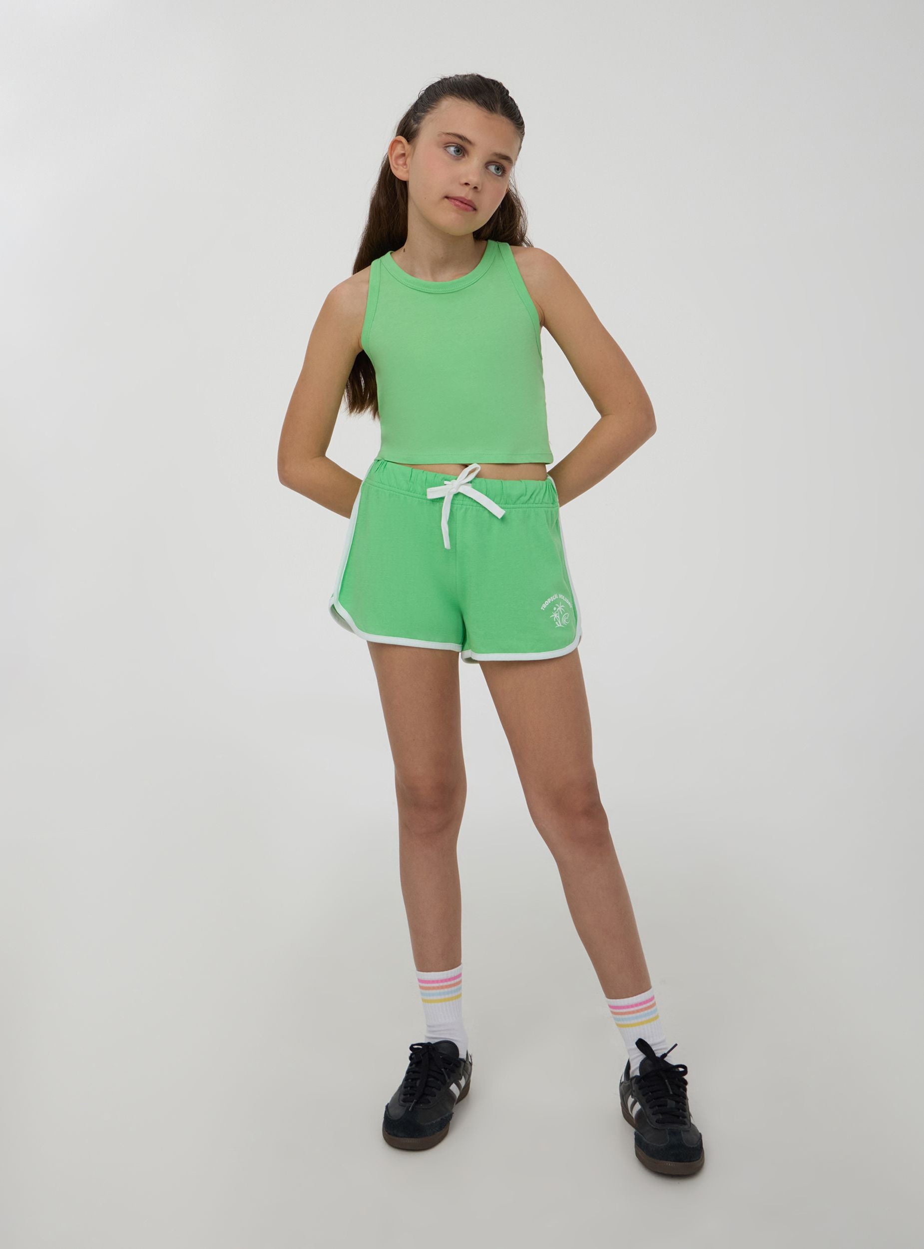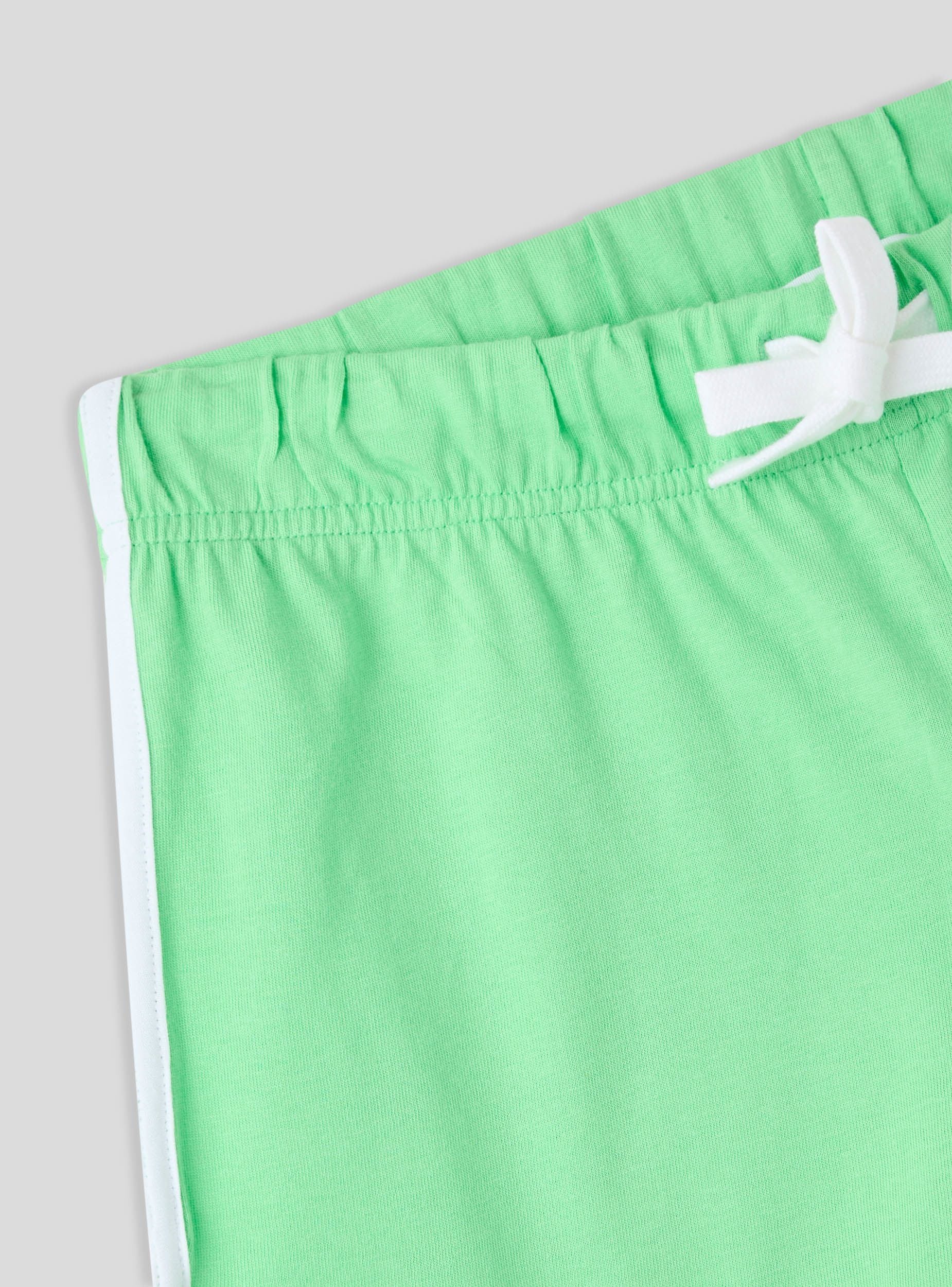 Szorty dla dziewczynek z żywym nadrukiem z przodu, charakteryzujące się prostym i praktycznym designem. Model posiada wygodną sznurówkę w talii, co zapewnia regulowane dopasowanie, idealne dla maksymalnego komfortu podczas zabawy lub codziennych aktywności. Kontrastowe wykończenia wzdłuż brzegów nadają stylu, sprawiając, że element jest bardziej dynamiczny i odpowiedni do casualowych zestawów. Krótki krój i miękka linia zapewniają swobodę ruchów, idealne na letnie dni.Szczegóły