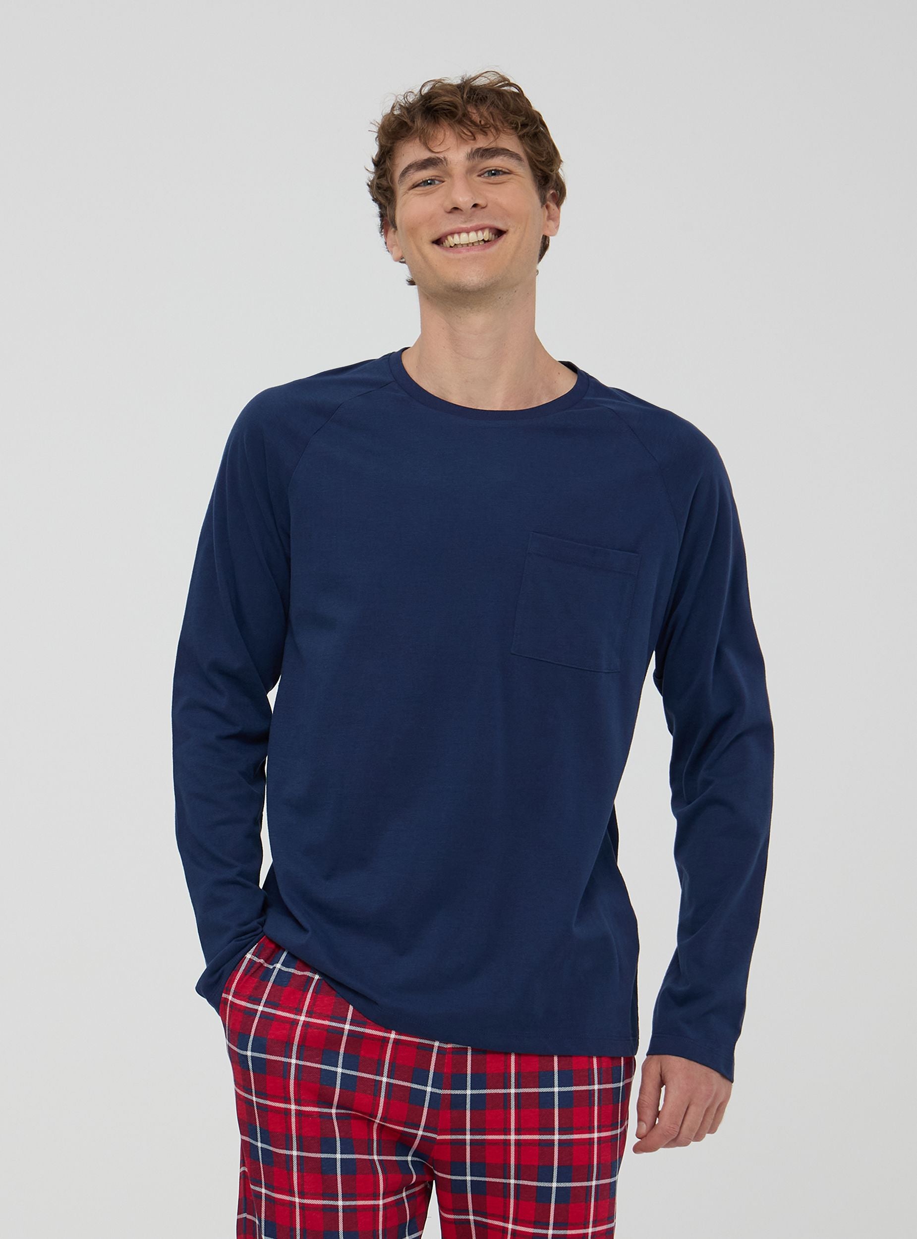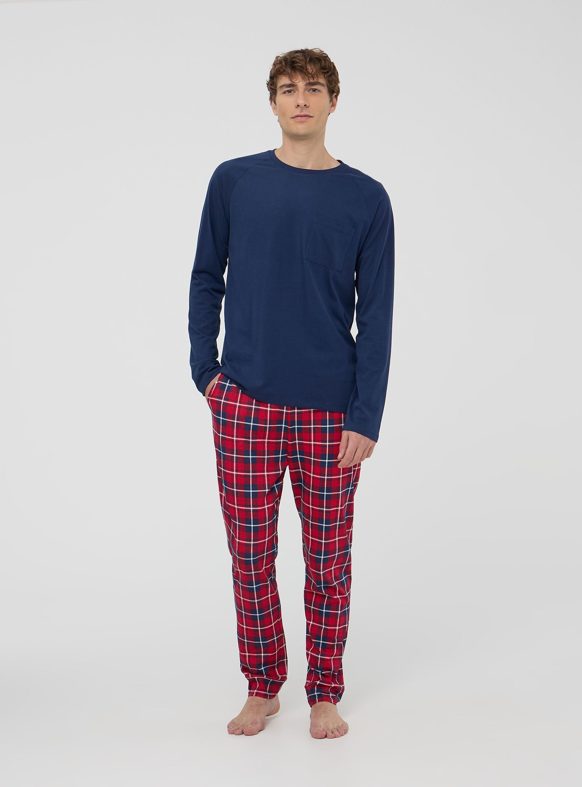 Ten męski piżama składa się z długiego rękawa koszulki i pary długich spodni, w całości wykonanych z miękkiej bawełny. Koszulka ma dekoracyjną kieszeń na piersi w kratkę, dopasowaną do spodni z nadrukiem all-over. Regularny krój dla maksymalnego komfortu. Spodnie mają praktyczne kieszenie boczne i elastyczny pas.Szczegóły
