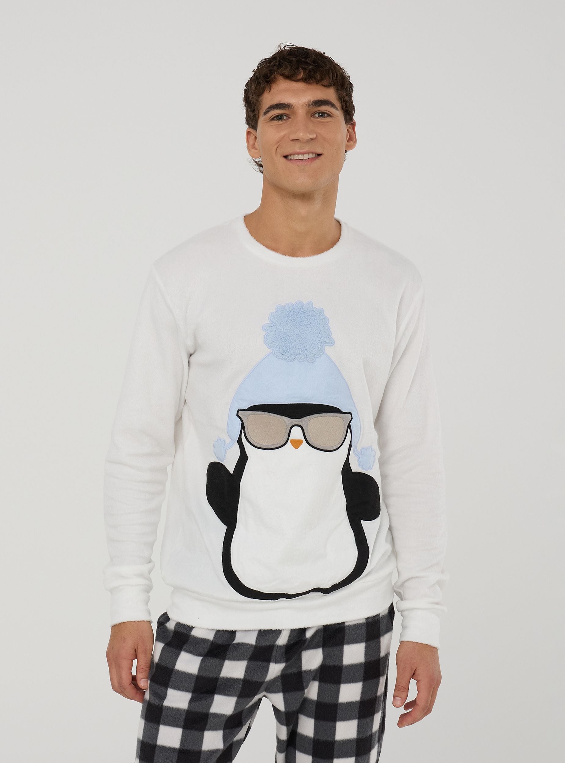 Piżama męskie składające się z długiego rękawa i długich spodni, idealne na zimne wieczory. Koszulka ma uroczy wzór z przodu przedstawiający pingwina w czapce z pomponem z sherpy i okulary przeciwsłoneczne. Spodnie, charakteryzujące się kratkowanym wzorem, zapewniają komfort i styl. Ten zestaw jest idealny dla tych, którzy szukają odrobiny sympatii i ciepła w swoim nocnym ubraniu. Doskonałe również jako pomysł na prezent.