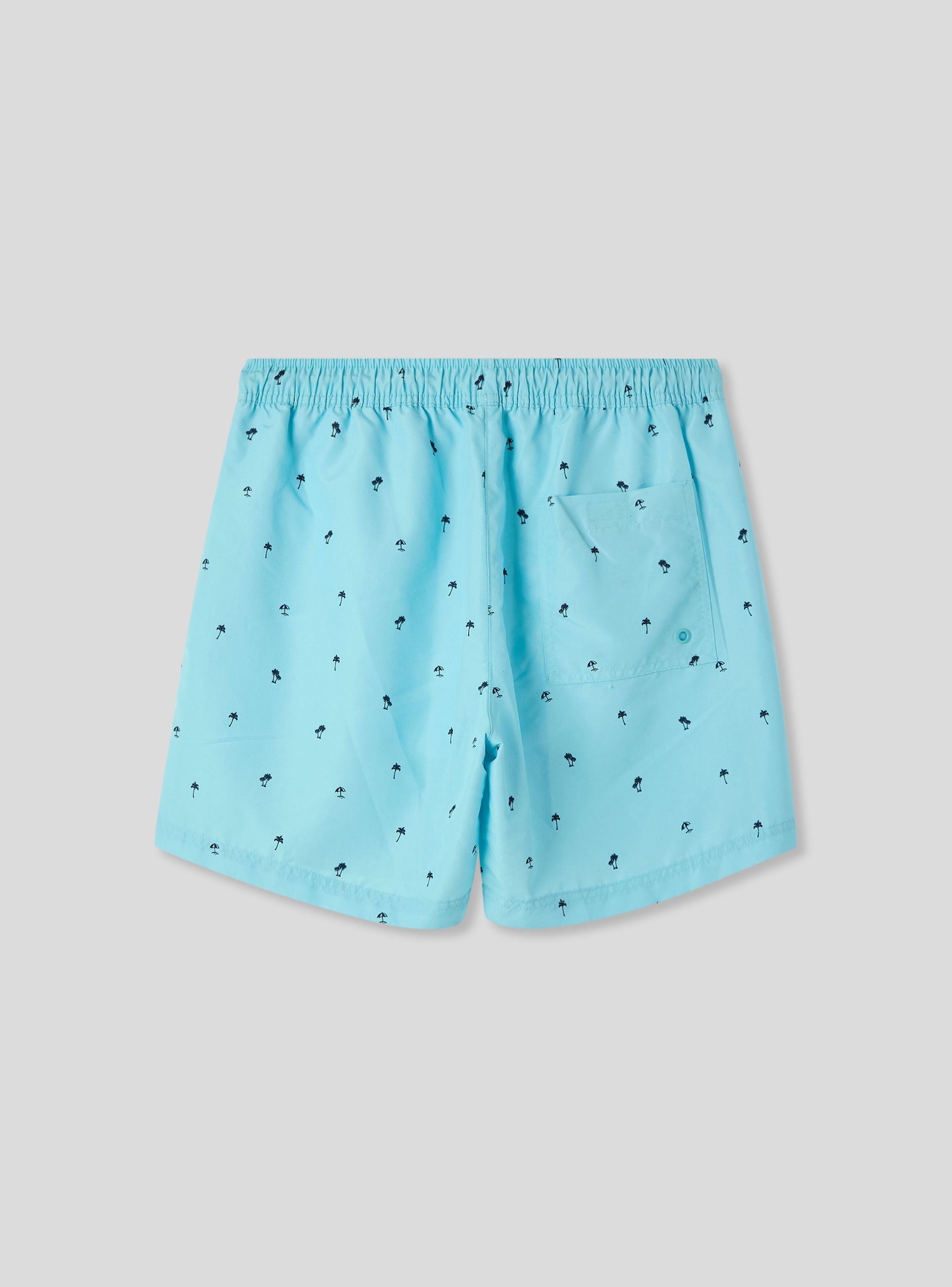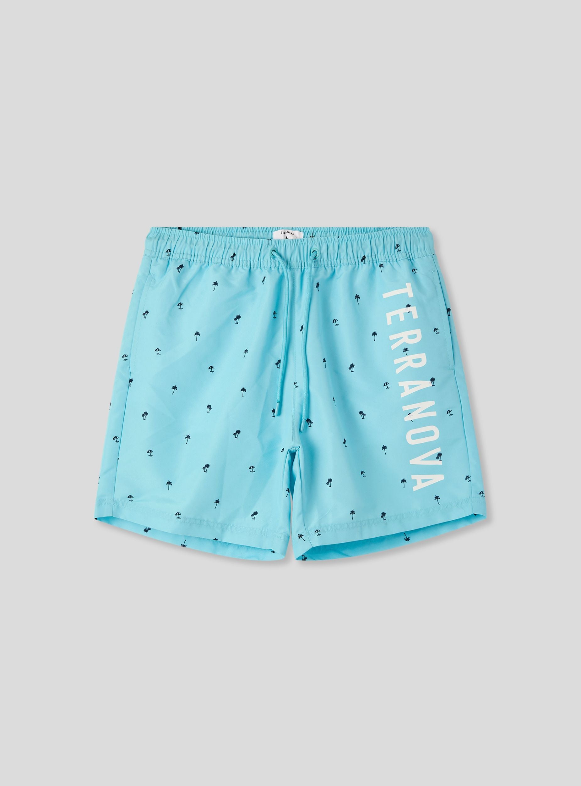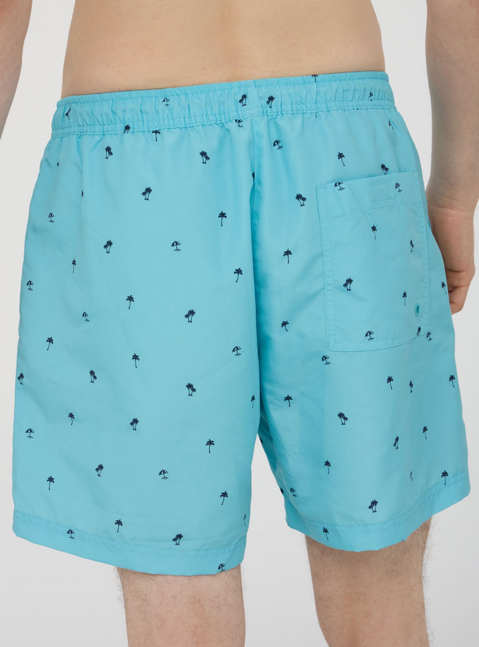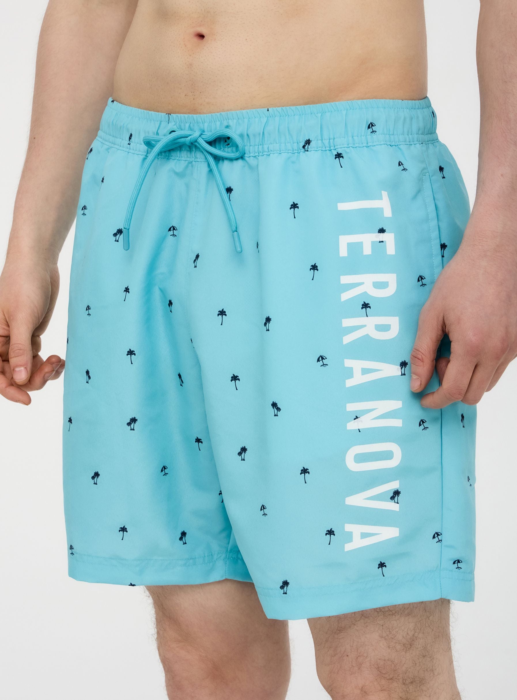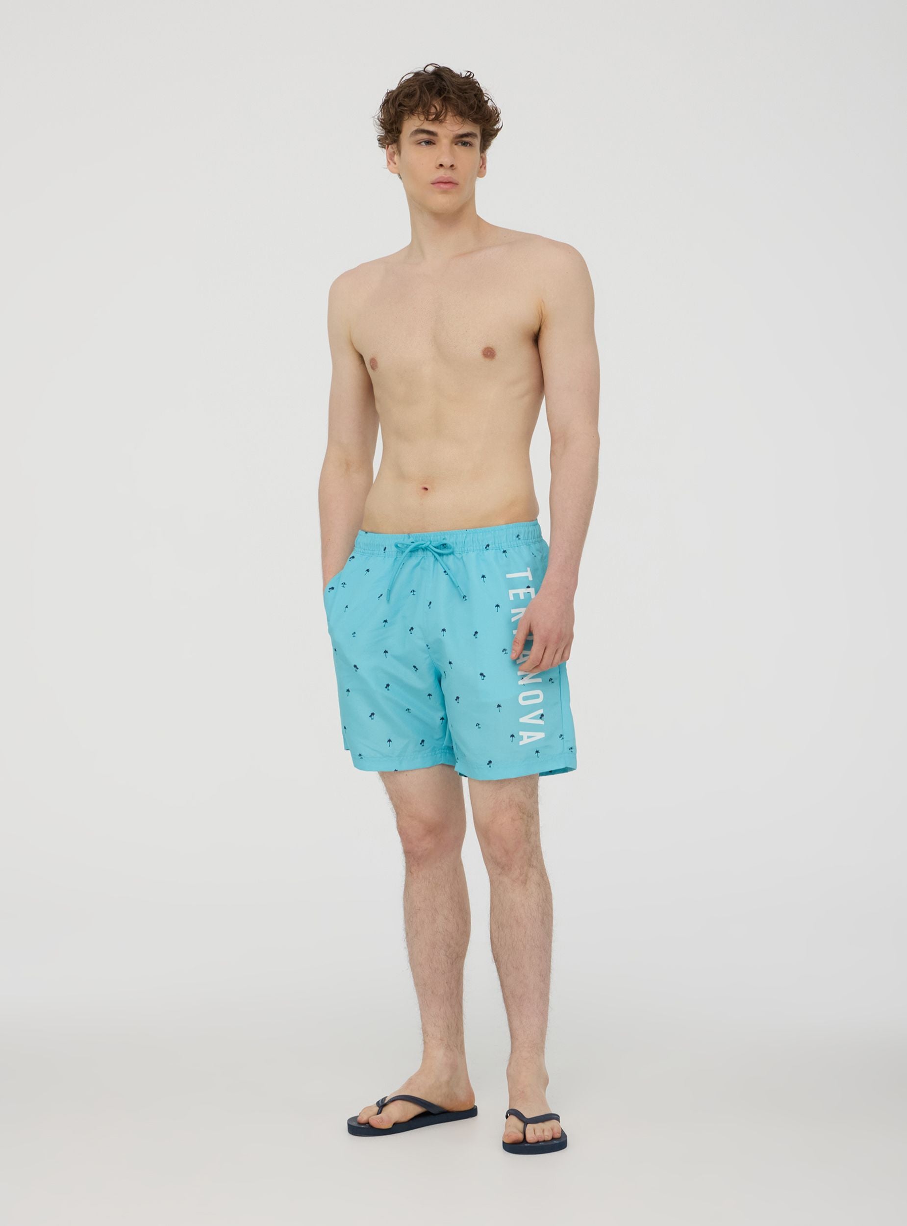 Bermudy męskie z mikrowzorem i kontrastowym logo. Wyposażone w boczne kieszenie i sznurek w talii, idealnie pasują do t-shirtów lub koszulek na ramiączkach, tworząc dynamiczny i casualowy letni look.