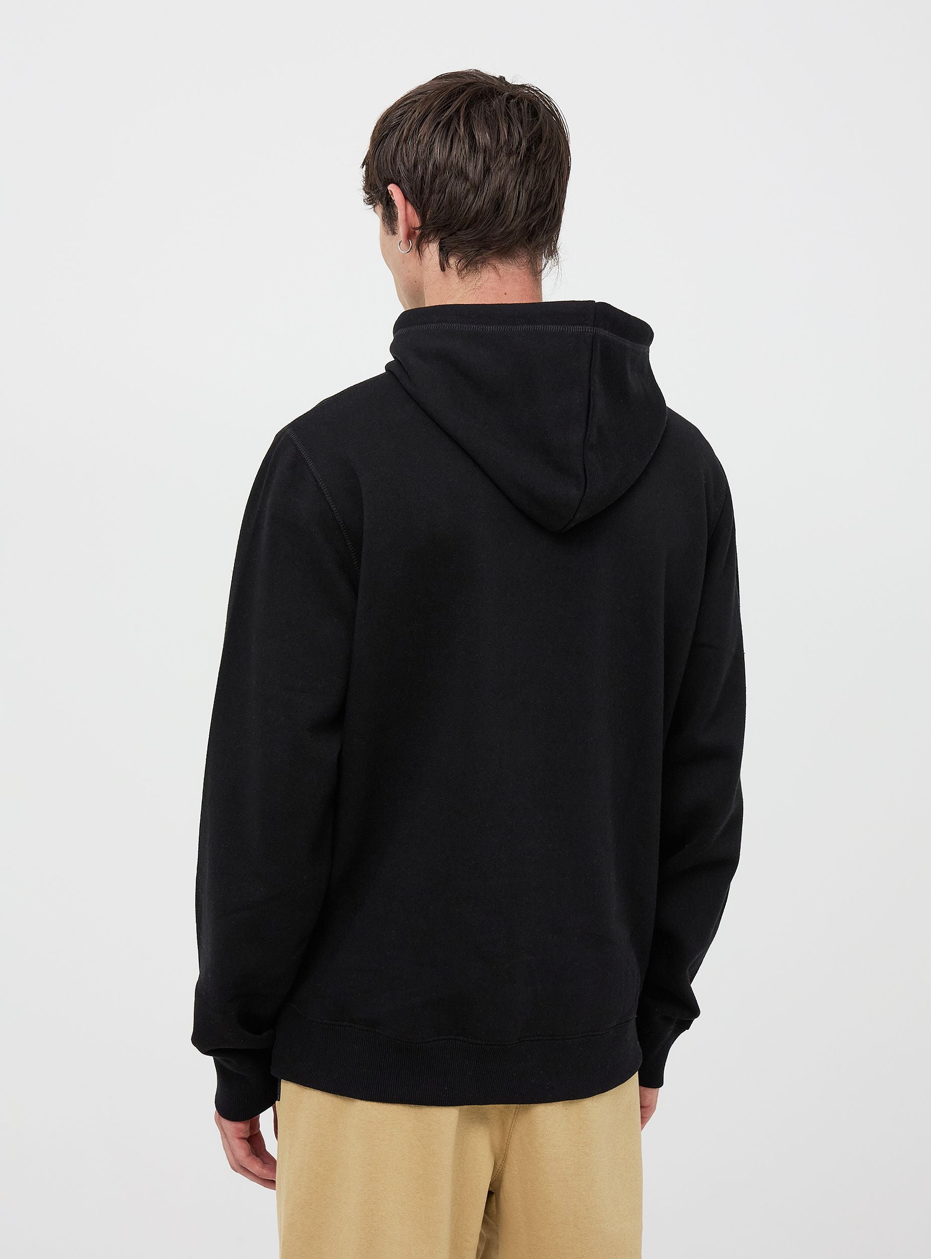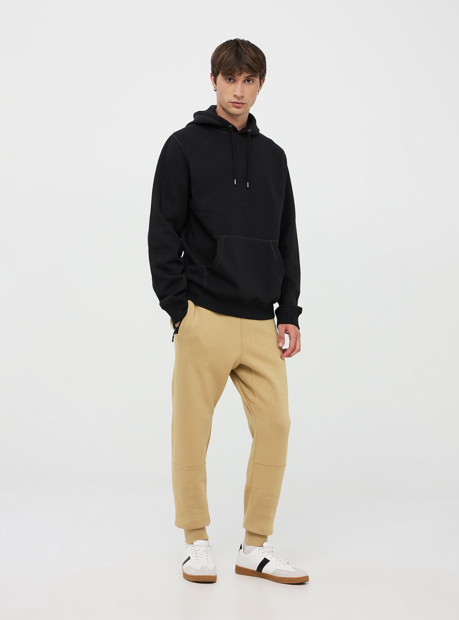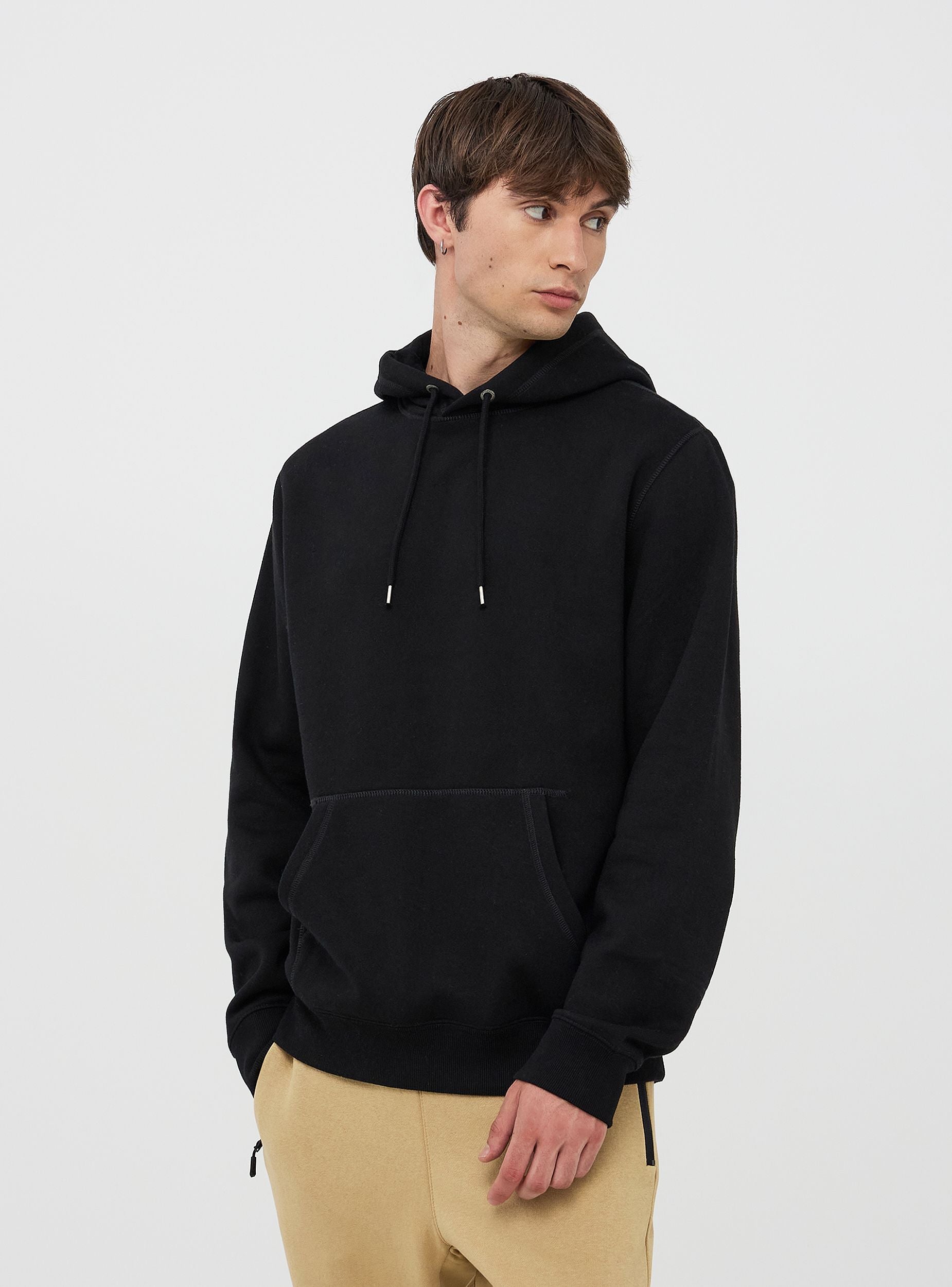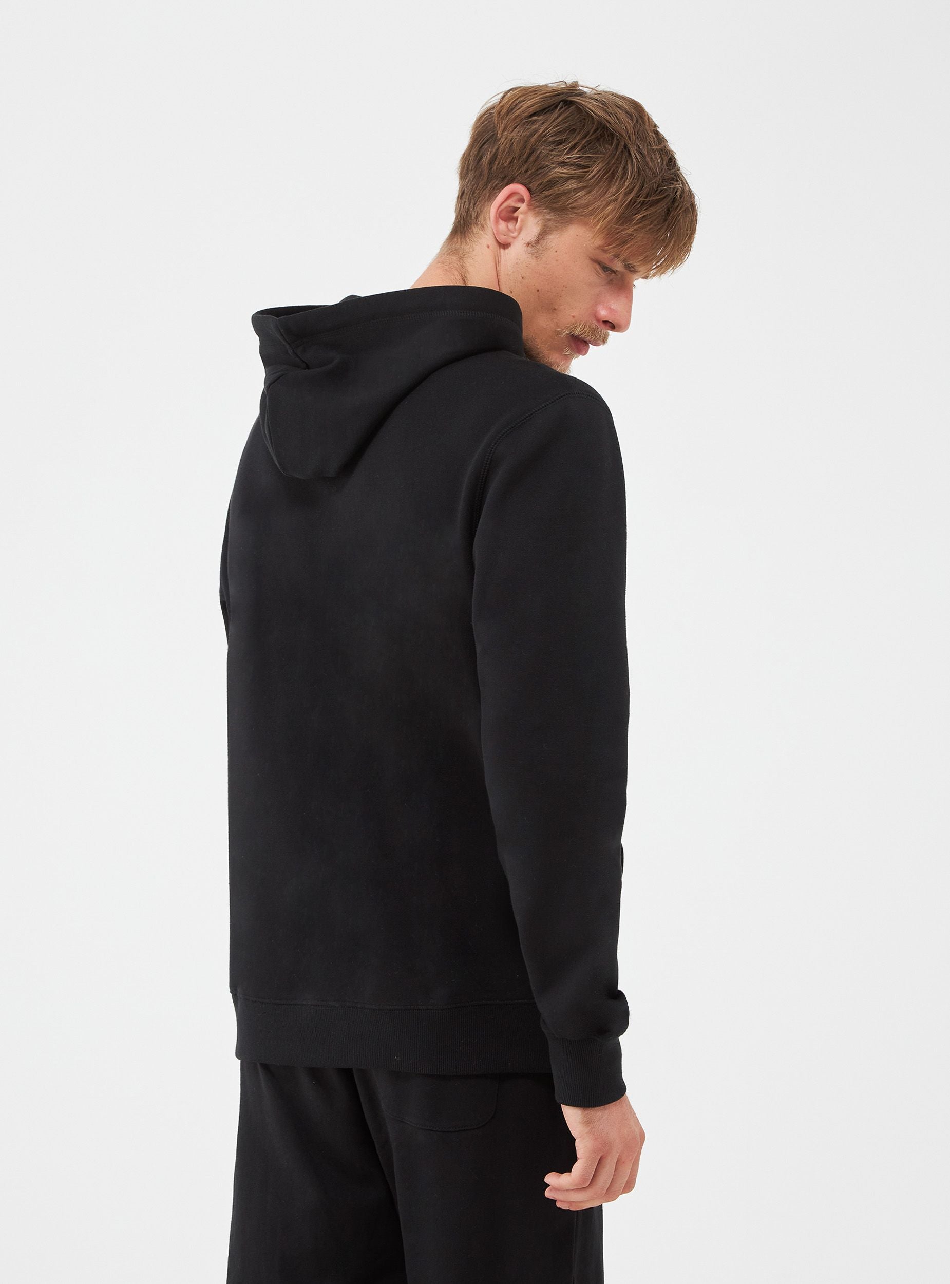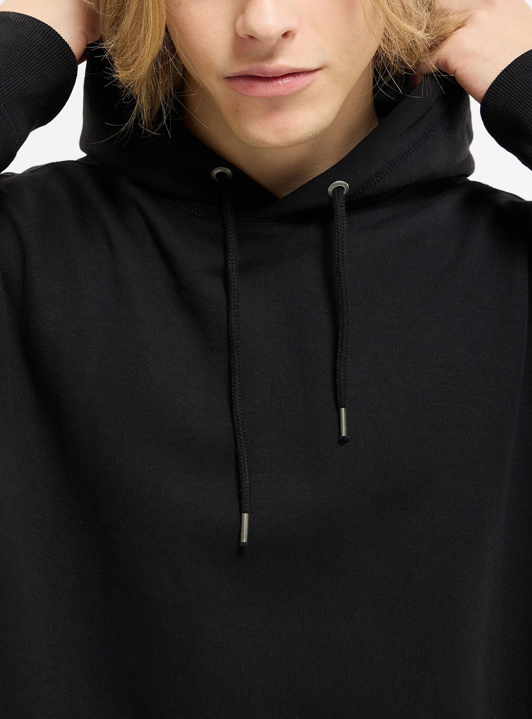 Męska bluza z kapturem. Model zamknięty z kapturem regulowanym za pomocą sznurka i długimi rękawami. Kieszeń z przodu typu kangur. Wykonana z ciężkiego jednolitego materiału. Regularny krój. Model ma 1,80 m wzrostu i nosi rozmiar XL.Szczegóły