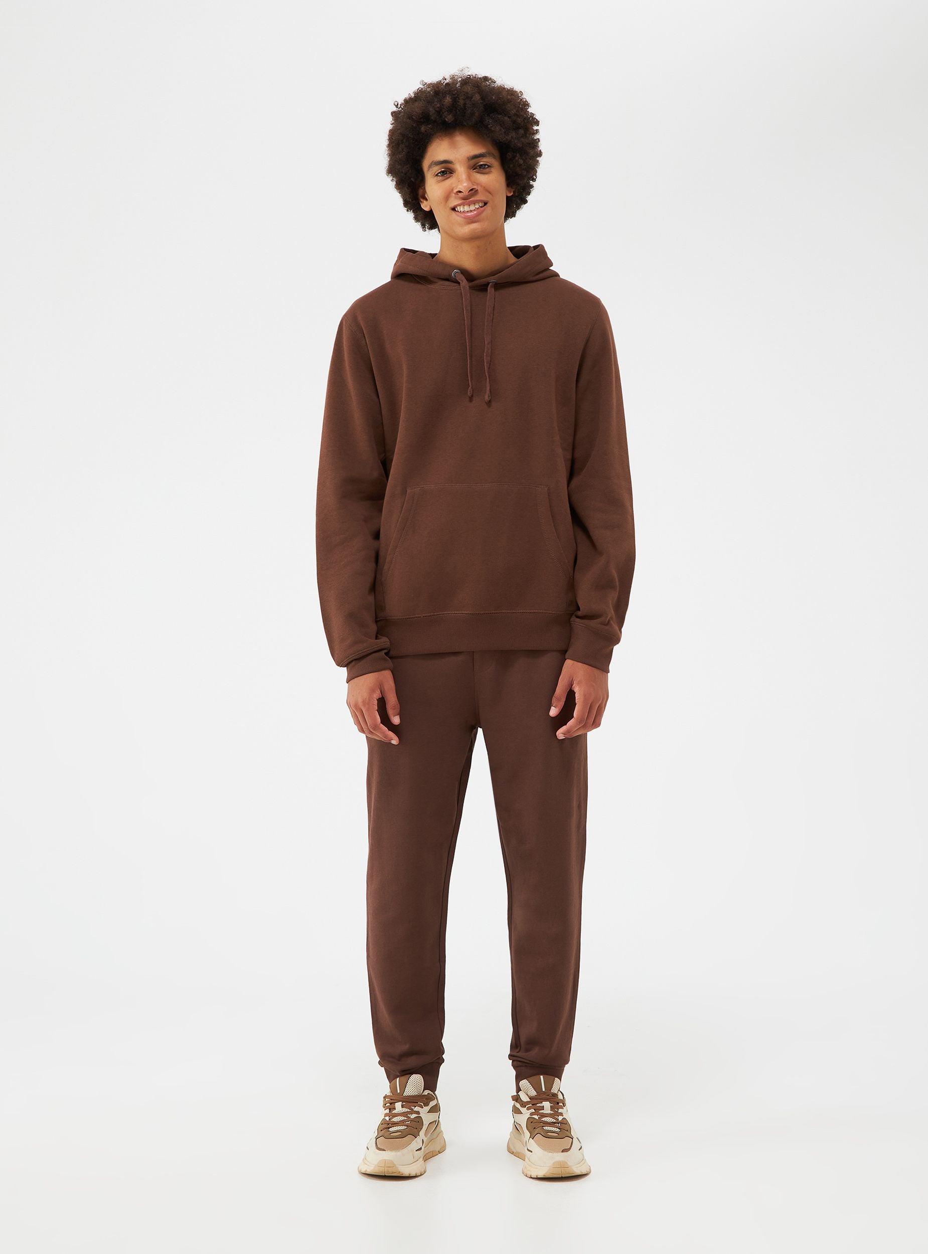Męska bluza z kapturem. Model zamknięty z kapturem regulowanym sznurkiem i długimi rękawami. Kieszeń z przodu typu kangur. Wykonana z ciężkiego materiału w jednolitym kolorze. Regularny krój.Szczegóły