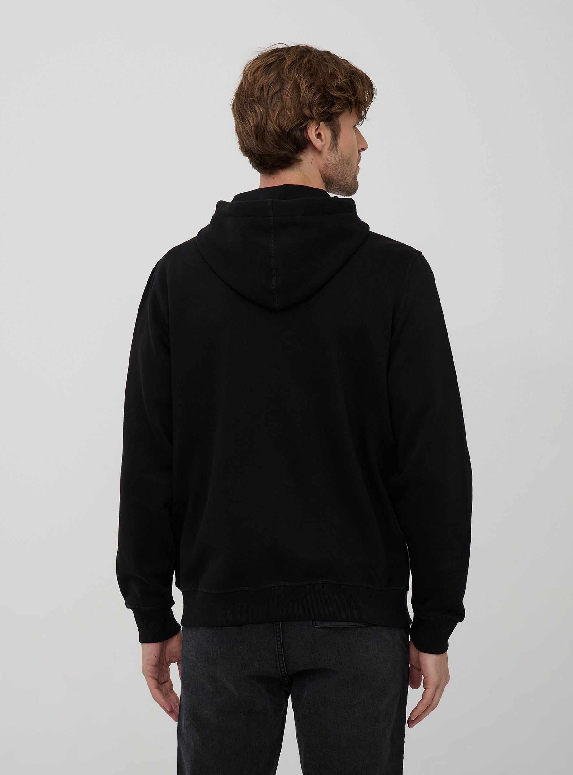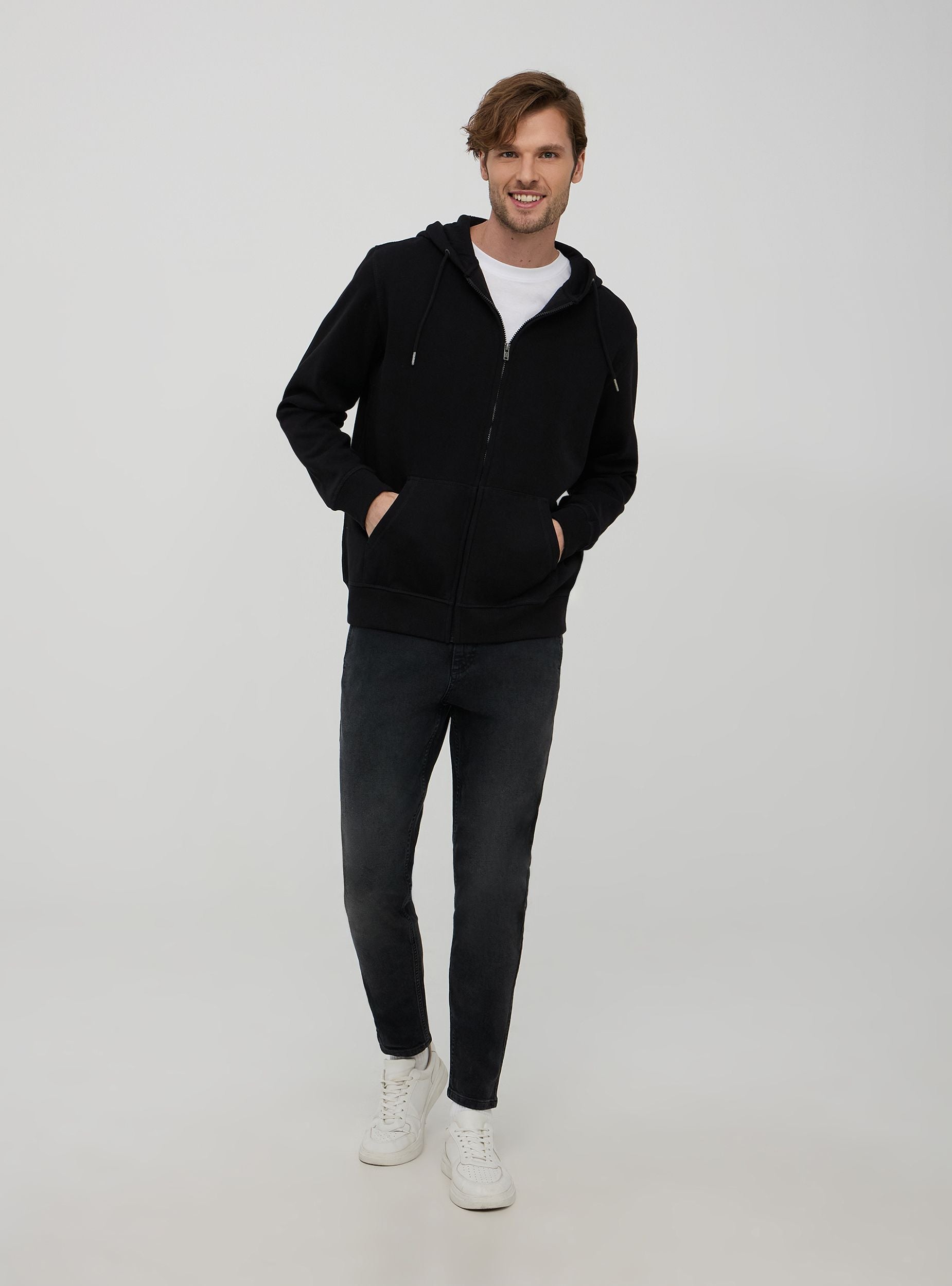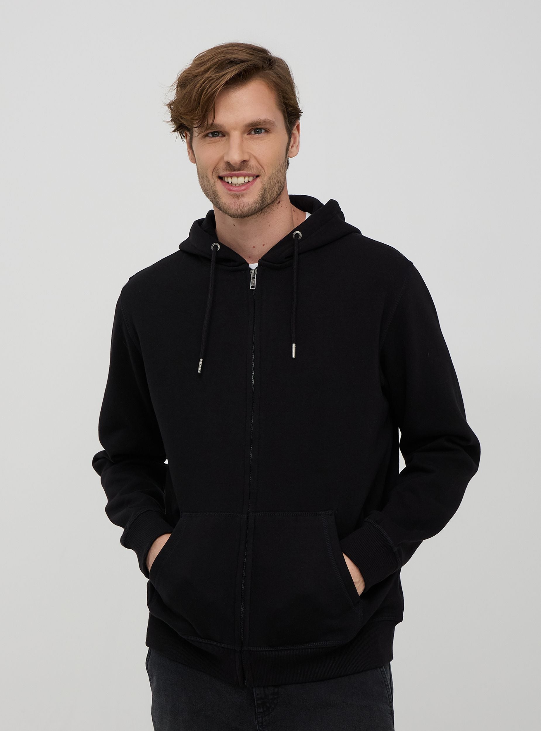 Męska bluza z kapturem z regulowanym sznurkiem, zamek błyskawiczny, kieszenie kangurze i wykończenia ściągaczem. Gruby materiał w jednolitym kolorze. Podstawowy element garderoby idealny na casualowy lub sportowy wygląd. Regularny krój.