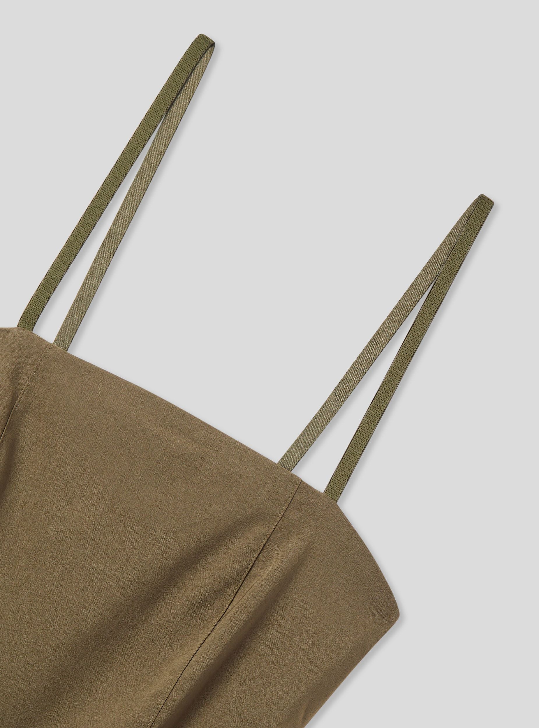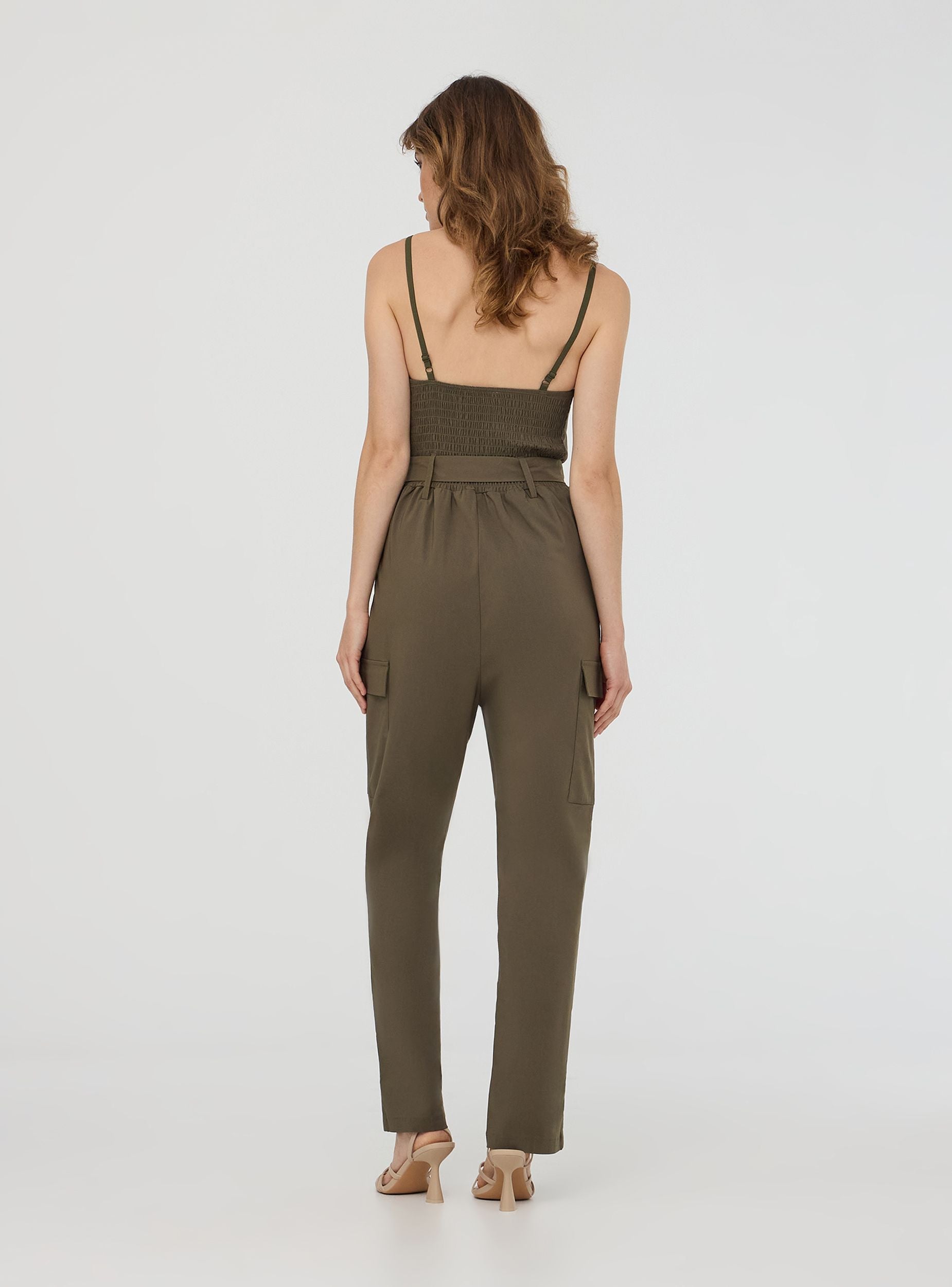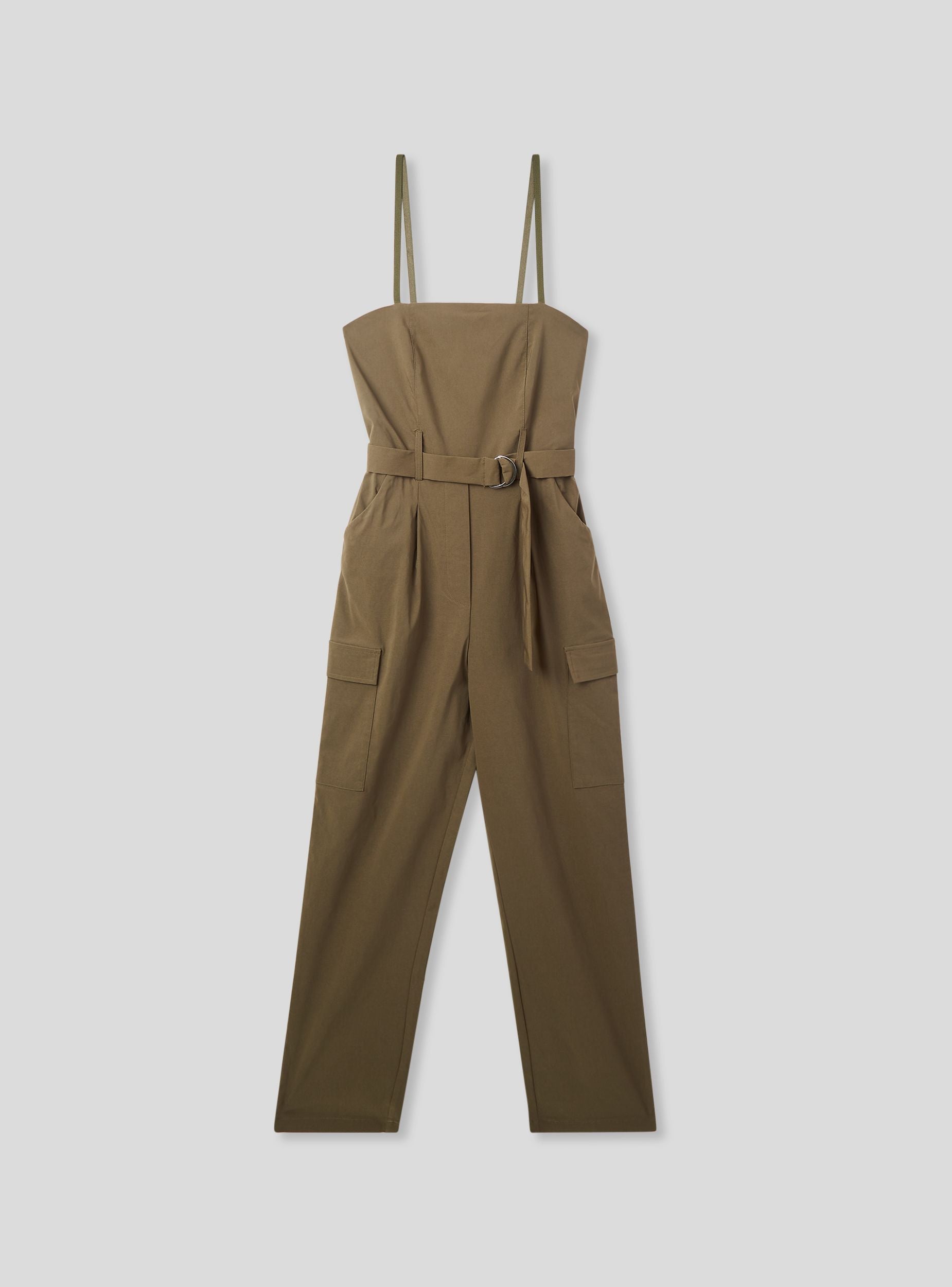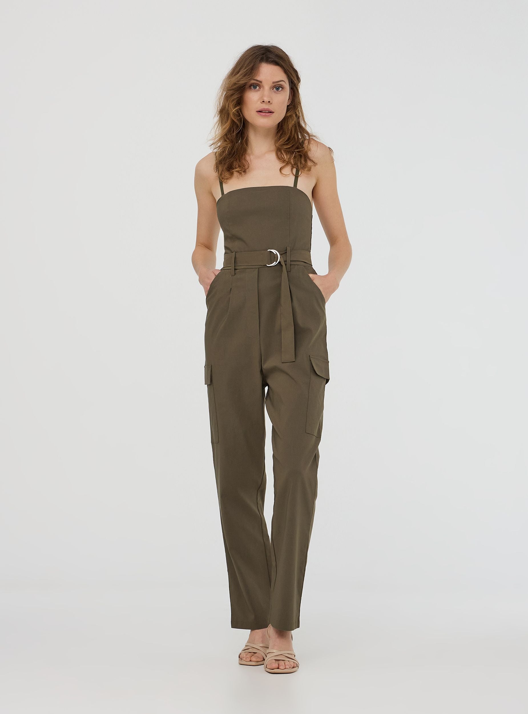 Długi kombinezon damski o eleganckim i praktycznym designie, charakteryzujący się jednolitym kolorem, który podkreśla jego prostą linię. Posiada cienkie, regulowane ramiączka, które zapewniają dopasowanie i komfort. Styl cargo objawia się w bocznych kieszeniach, dodając funkcjonalności i swobodnego charakteru. Wyposażony w pasek, który podkreśla talię, ten kombinezon jest idealny dla tych, którzy szukają wszechstronnej odzieży, odpowiedniej zarówno na dzień, jak i na wieczór.