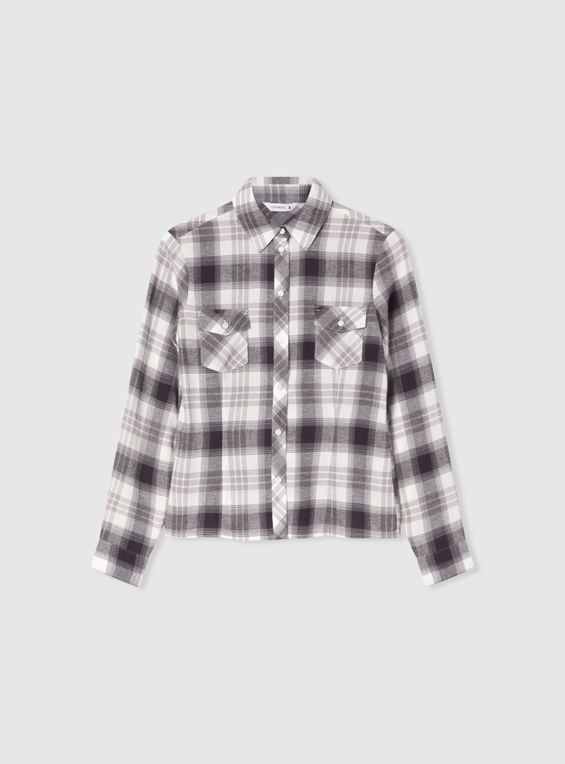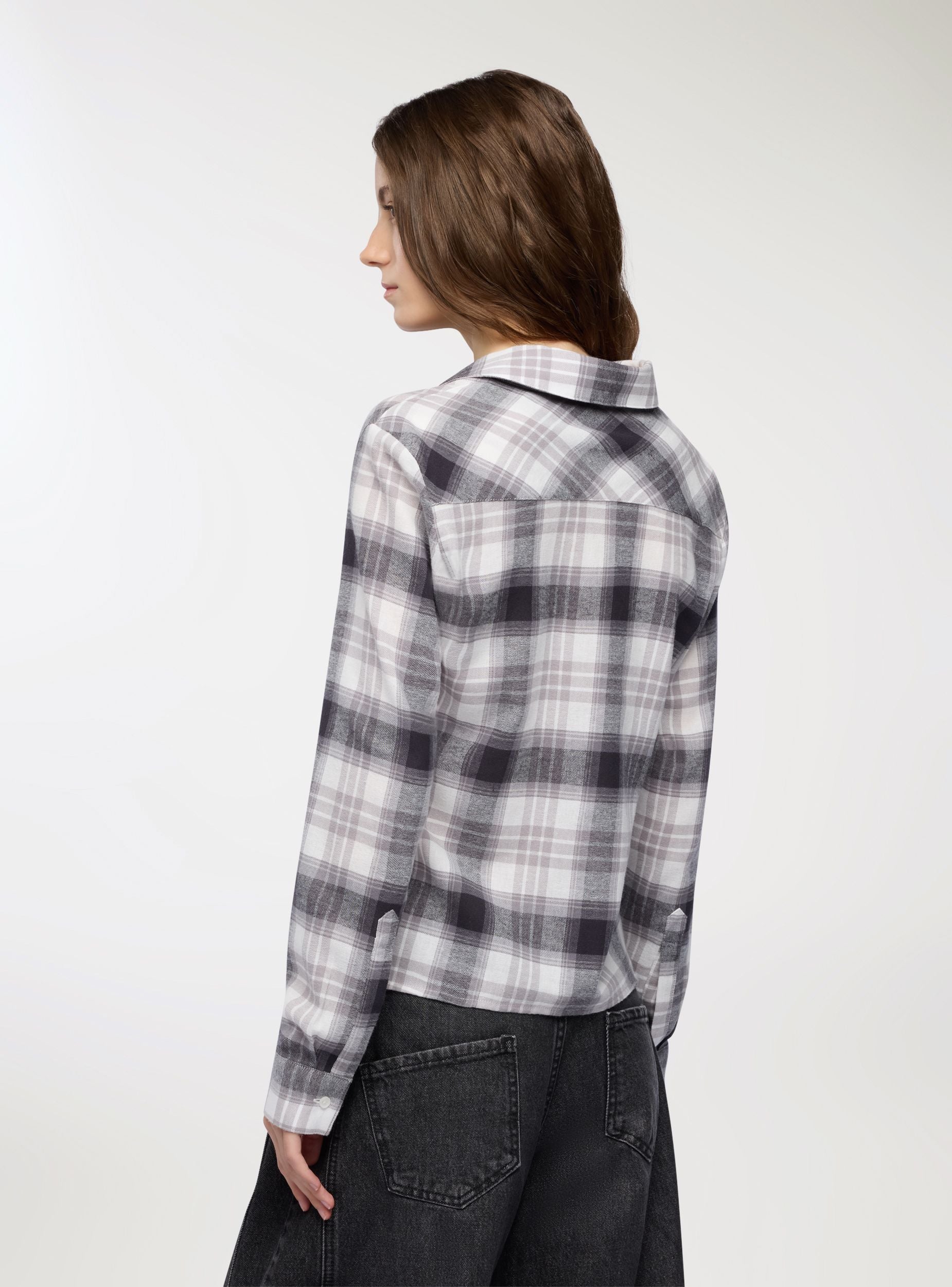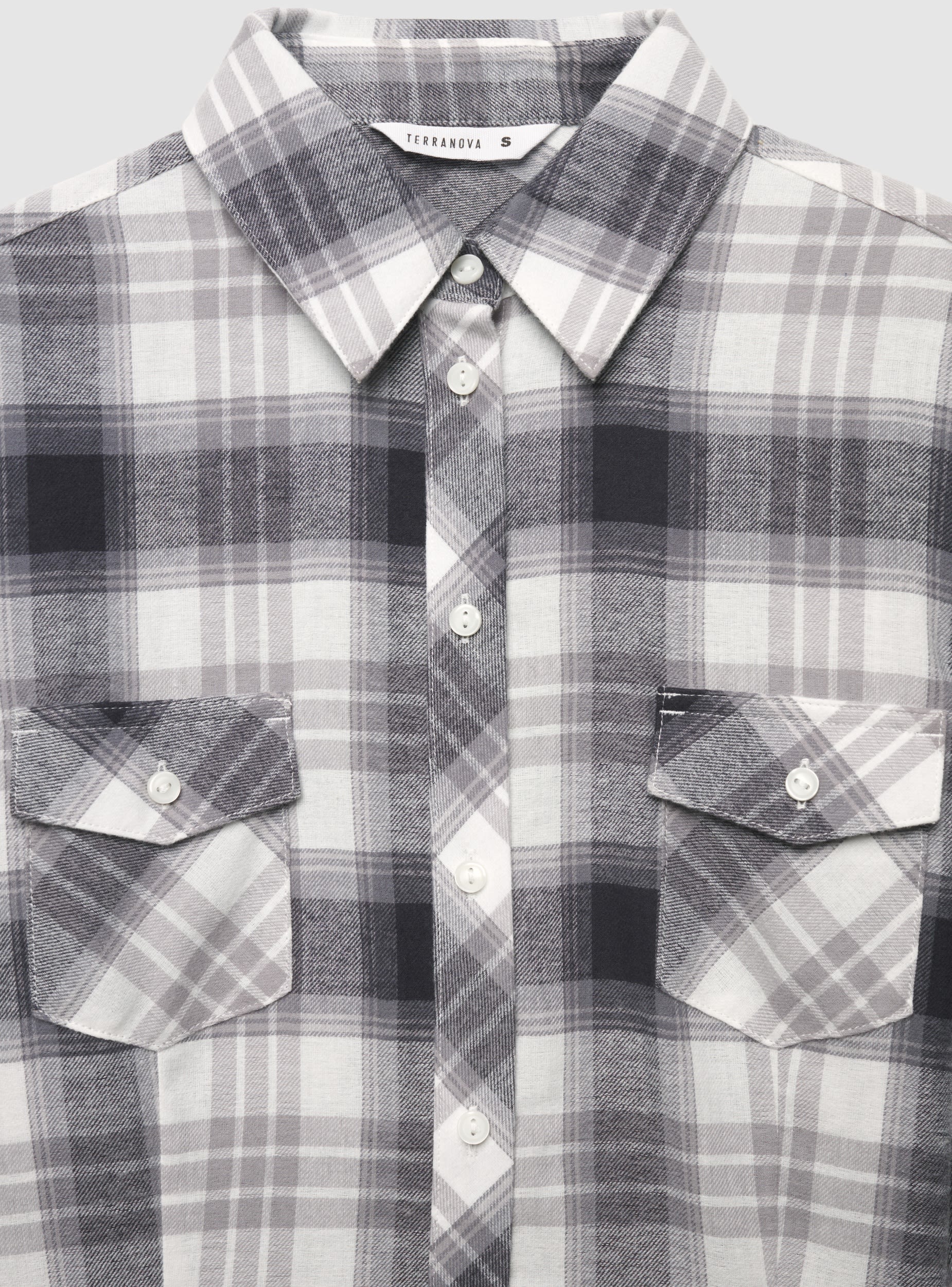 Koszula damska w kratę z klasycznym kołnierzykiem i długimi rękawami, zaprojektowana z myślą o casualowym i miejskim stylu. Zapięcie z przodu na widoczne guziki oraz dwie naszywane kieszonki na piersi z patką i guzikiem. Ramiona i tylny karczek z ukośnym wzorem podkreślającym linię, regularny krój i standardowa długość, idealna do noszenia rozpięta na koszulce lub włożona do jeansów i spódnic.Szczegóły