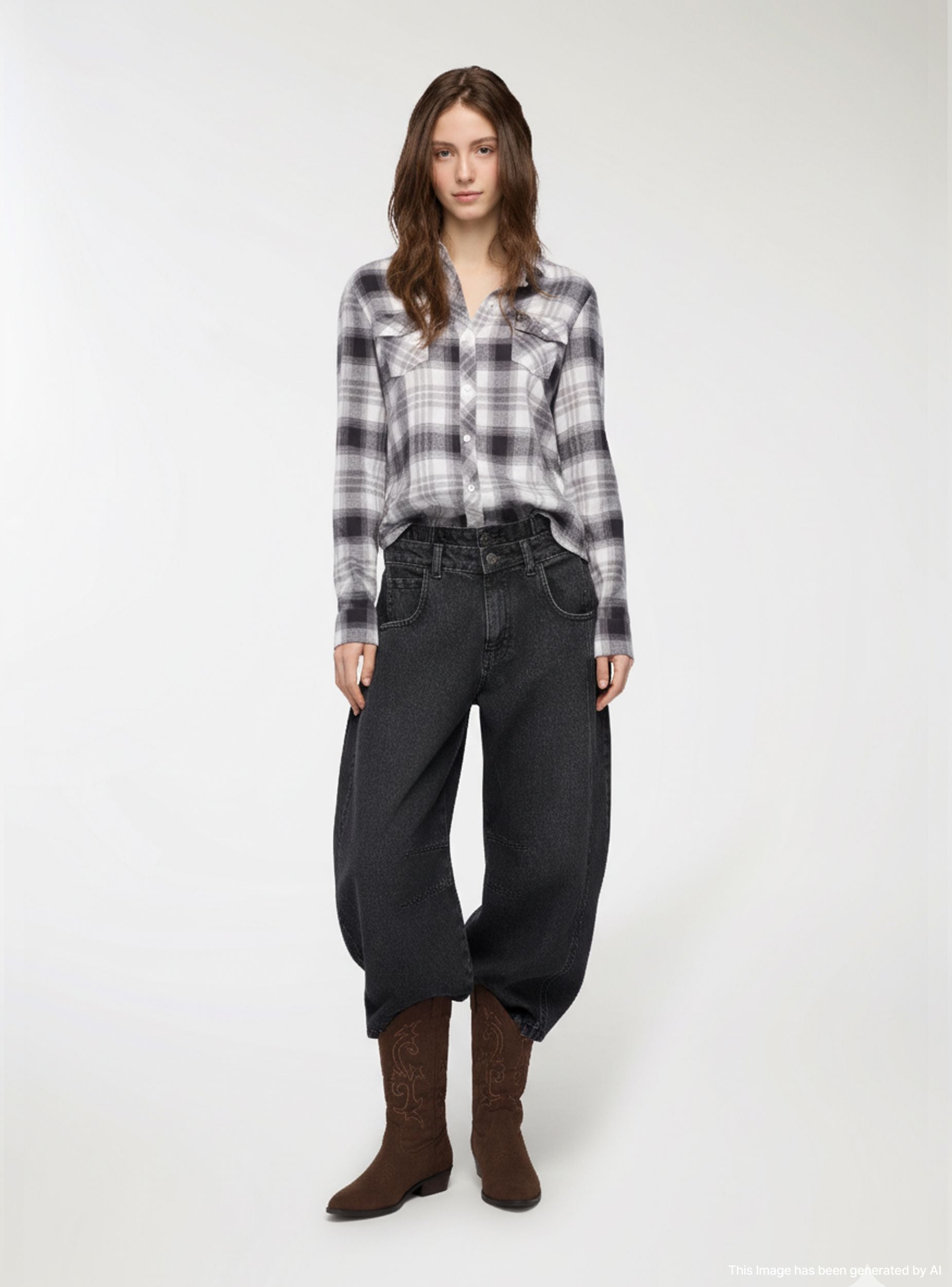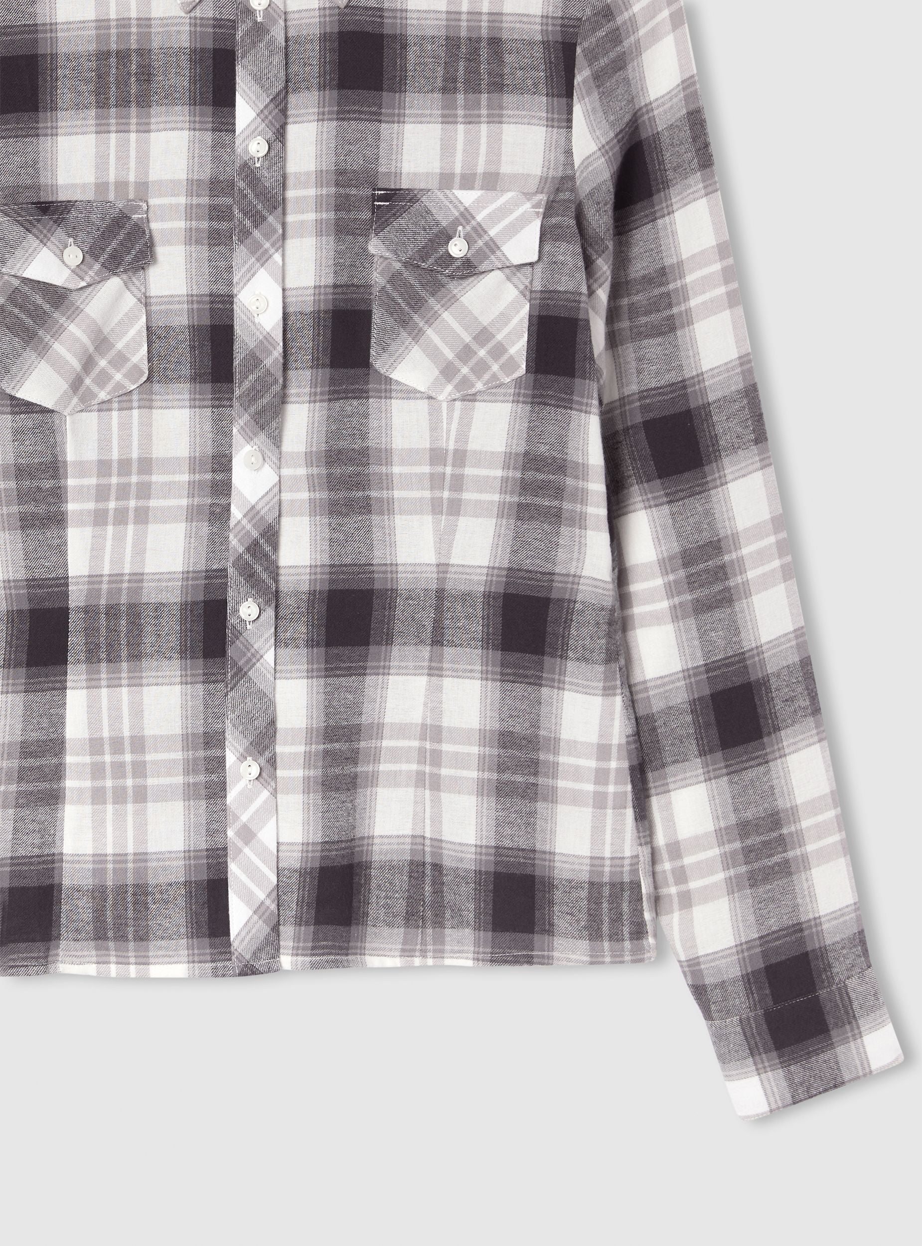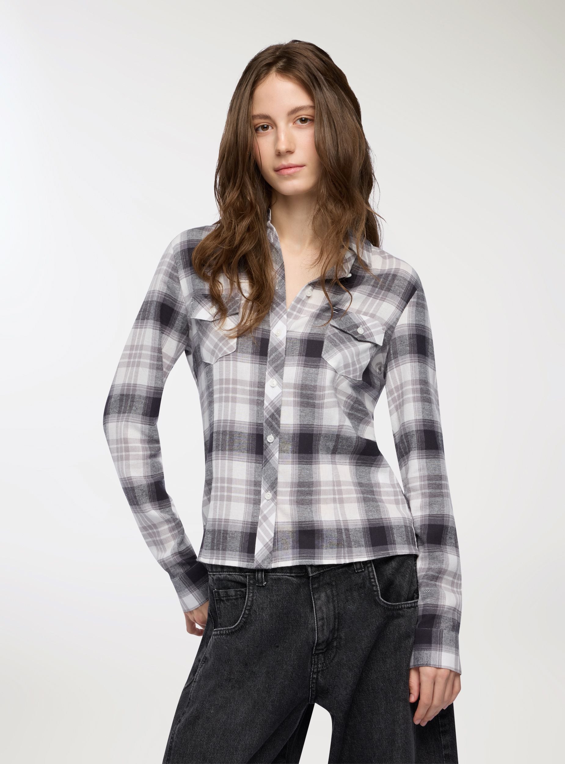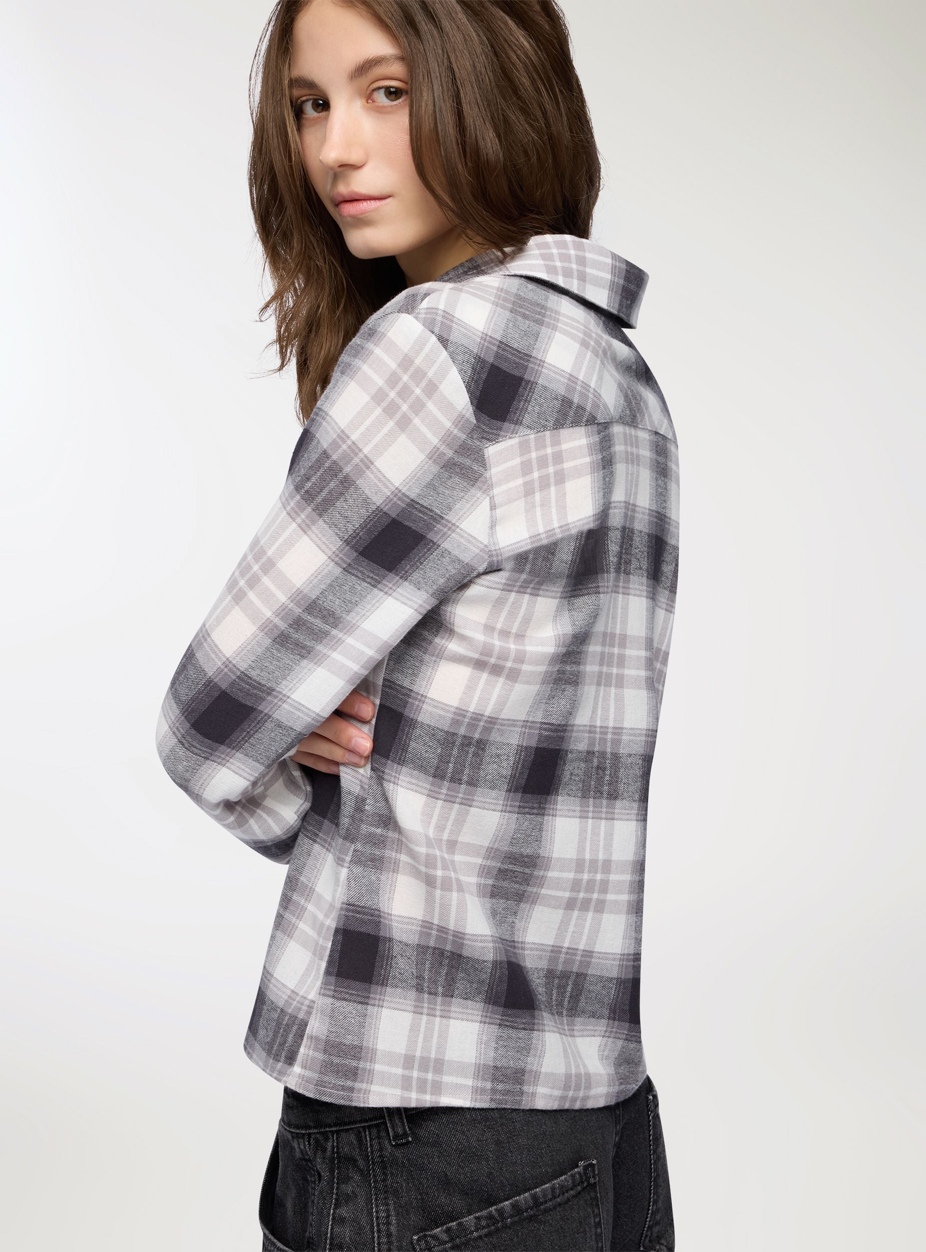 Koszula damska w kratę z klasycznym kołnierzykiem i długimi rękawami, zaprojektowana z myślą o casualowym i miejskim stylu. Zapięcie z przodu na widoczne guziki oraz dwie naszywane kieszonki na piersi z patką i guzikiem. Ramiona i tylny karczek z ukośnym wzorem podkreślającym linię, regularny krój i standardowa długość, idealna do noszenia rozpięta na koszulce lub włożona do jeansów i spódnic.Szczegóły