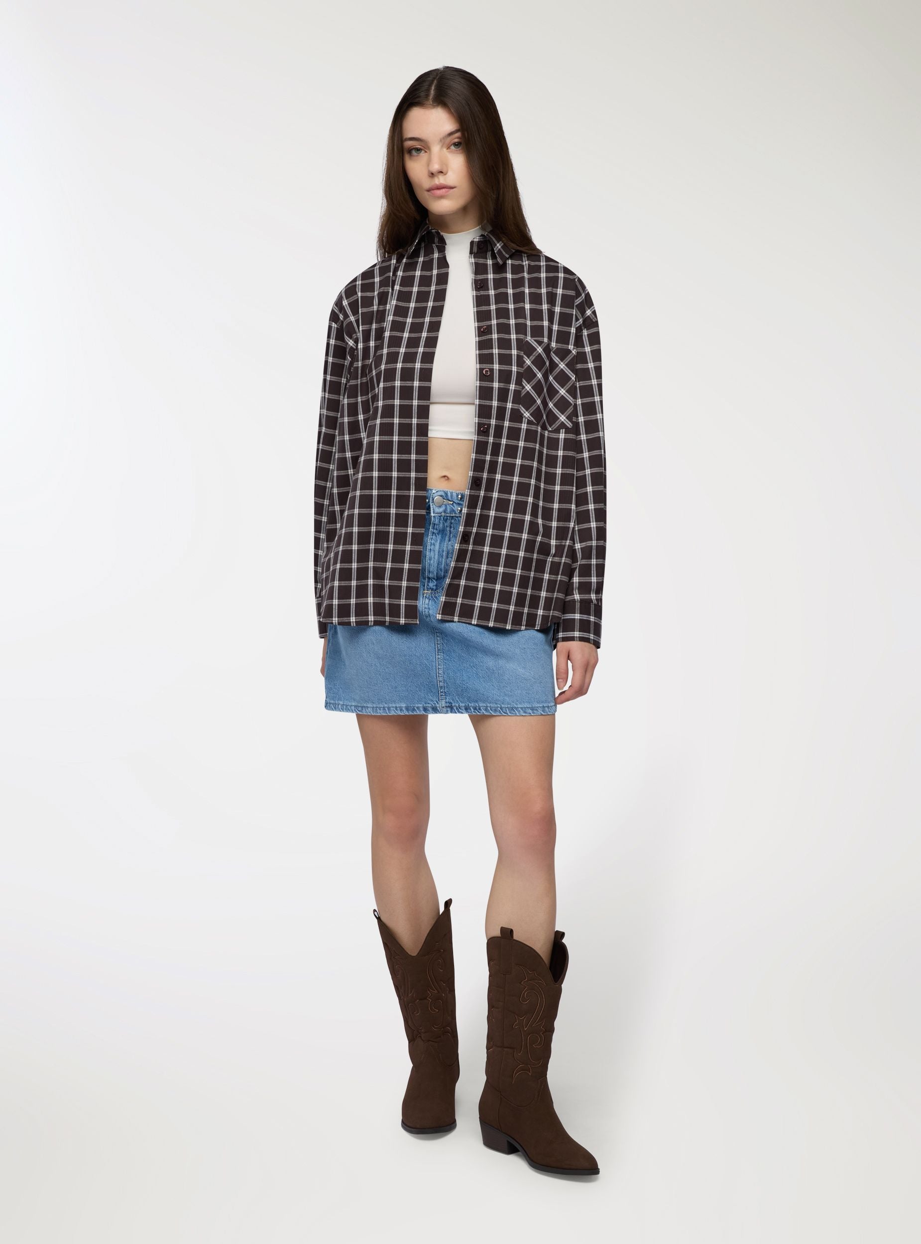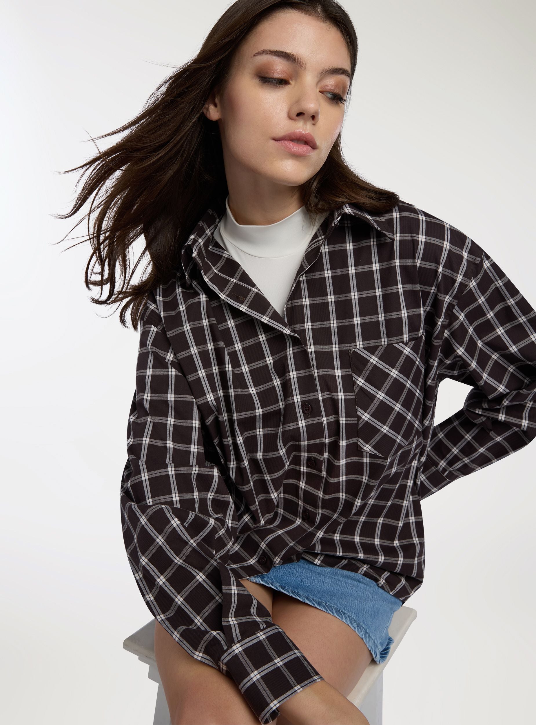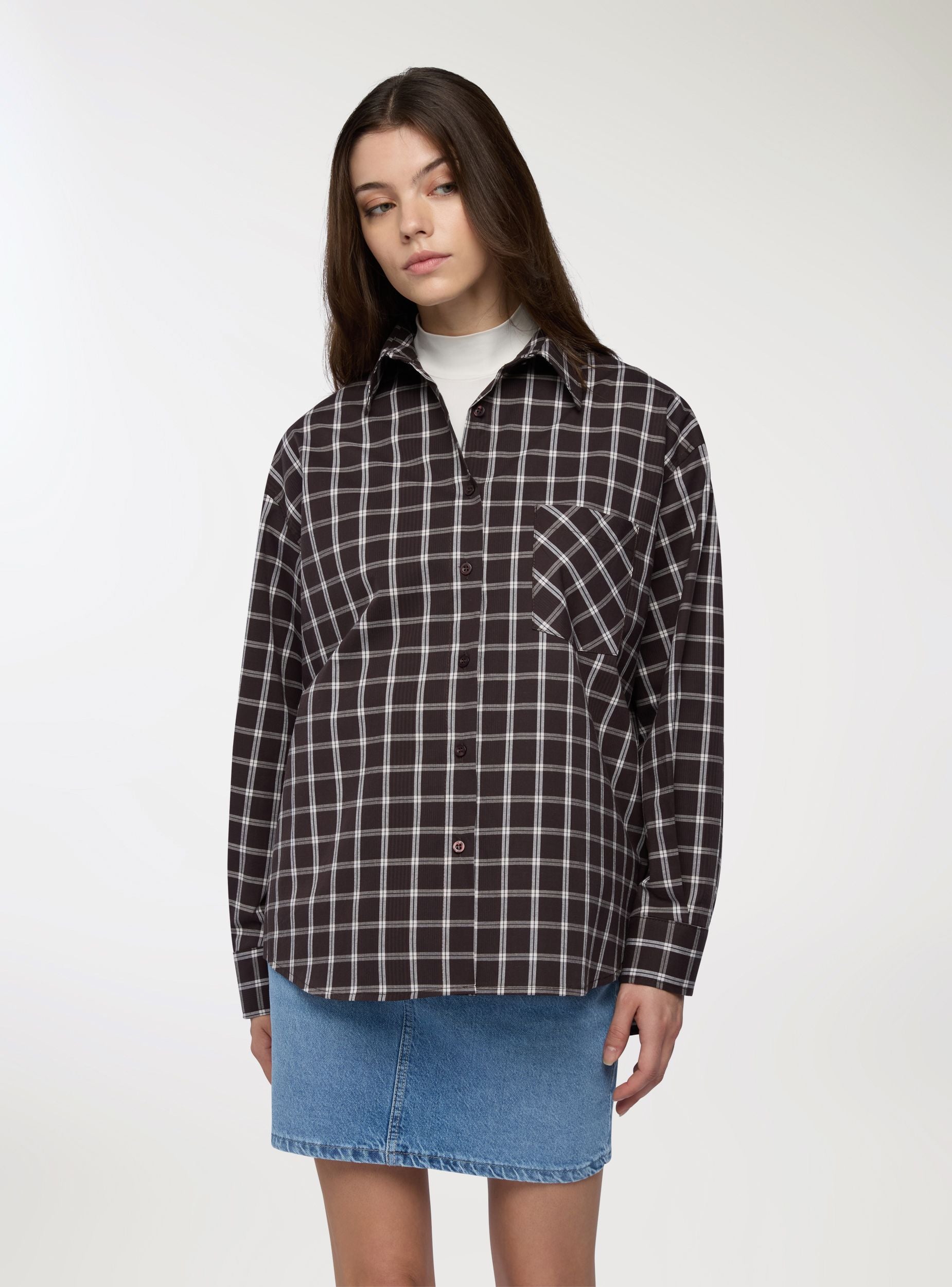 Koszula damska w kratę o luźnym kroju oversize, idealna na casualowe lub miejskie stylizacje. Klasyczny kołnierzyk, długie rękawy z mankietami oraz zapięcie na guziki z przodu. Kieszonka naszywana na piersi, która dodaje charakteru. Doskonała do jeansów lub spodni cargo. Wzór w kratę sprawia, że strój jest wszechstronny – od dnia aż po wieczór.Szczegóły