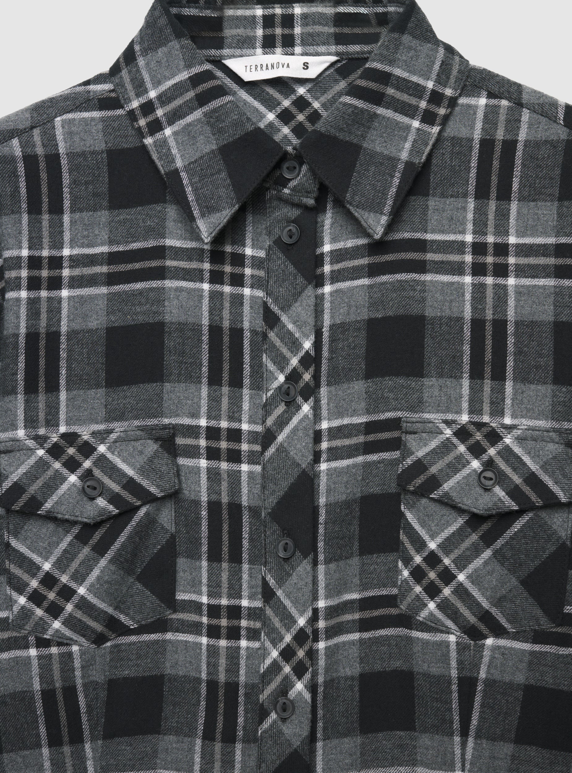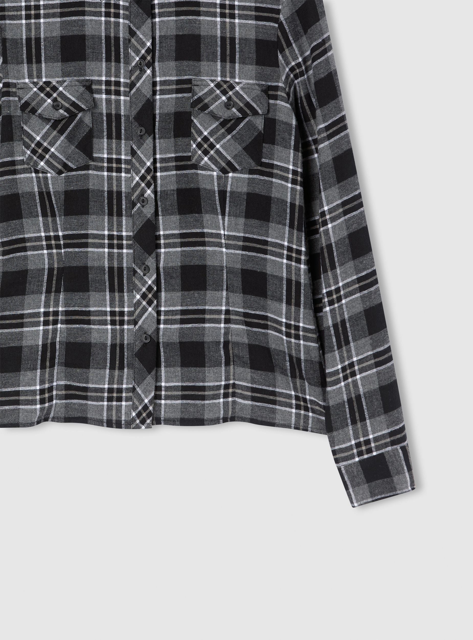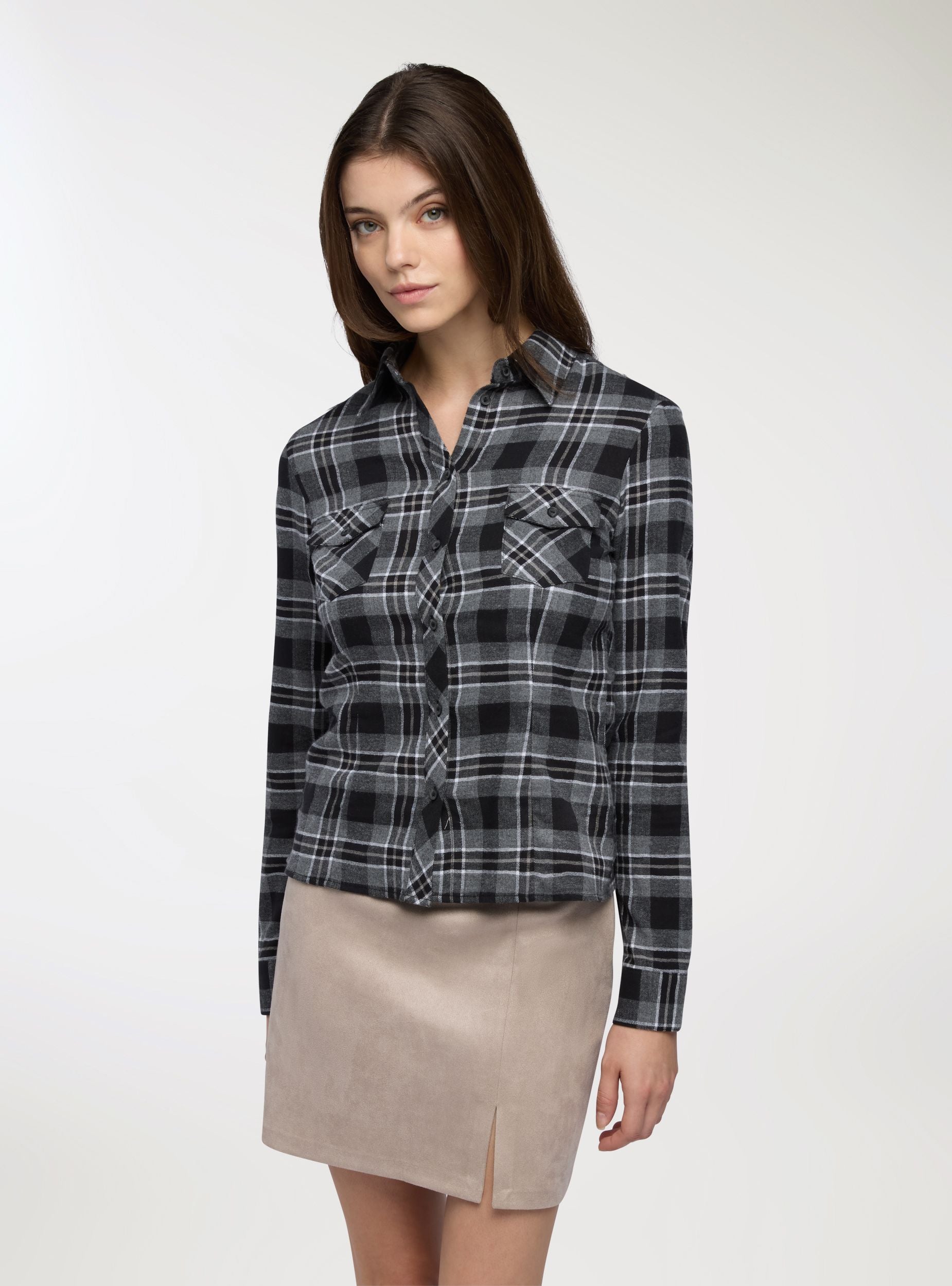 Damska koszula w kratę z klasycznym kołnierzykiem i długimi rękawami, zaprojektowana z myślą o casualowym i miejskim stylu. Zapięcie z przodu na widoczne guziki oraz dwie naszywane kieszonki na piersi z patką i guzikiem. Ramiona i tylna część z przeszyciem diagonalnym podkreślającym linię, regularny krój i standardowa długość, idealna do noszenia rozpięta na t-shirt lub wsunięta w jeansy czy spódnice.