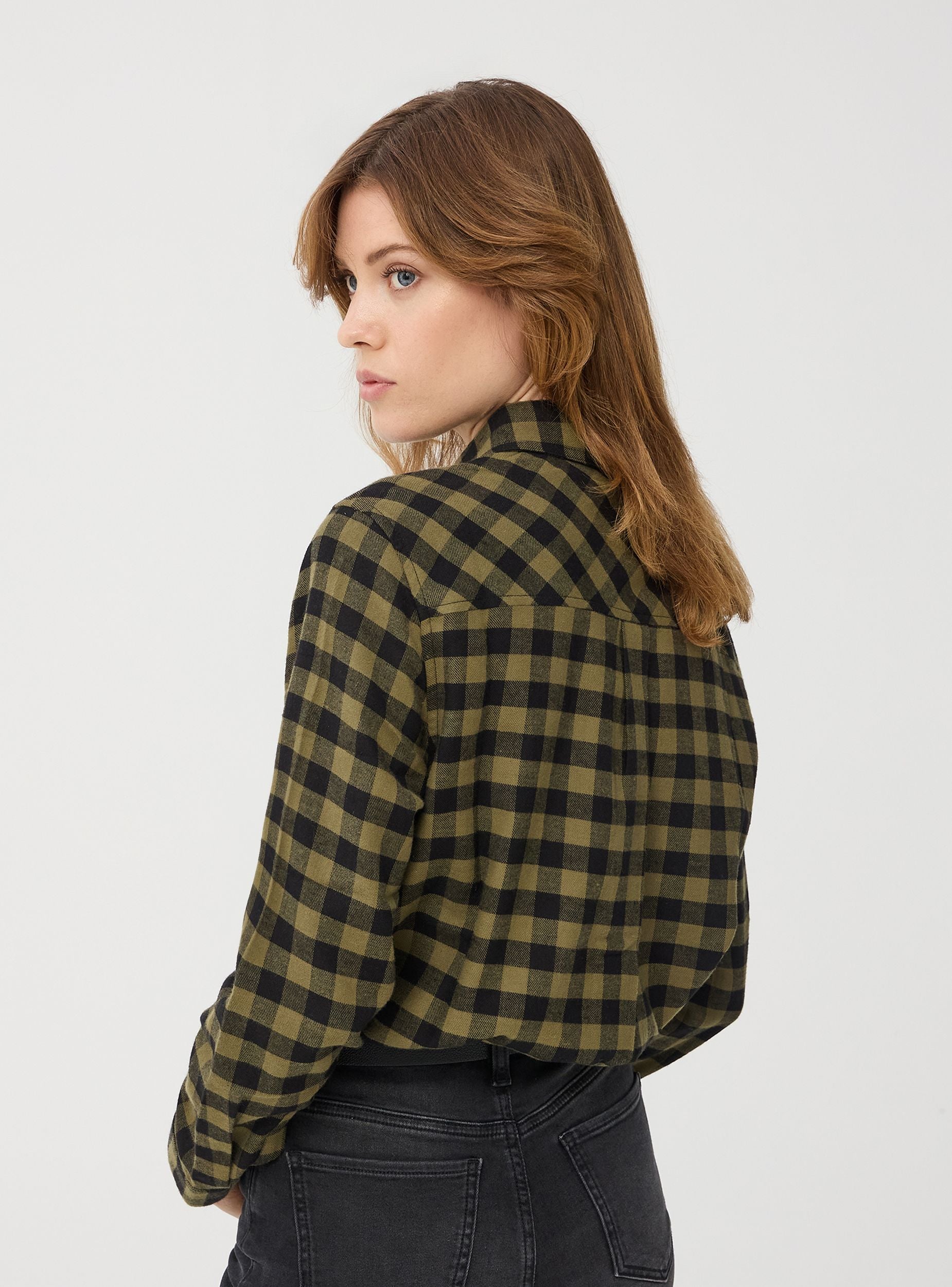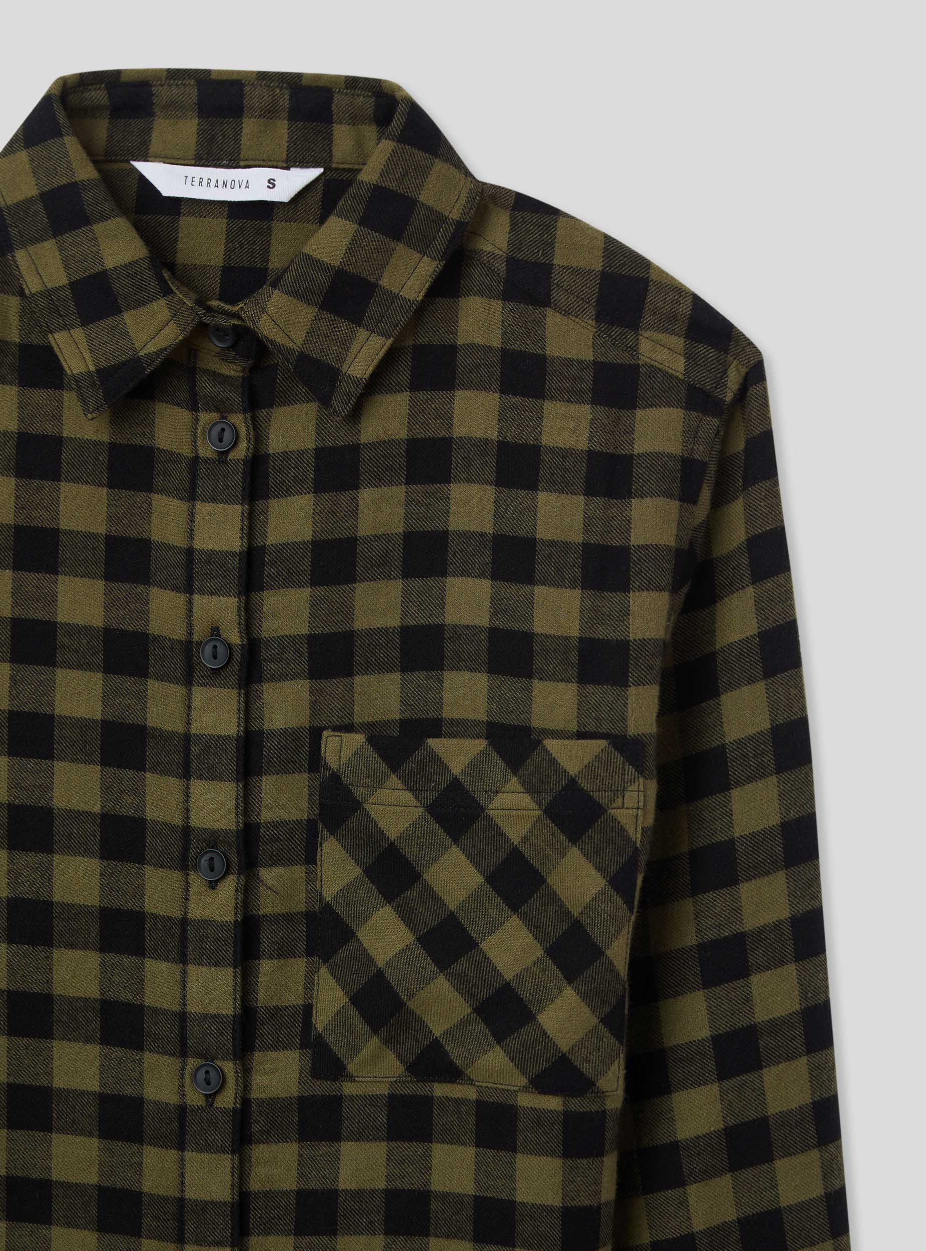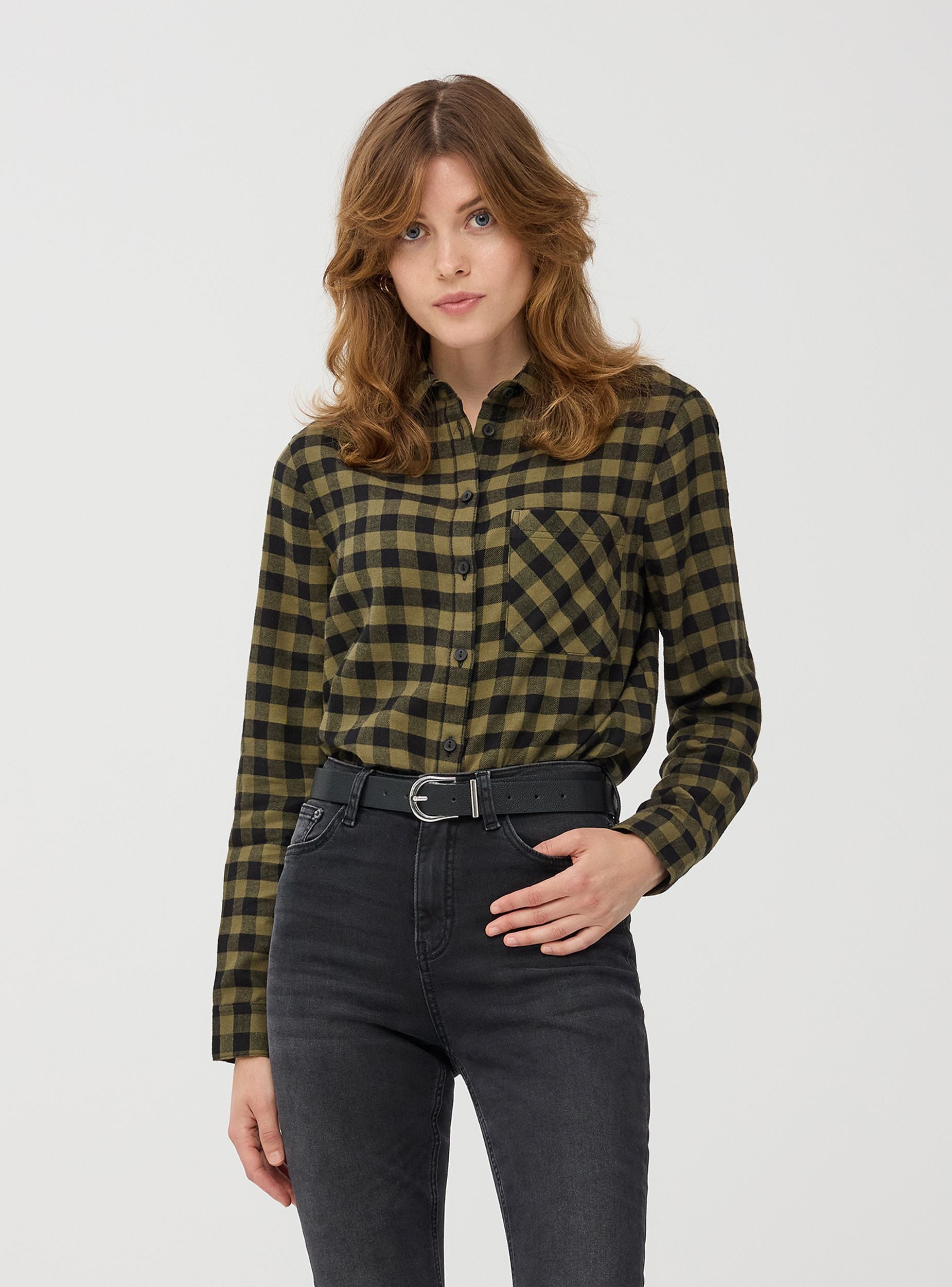 Koszula damska z flaneli w kratę, ma zapięcie z przodu na guziki. Koszula ma klasyczny kołnierzyk i kieszonkę na piersi. Długie rękawy kończą się zapięciem na mankietach. Koszula oferuje wygodne dopasowanie i jest odpowiednia na sezon zimowy.Szczegóły