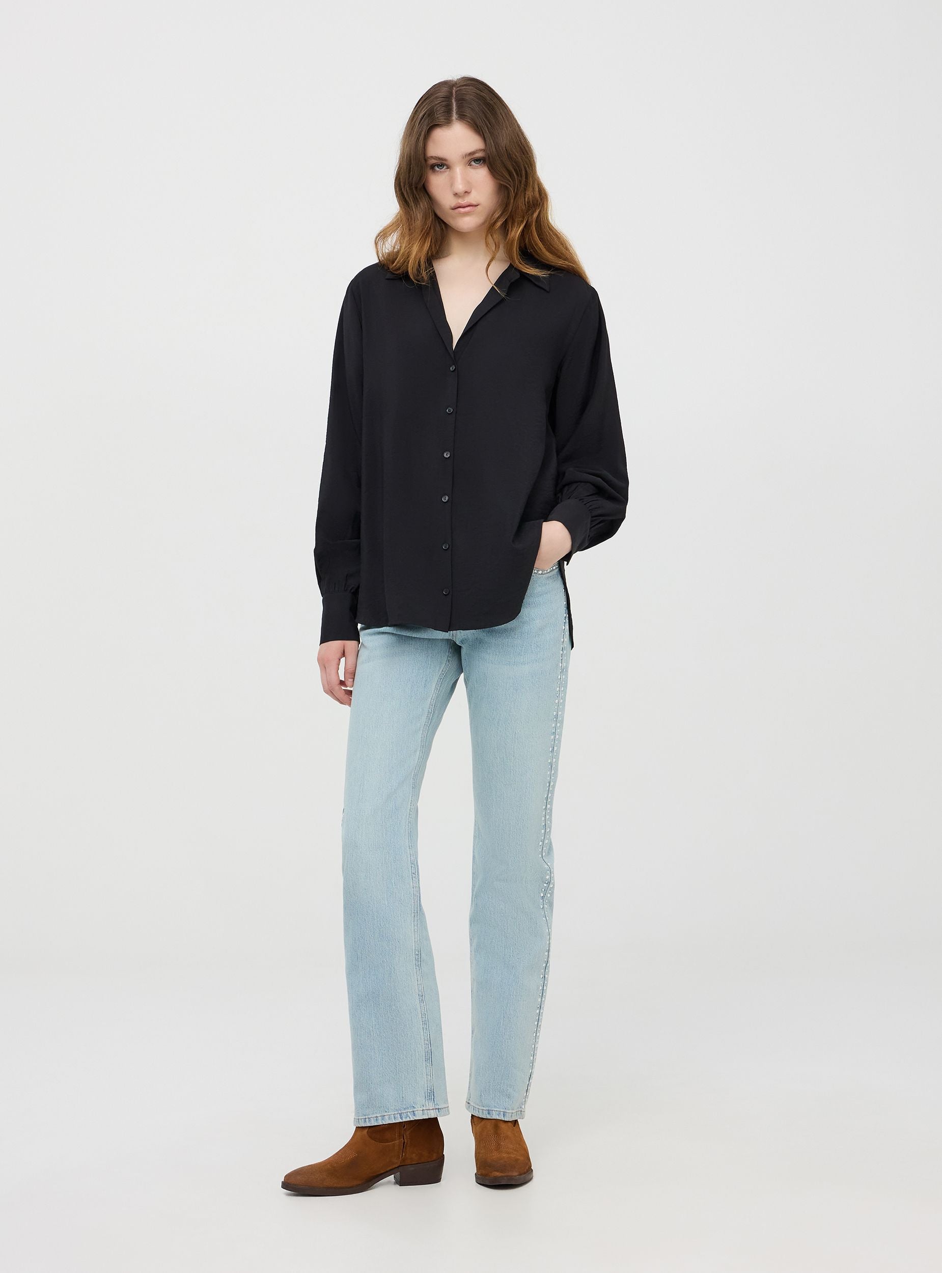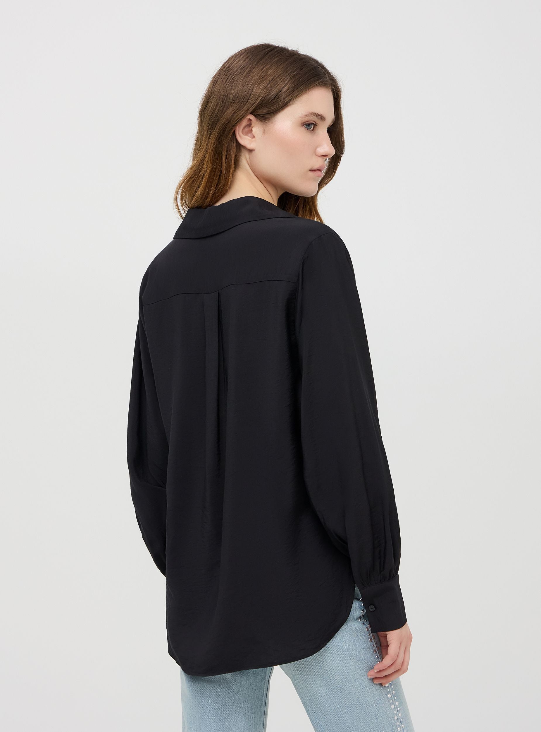 Koszula damska idealna do eleganckiego i wyrafinowanego wyglądu. Detale obejmują guziki w tym samym kolorze, kołnierz z dekoltem w serek oraz szerokie rękawy regulowane z zapięciem na guziki. Krój jest lekko luźny dla optymalnego komfortu, idealny na okazje casualowe lub dni w biurze.Szczegóły