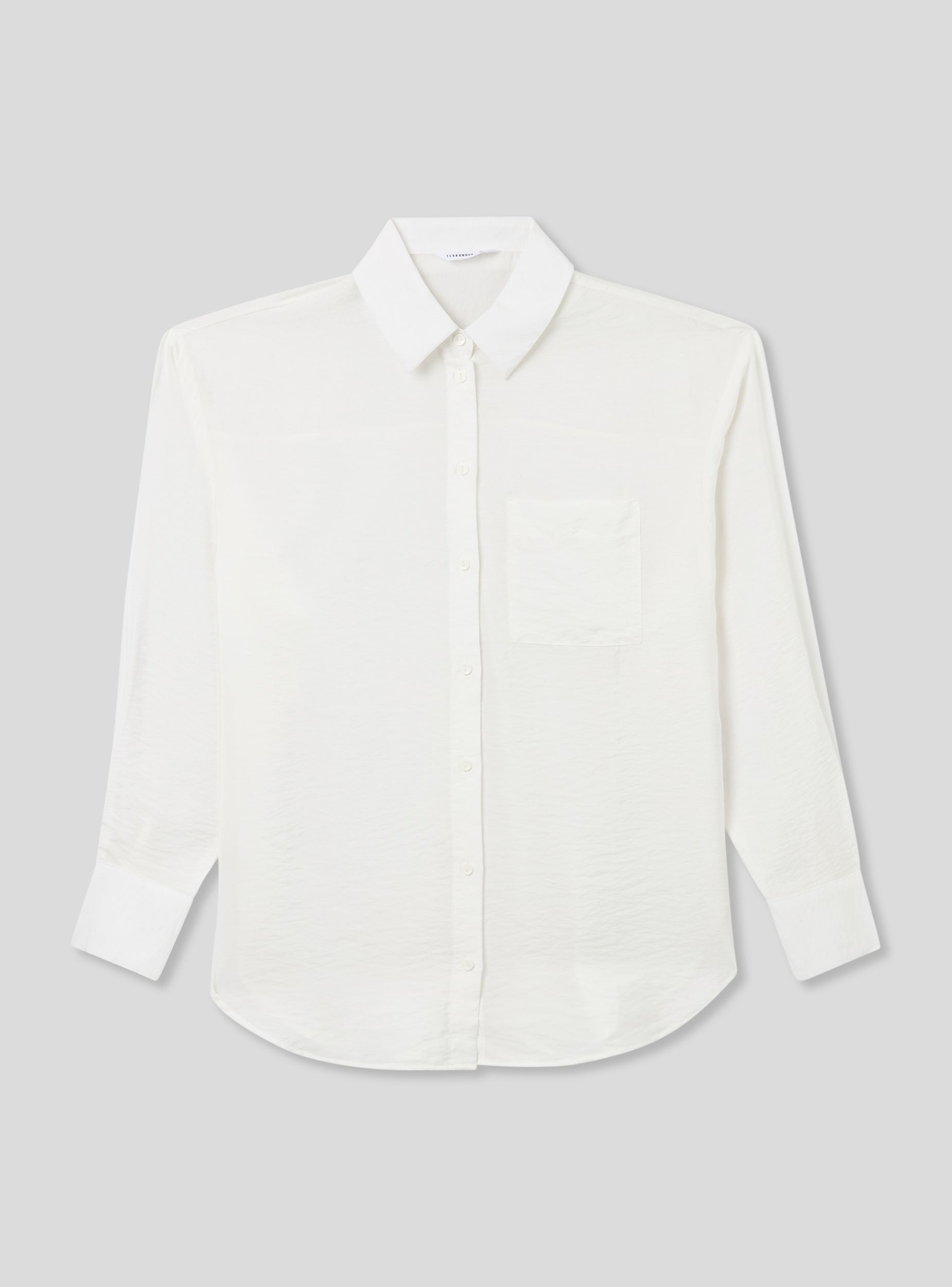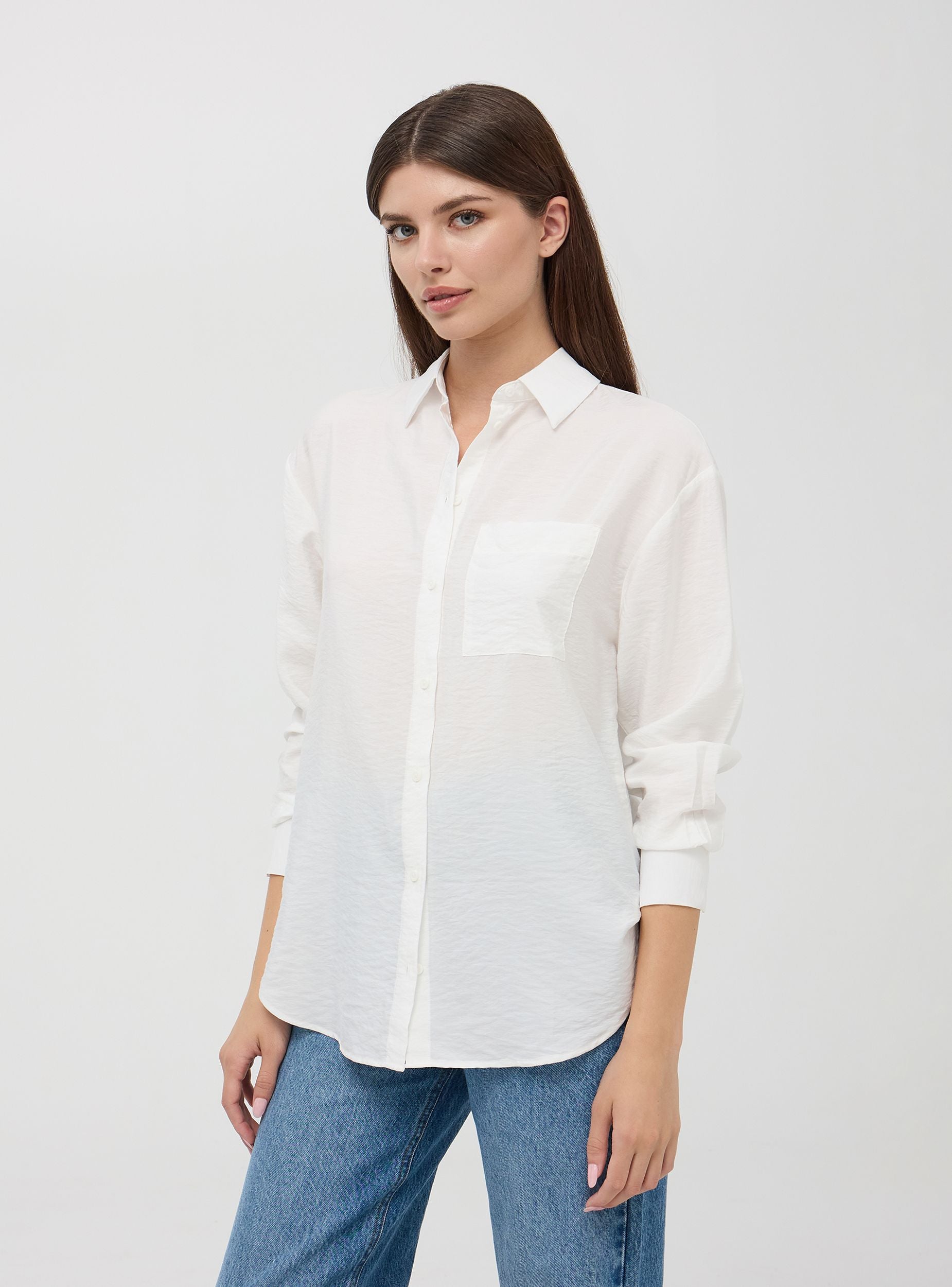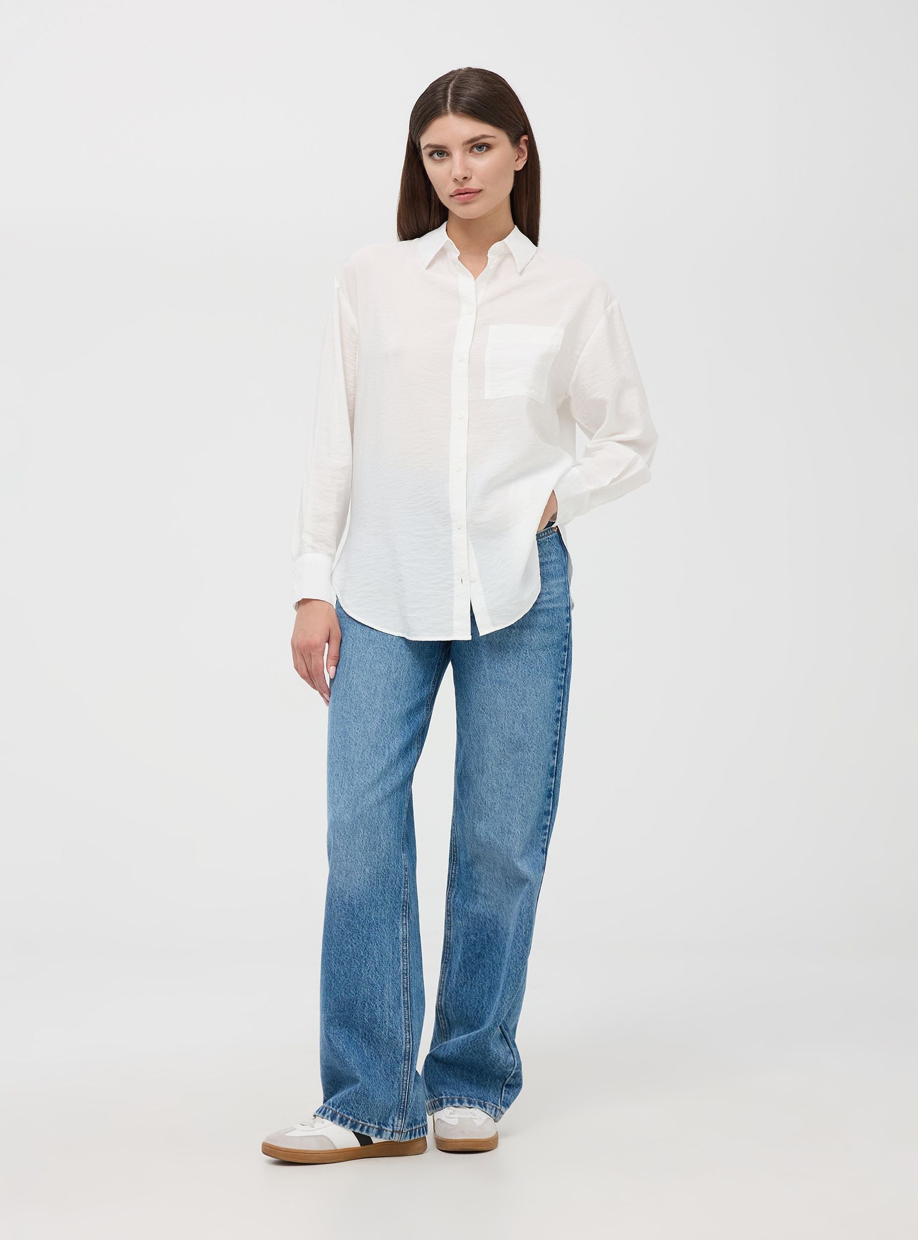 Koszula z długim rękawem wykonana z mieszanki wiskozy. Posiada klasyczny kołnierzyk, kieszonkę po lewej stronie klatki piersiowej oraz zapięcie z przodu na guziki w tym samym kolorze. Dopasowanie jest wygodne i luźne, odpowiednie do kontekstów casualowych i formalnych.