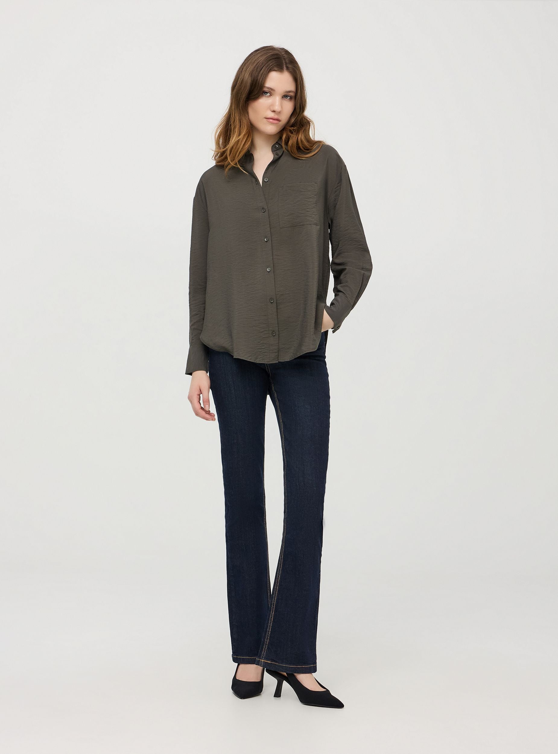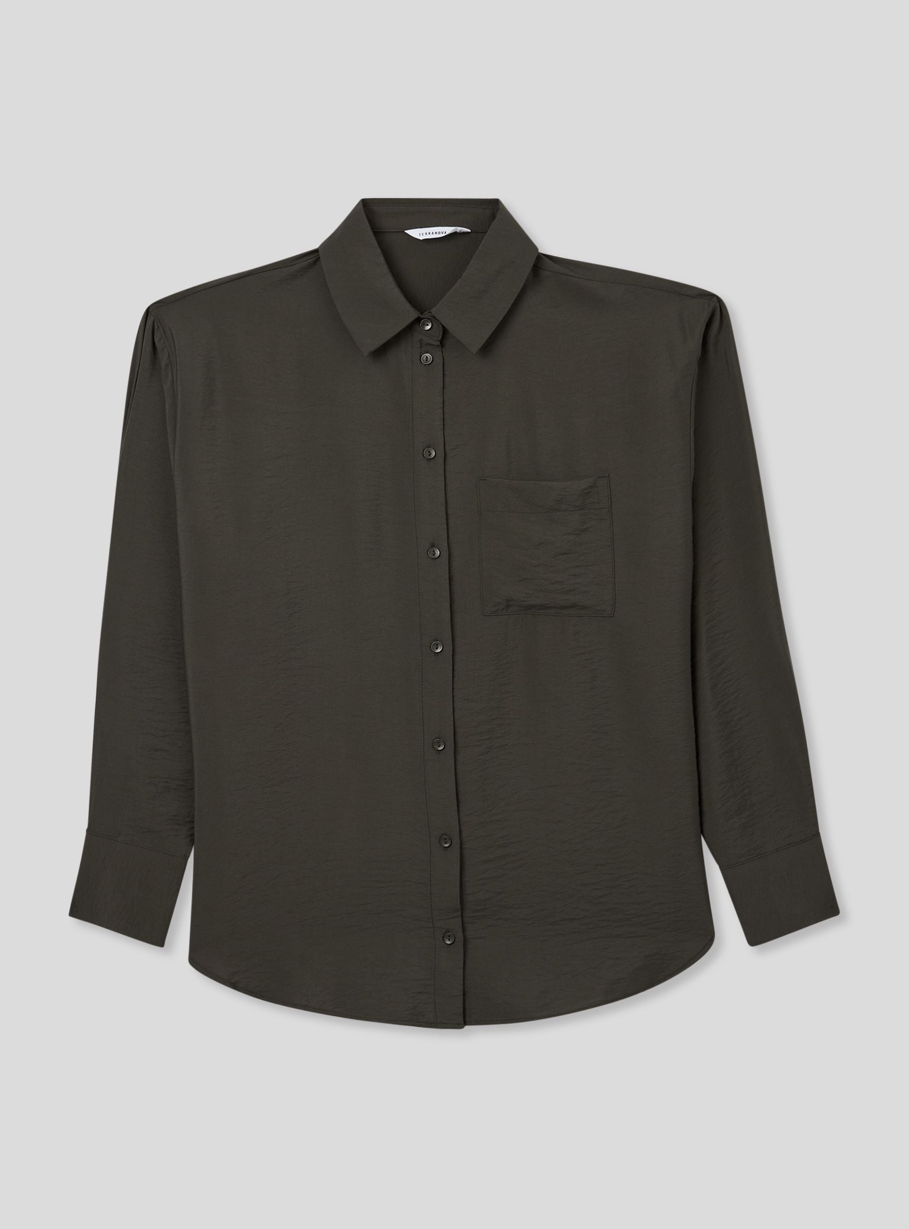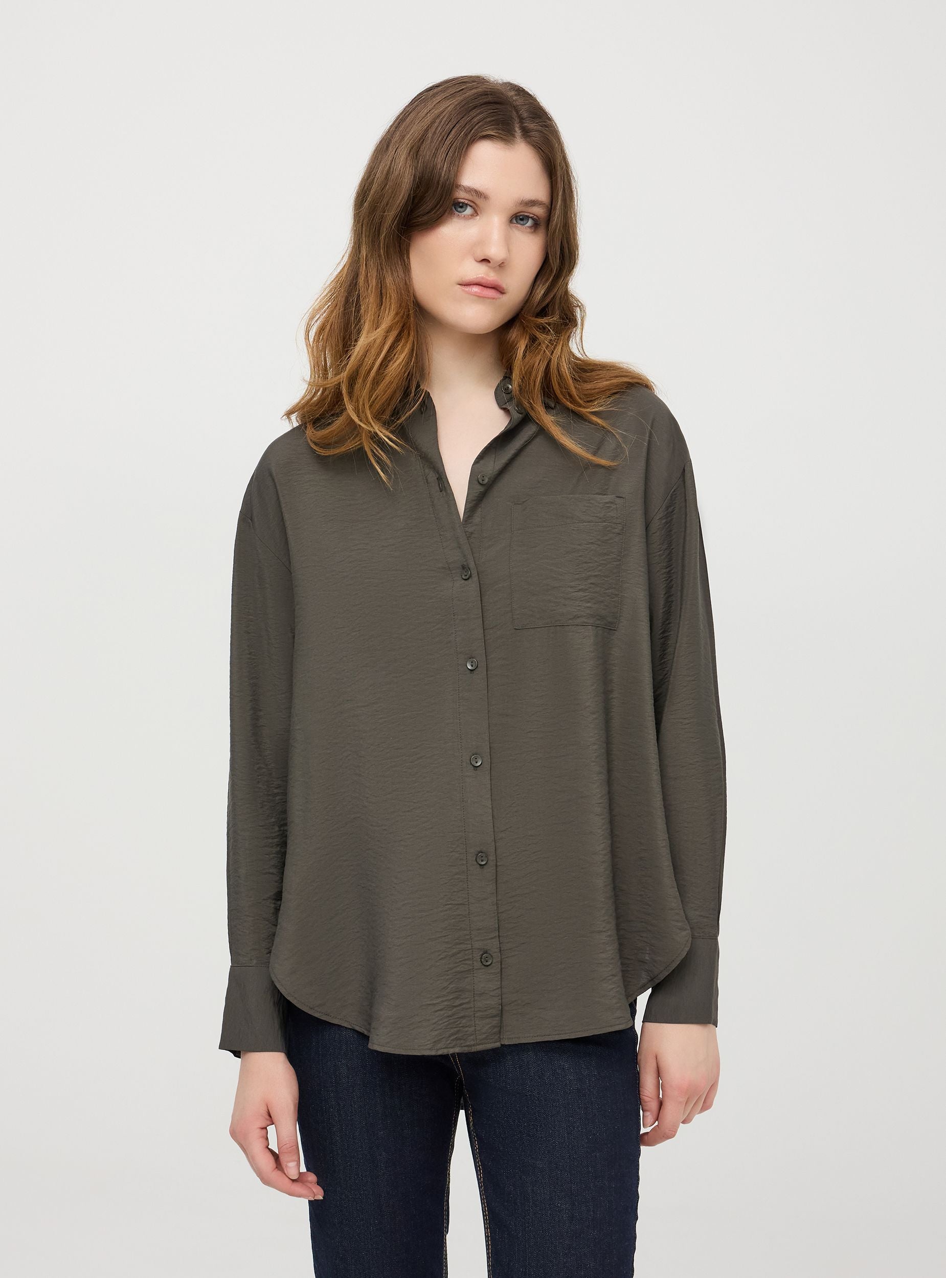 Koszula z długim rękawem wykonana z mieszanki wiskozy. Posiada klasyczny kołnierzyk, kieszonkę po lewej stronie klatki piersiowej oraz zapięcie z przodu na guziki w tym samym kolorze. Fason jest wygodny i luźny, odpowiedni do casualowych i formalnych kontekstów.