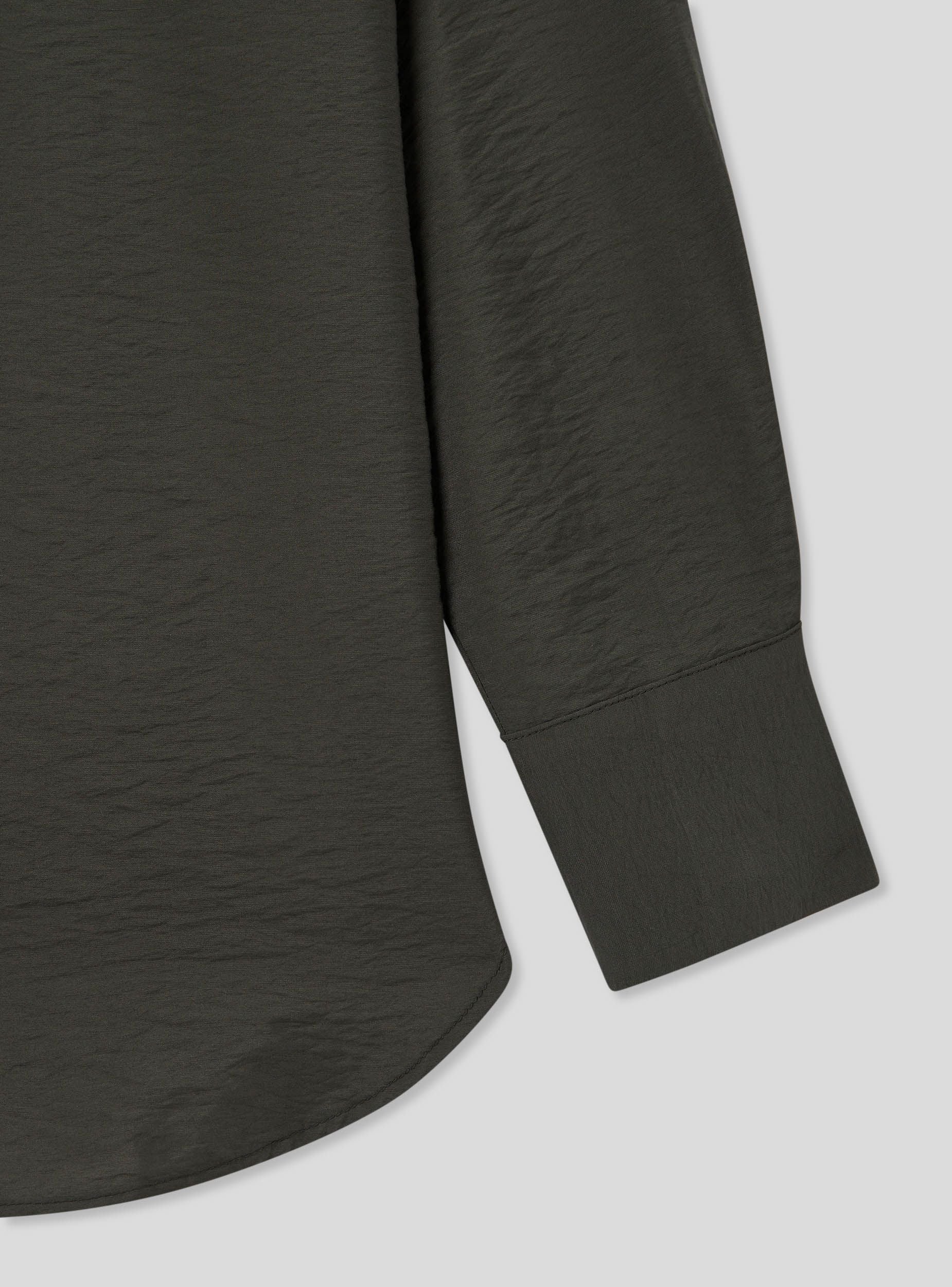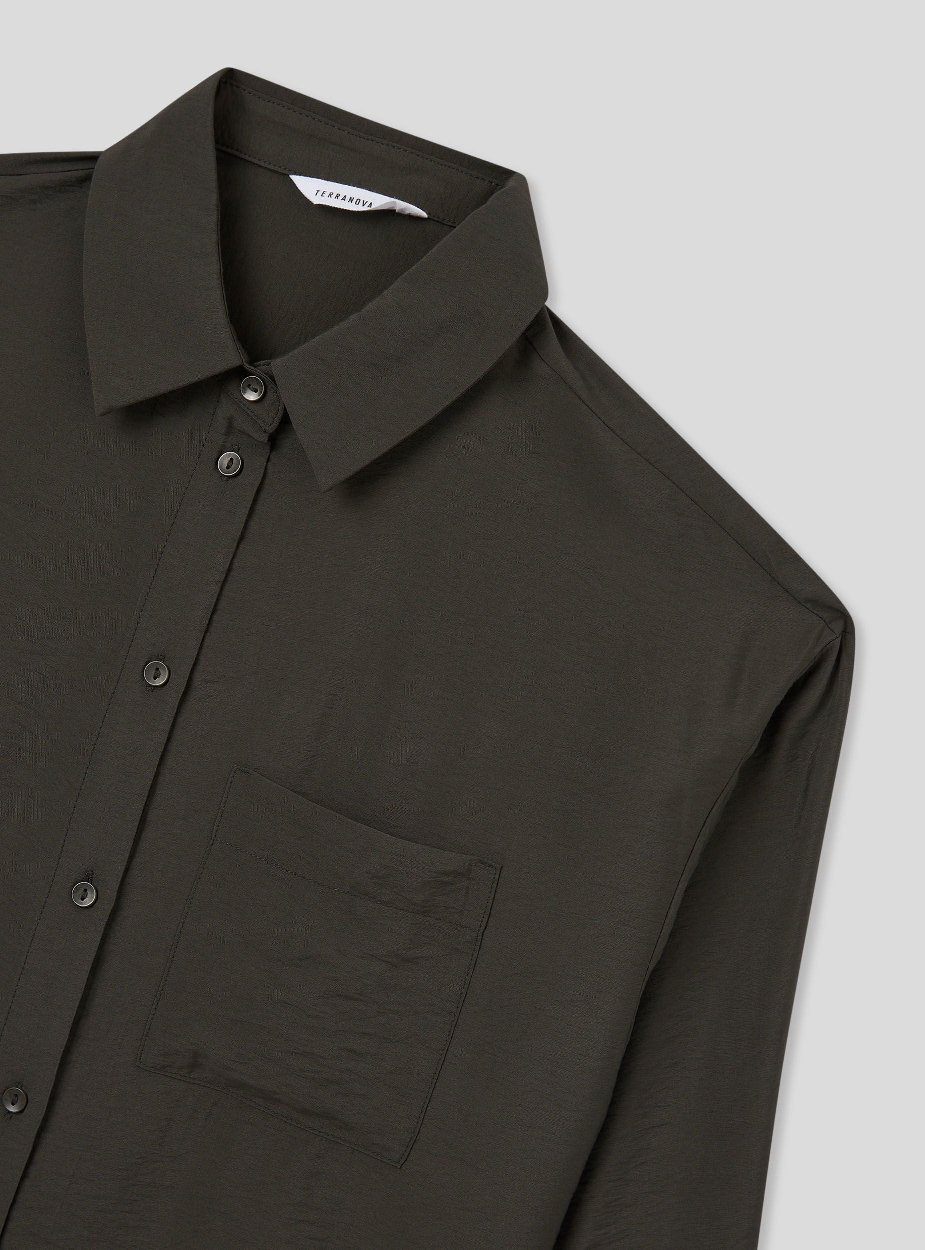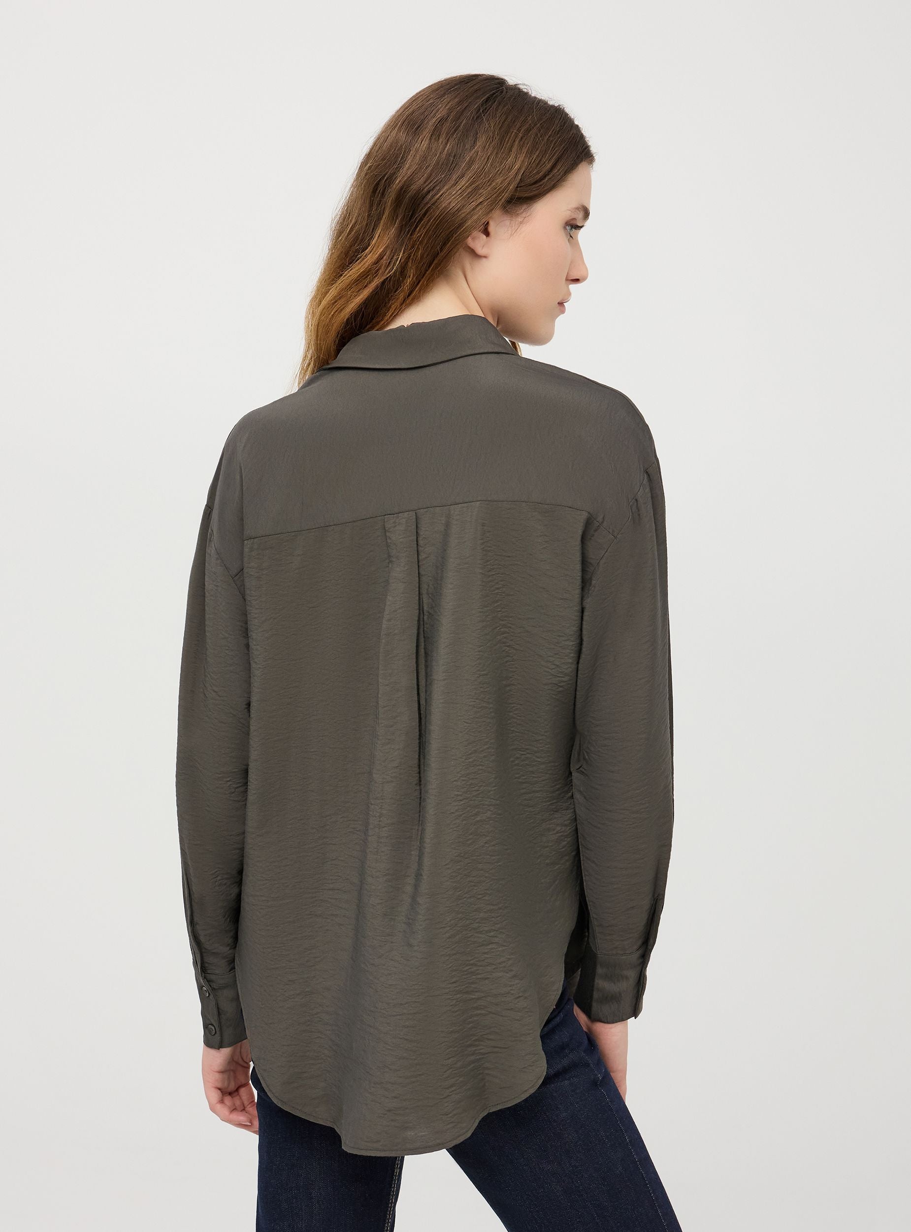 Koszula z długim rękawem wykonana z mieszanki wiskozy. Posiada klasyczny kołnierzyk, kieszonkę po lewej stronie klatki piersiowej oraz zapięcie z przodu na guziki w tym samym kolorze. Fason jest wygodny i luźny, odpowiedni do casualowych i formalnych kontekstów.