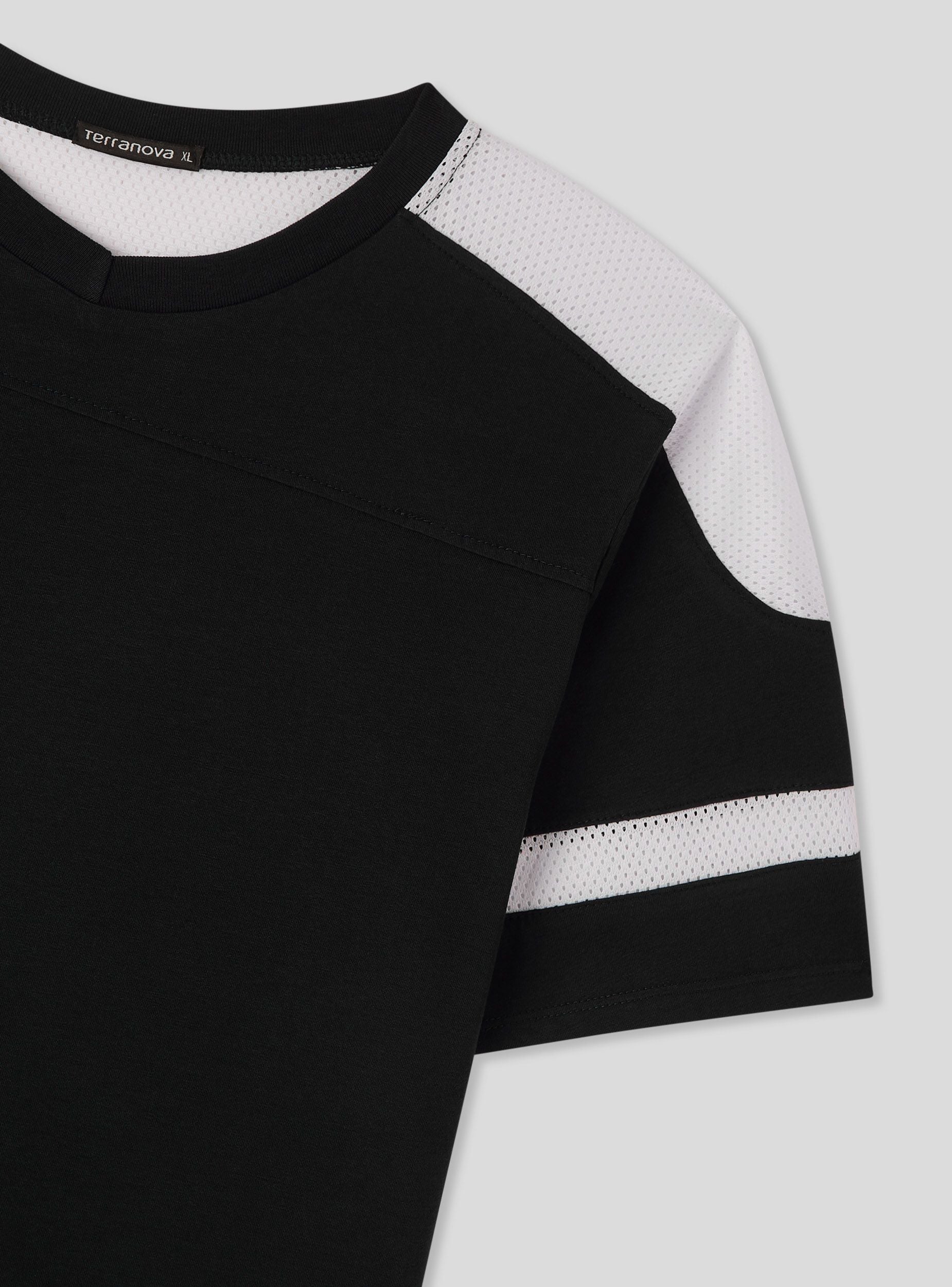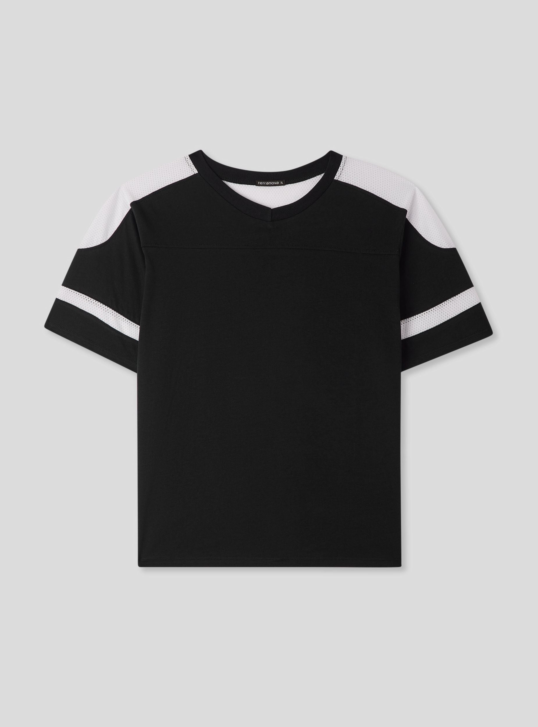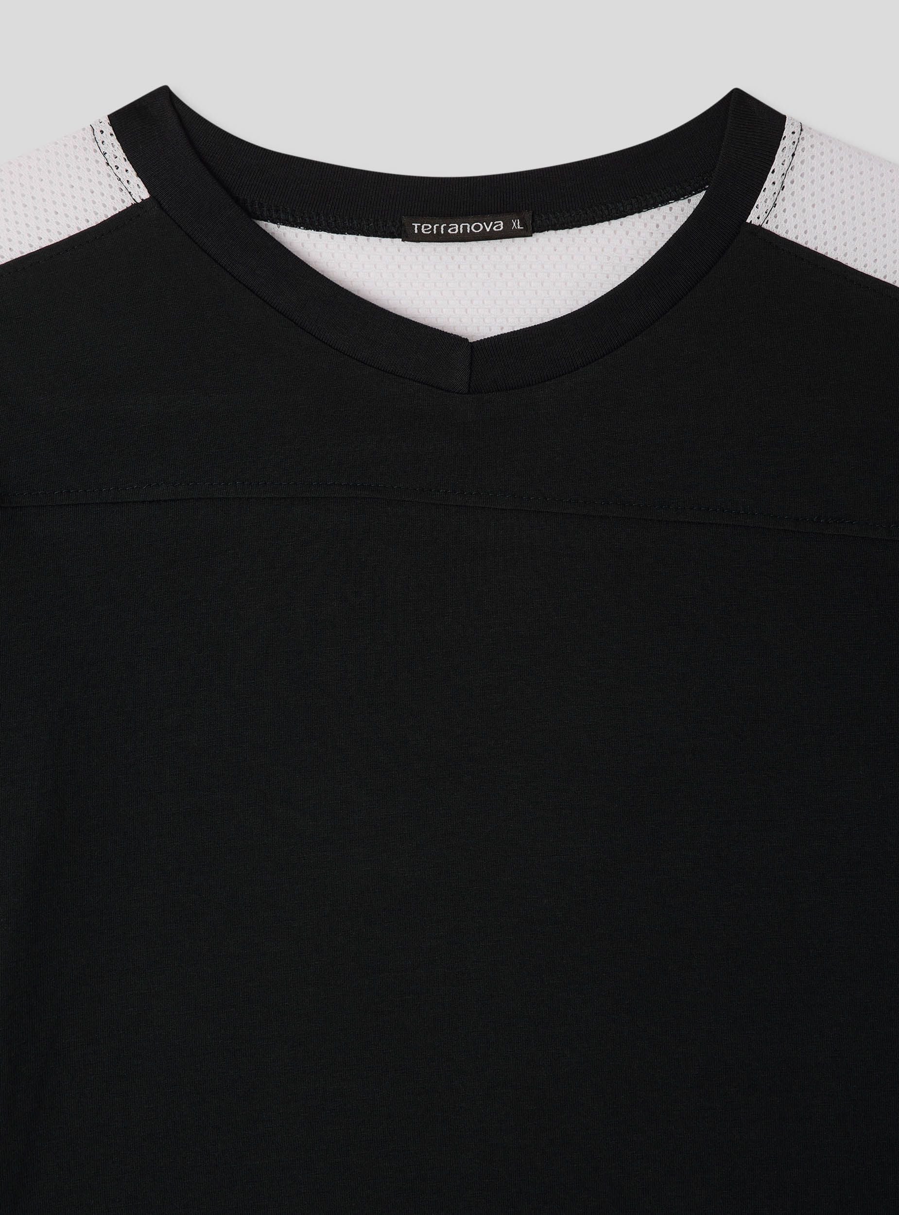 Męska koszulka z nowoczesnym i sportowym designem. Posiada regularny krój z dekoltem w serek i krótkimi rękawami. Wstawki z siateczki na ramionach i rękawach dodają dynamicznego i oddychającego charakteru, idealnego do aktywności rekreacyjnych lub sportowych. Doskonała do zestawienia z sportowymi spodniami lub jeansami, tworząc wszechstronny i wygodny wygląd.Szczegóły