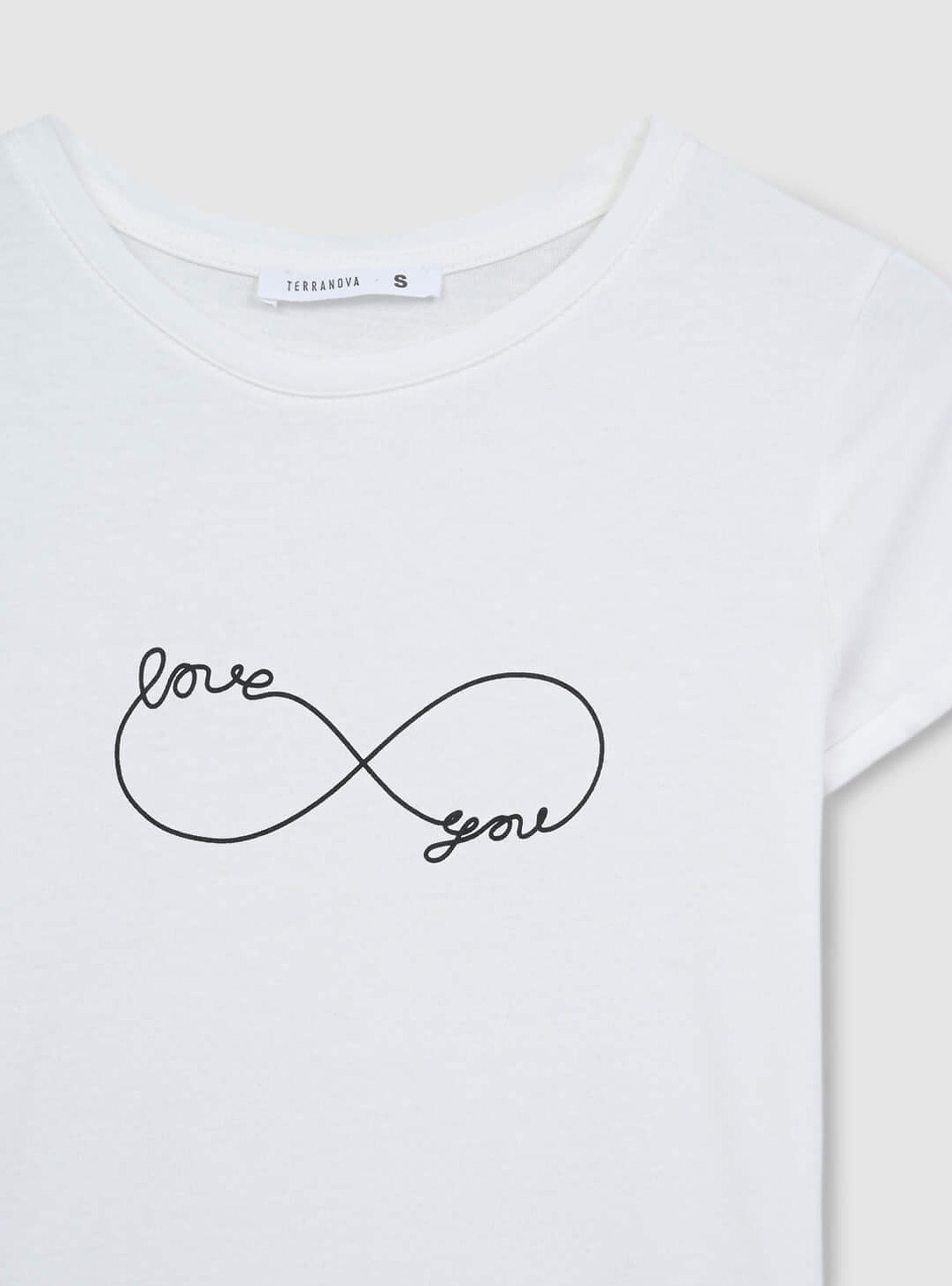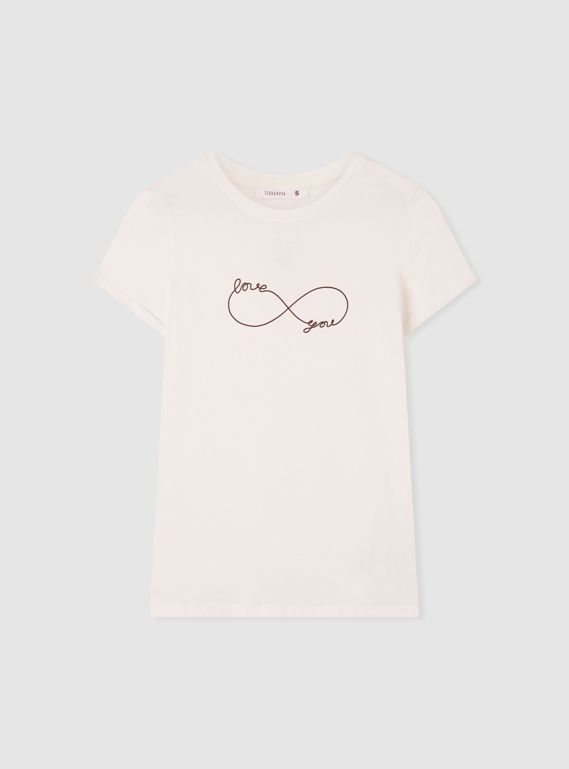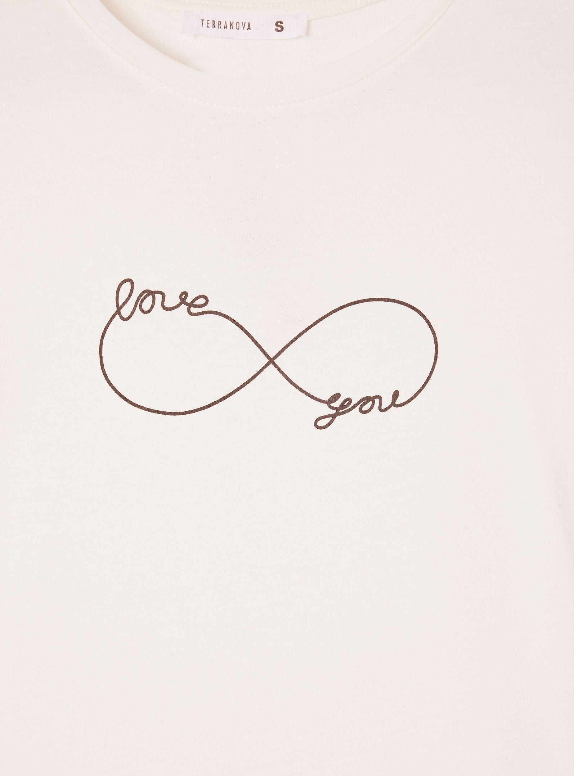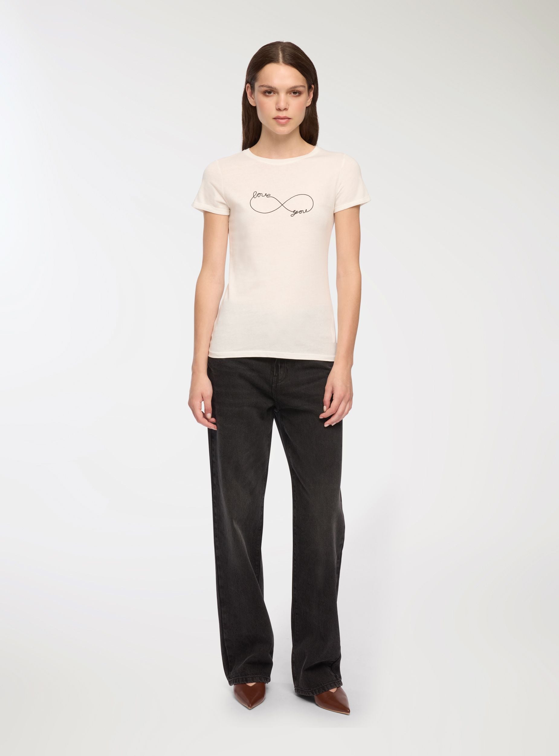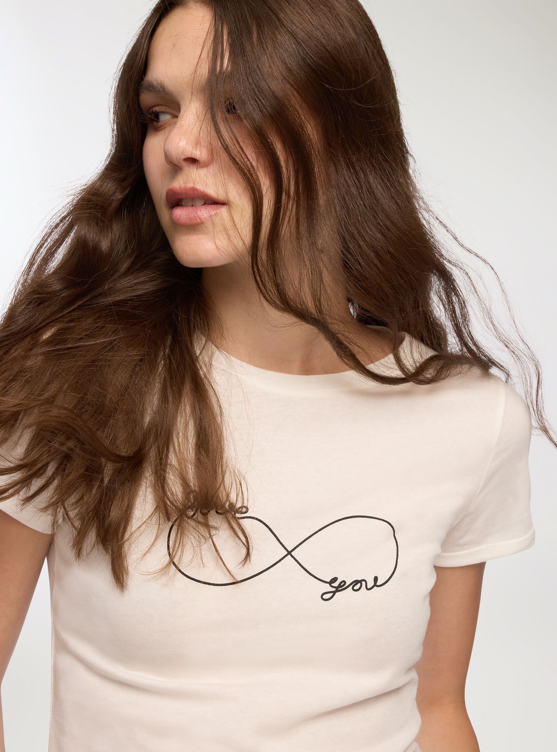 Koszulka damska z nadrukiem w nieskończoność z napisem "love you", idealna na casualowy i wszechstronny look. Doskonała do dodania romantycznego akcentu do stylizacji. Ta t-shirt oferuje nowoczesny i komfortowy design. Slim fit podkreśla sylwetkę, sprawiając, że nadaje się na różne okazje, od czasu wolnego po nieformalne wyjścia. Niezbędny element do wzbogacenia codziennej garderoby.Szczegóły