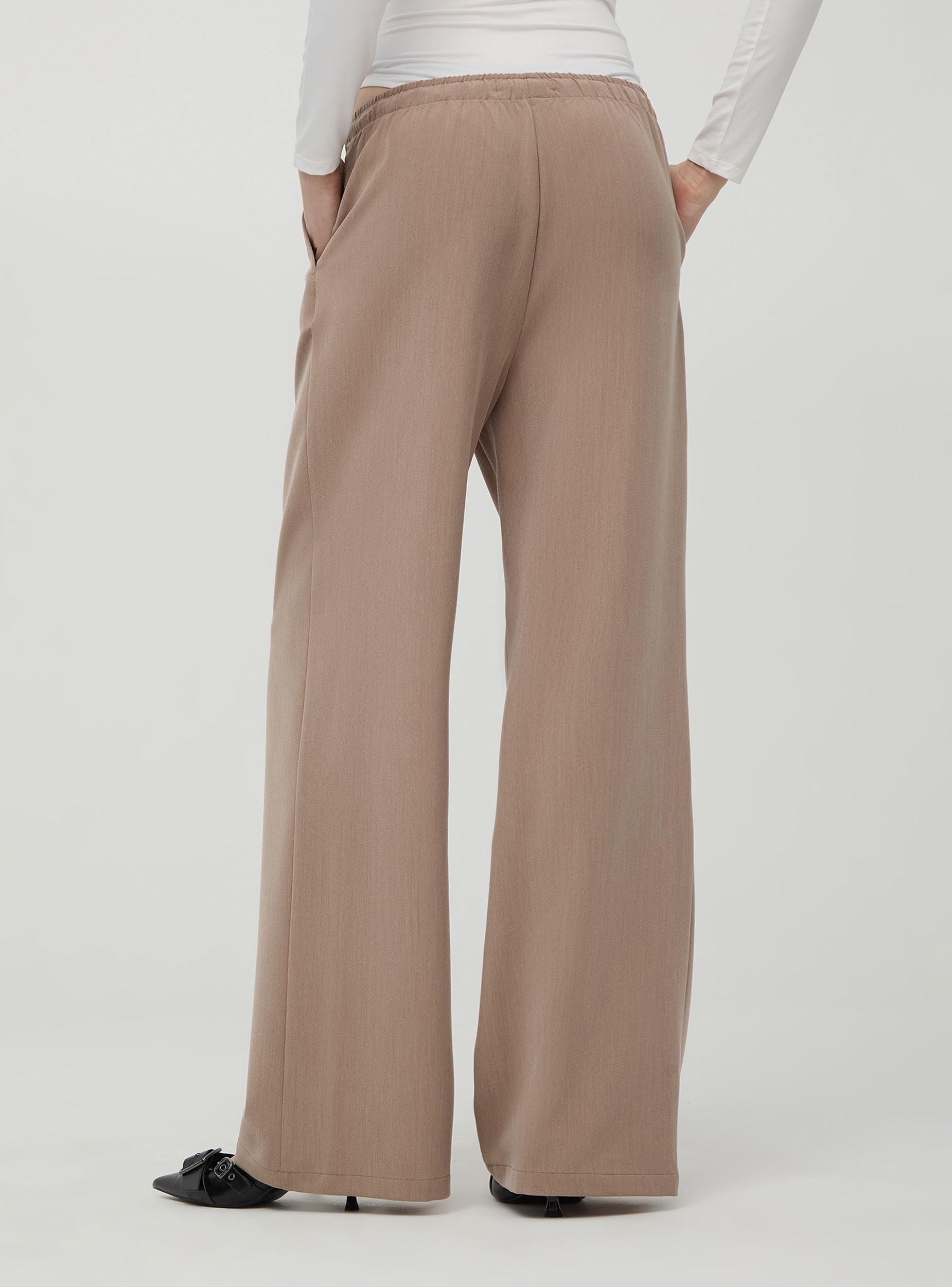 Spodnie damskie w modelu wide leg, z troczkami w talii i bocznymi kieszeniami. Wykonane z tkaniny poliwiskozowej z efektem melange. Element, który musi znaleźć się w każdej szafie, idealny do casualowego i wygodnego looku. Luźny krój.