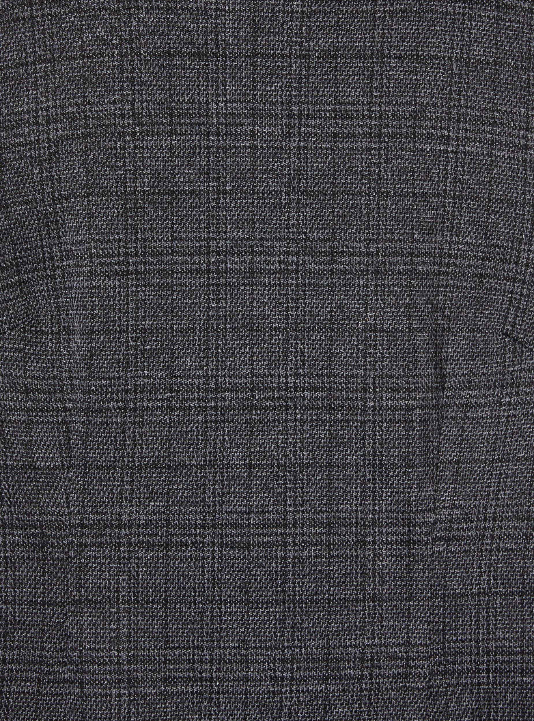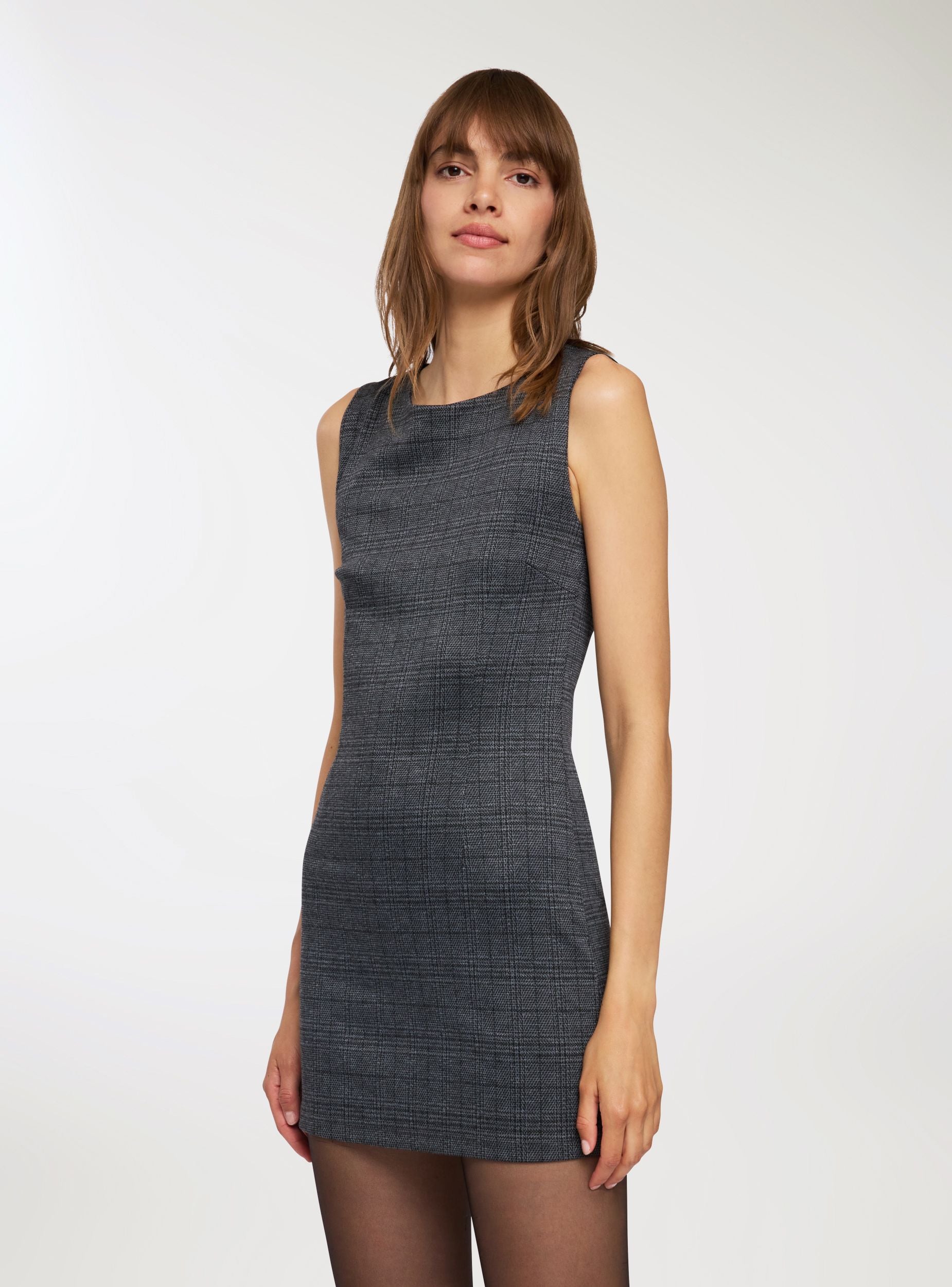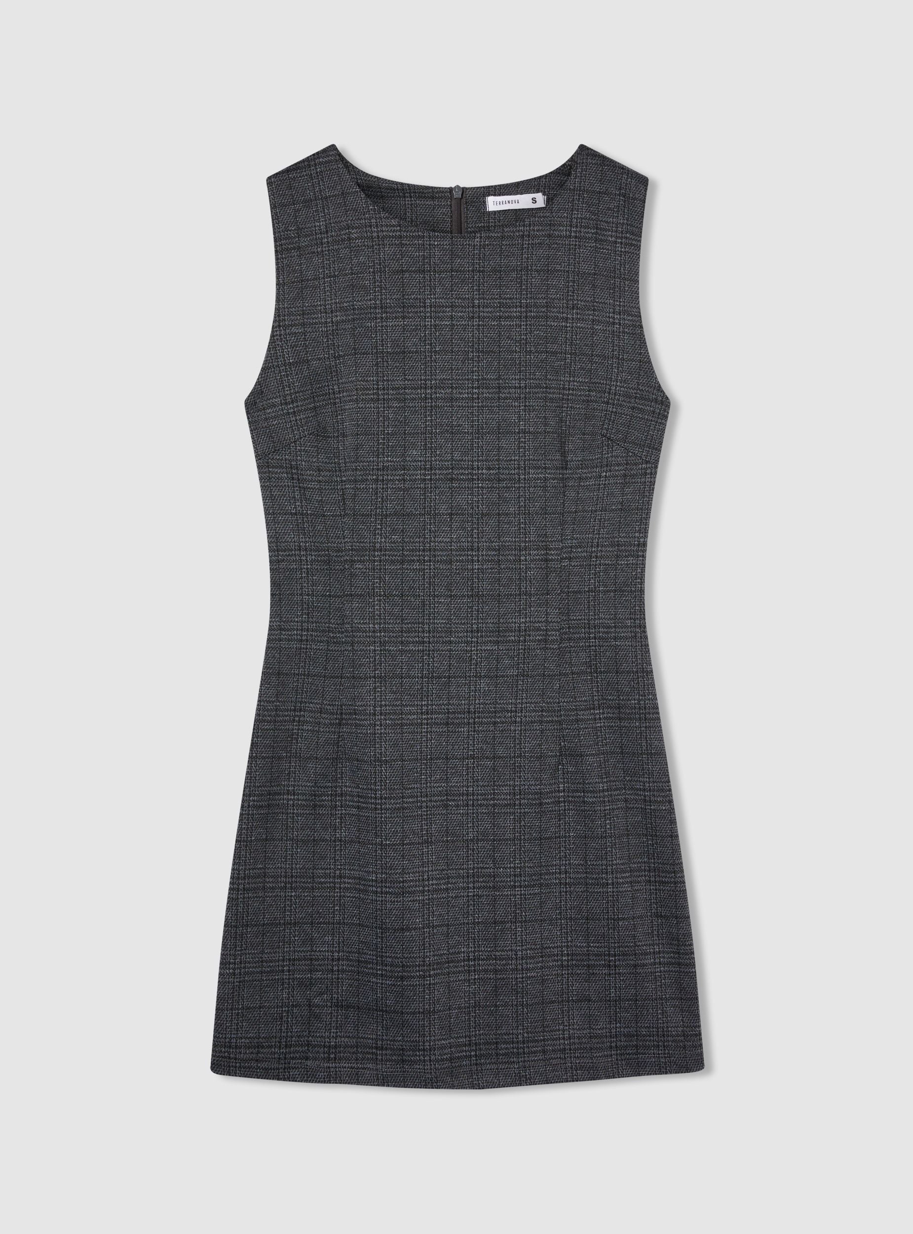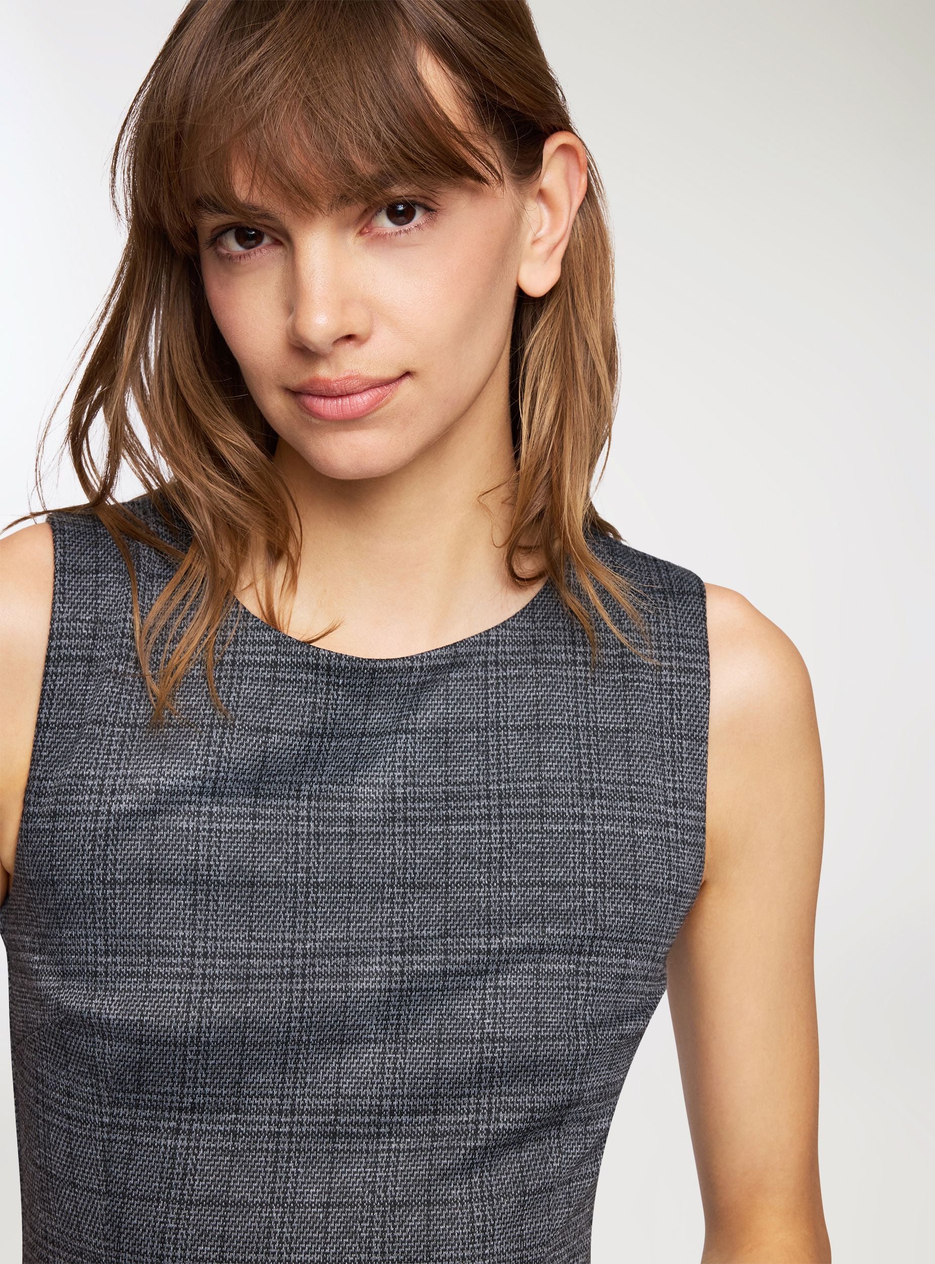 Sukienka damska o bezrękawowym kroju i dopasowanym fasonie. Posiada wzór w kratę, który sprawia, że jest idealna na formalne lub zawodowe okazje. Tylny zamek błyskawiczny zapewnia wygodę i praktyczność. Doskonała do zestawienia z marynarką i eleganckim obuwiem, tworząc wyrafinowany i nowoczesny look.